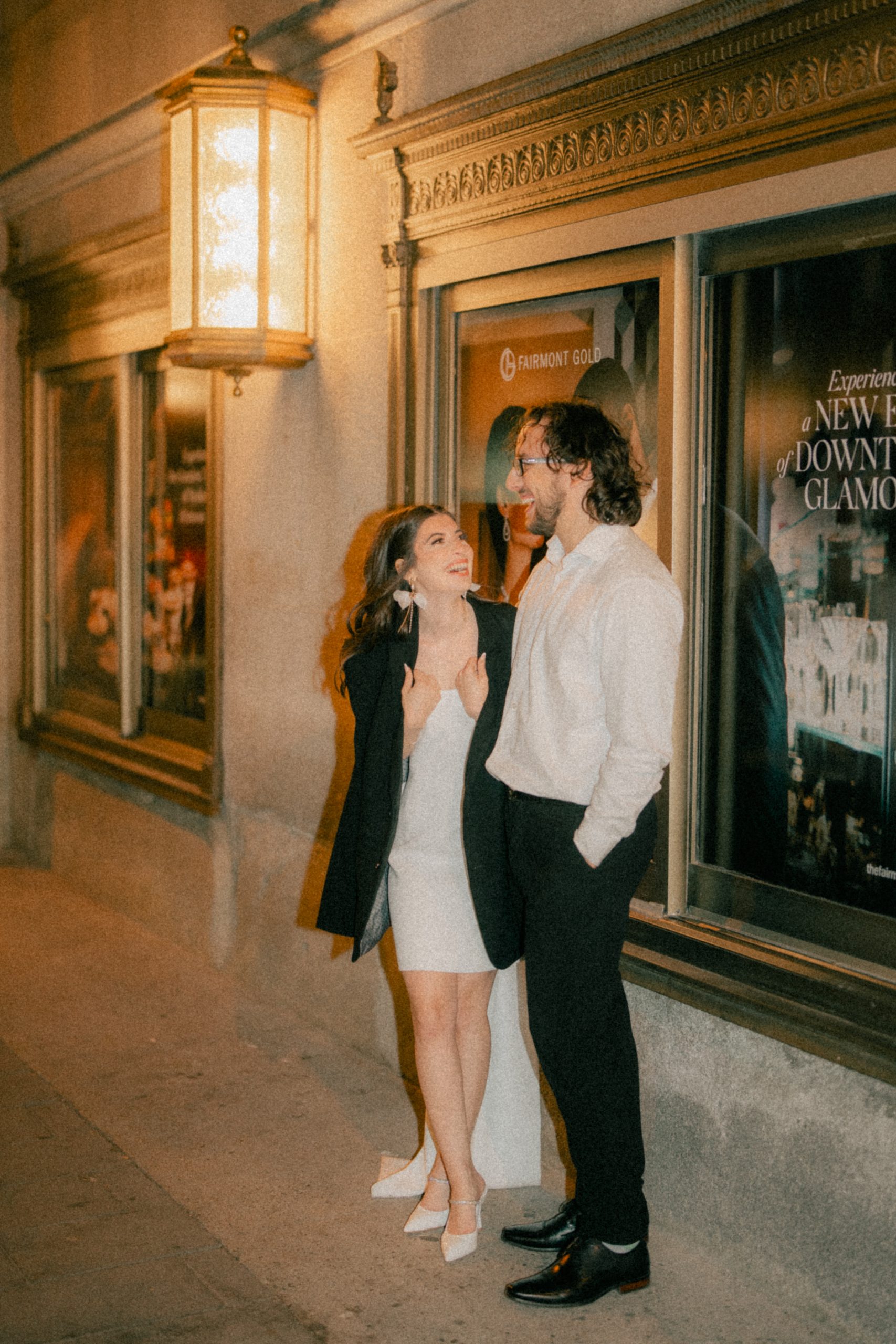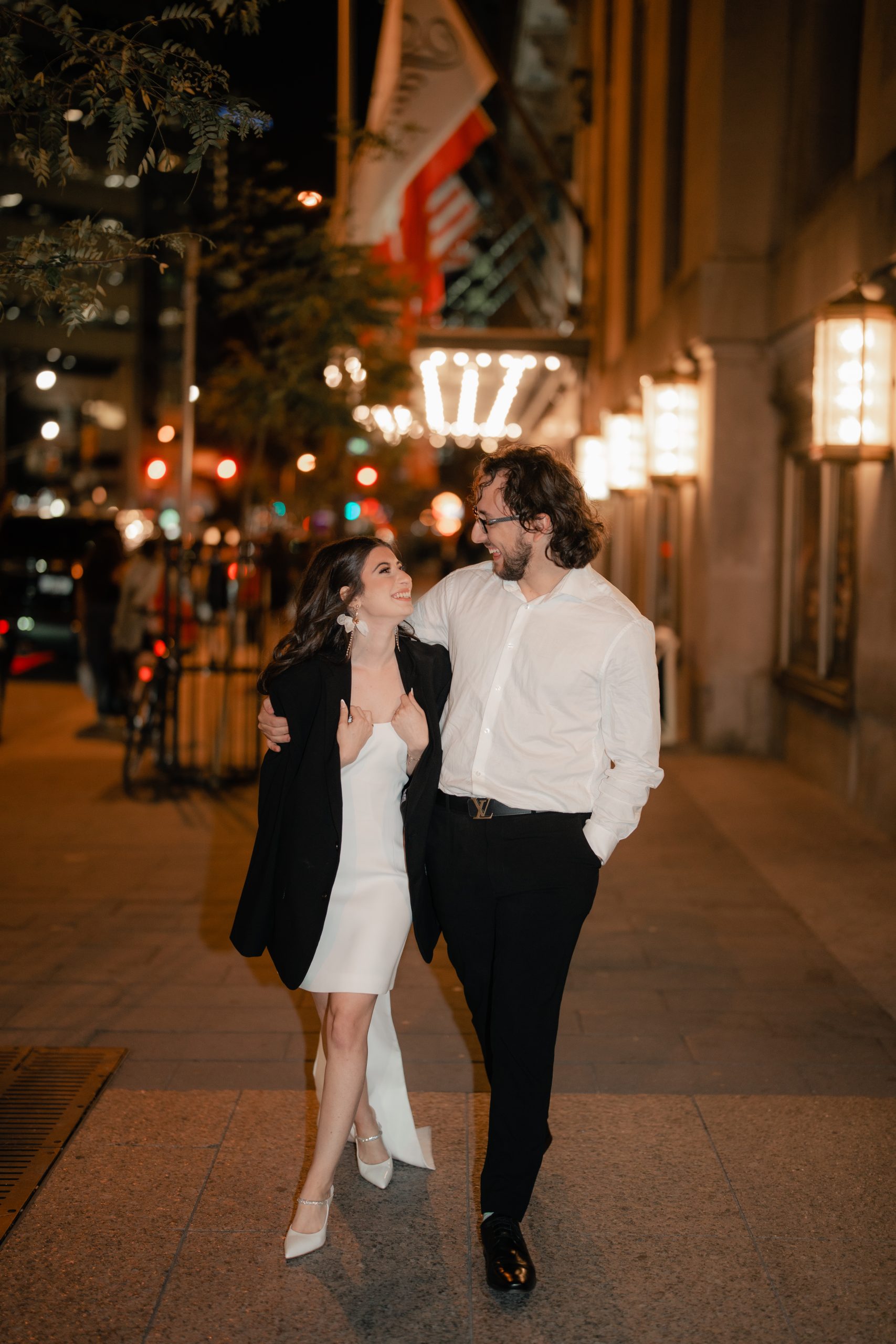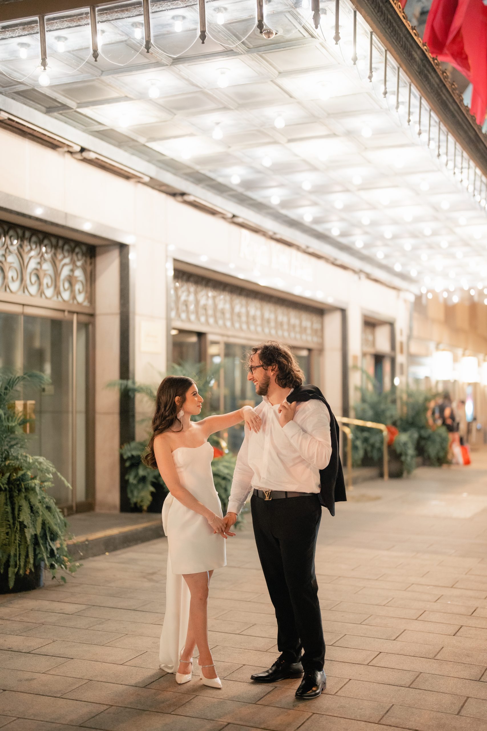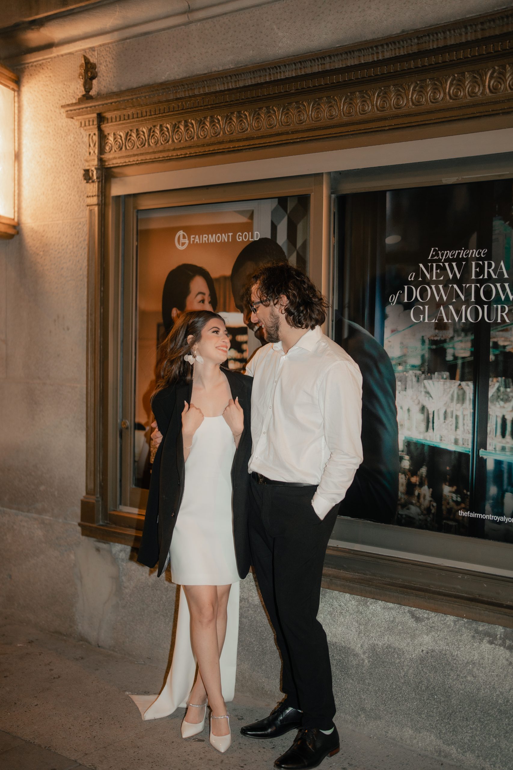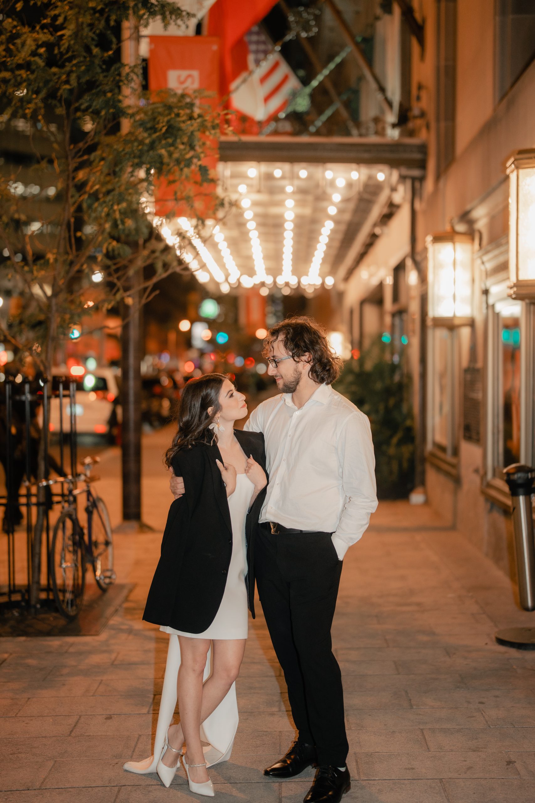 Afterwards, the night ended at the Distillery District. It was beautiful. The string lights gave out such a romantic impression. Their whole shoot kind of looked like the aftermath of their wedding. Julia was wearing Daniel’s coat, and they seemed as though they were already husband and wife ready to call it a night.