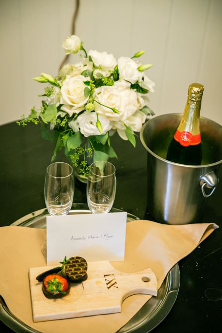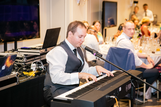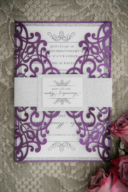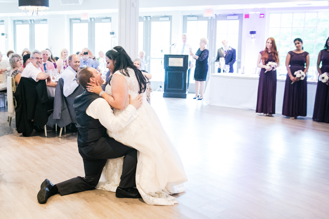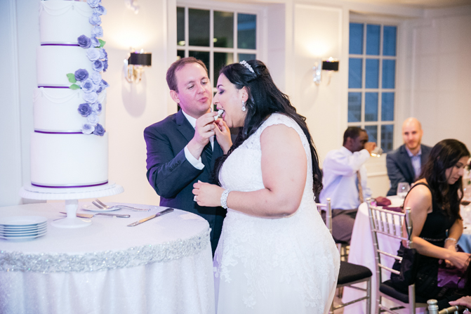 Ryan surprised Amanda with a romantic gesture of singing a song to her while playing the keyboards before dinner. It was a lovely moment that showcased his great voice. The newlyweds cut the cake, listened to speeches and then the party was in full force. The reception was beautifully decorated, with the purple theme subtly included even in the lighting. Gorgeous floral arrangements were a highlight of the decorations.