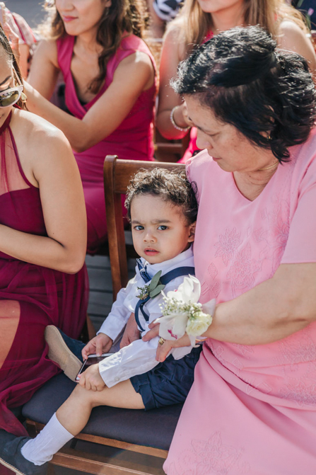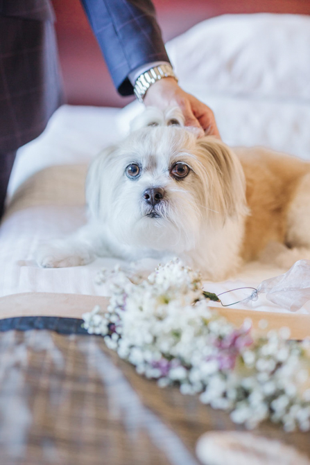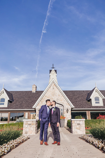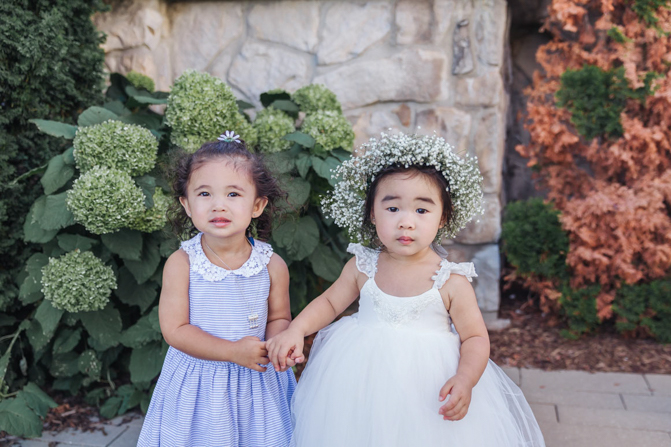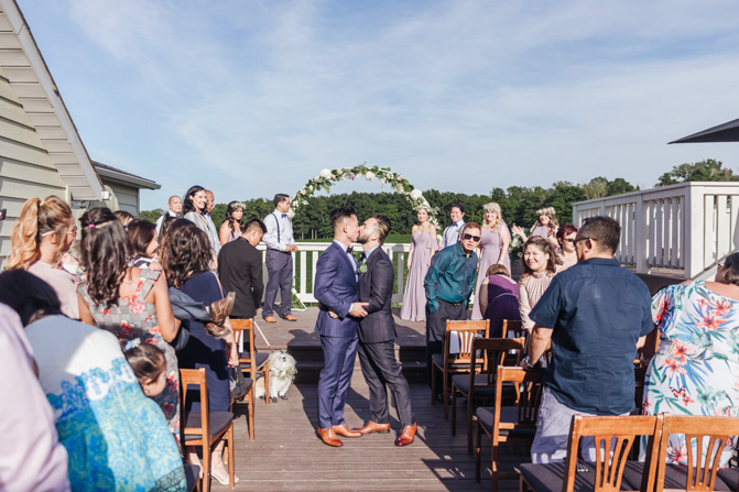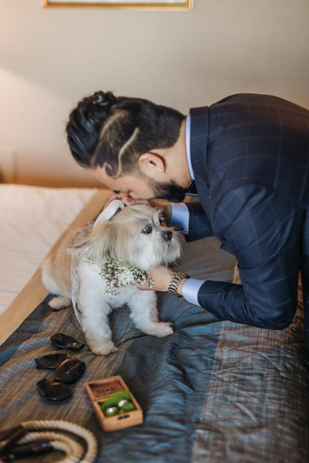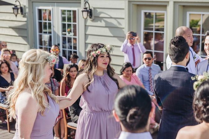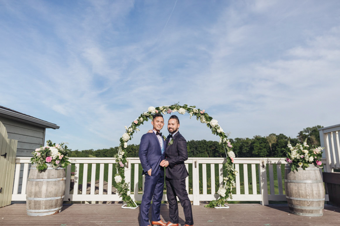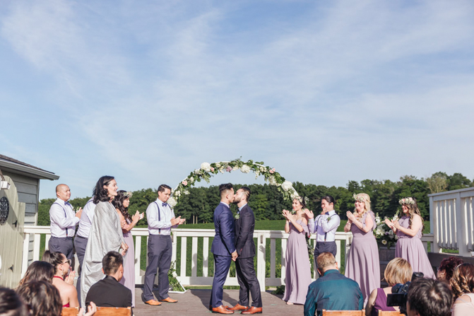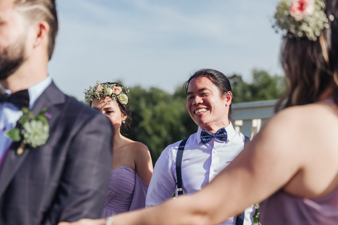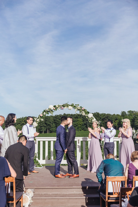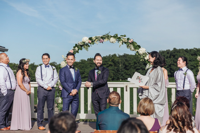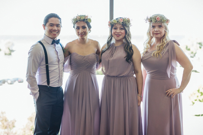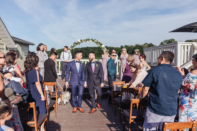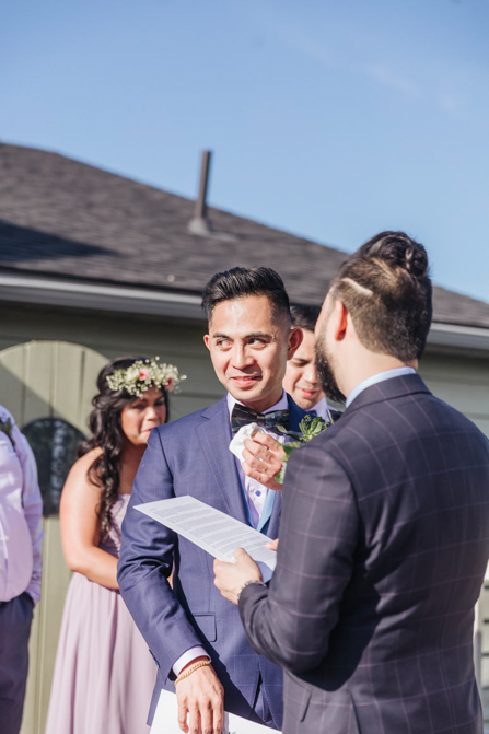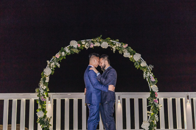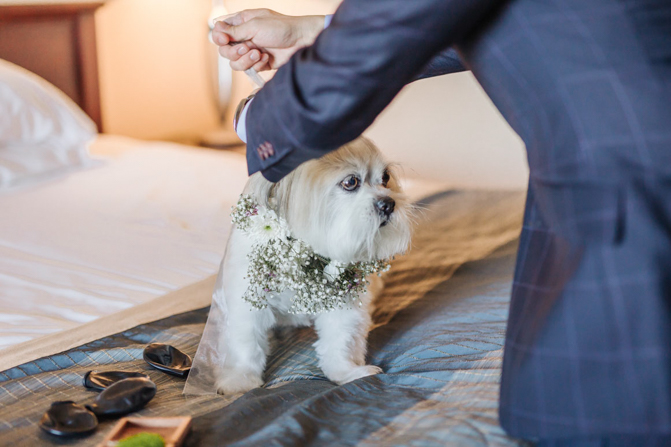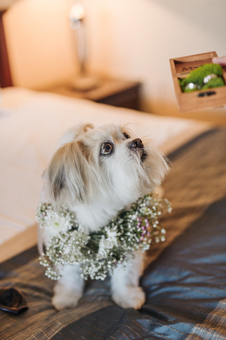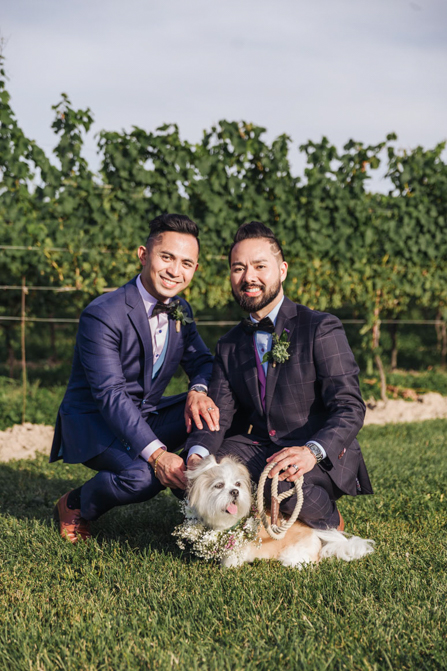 Our Grooms’ Little Helper Girl, Chloe, and the 4 women in our “Infinity8” wore floral crowns (baby’s breath and blush-colored flowers). Our moms wore orchid corsages (light purple). And our beloved dog and ring-bearer, Miko, wore a floral dog dollar. For our Grooms’ Little Helper Boy, Ben, and the 4 men in our “Infinity8”, my dad, and Kim’s son (Jericho, also a ring-bearer) – all wore seeded eucalyptus boutonniere. Finally, each groom wore a succulent bouquet.