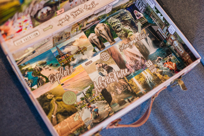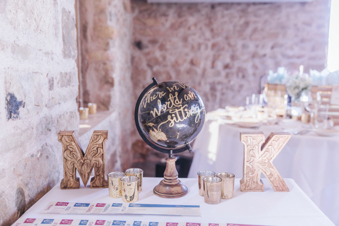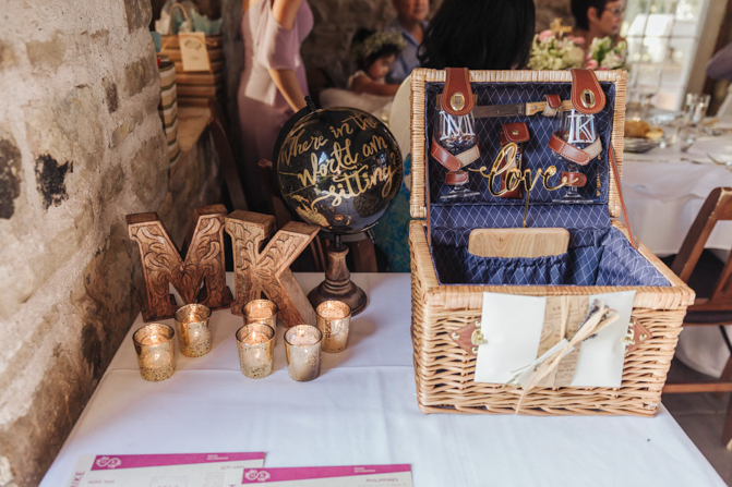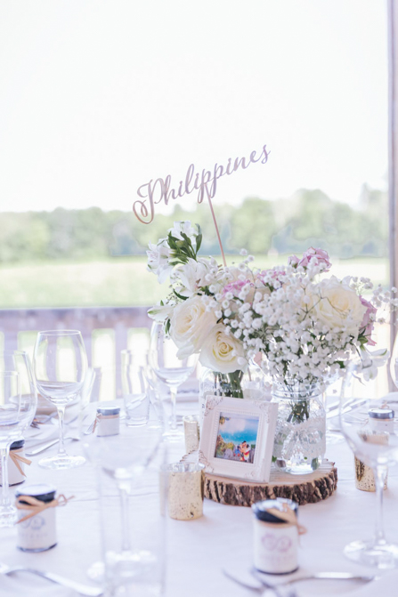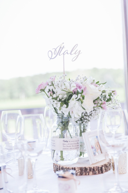 The centerpiece had 2 mason jars with floral arrangements (blush and white and lilac, earthy tones). They are set in a large piece of the wooden slab with a picture frame (with our most memorable photo from that particular country). Also, the name of the country on top of the centerpiece is also laser cut acrylic material in gold, to match the rustic gold candle holders on the tables. We really want to make it very personal and each table had a write up on the mason jars (also on their boarding passes), why that country was memorable to us.