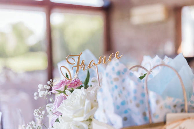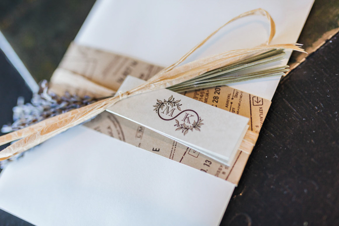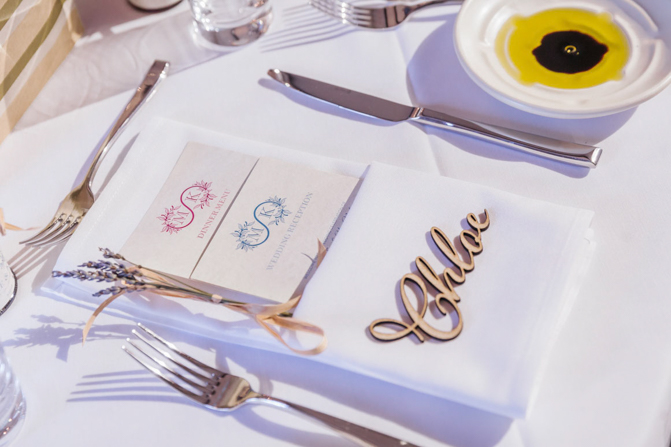 Each of our guests received a customized boarding pass, telling them their table (country) destination. They also received their own jams (locally made from Vineland, ON) with our personalized message to them at their tables. Each guest also had their own name tags made out of laser-cut woods to get that rustic feel with our favorite dried lavender on each plate.