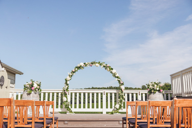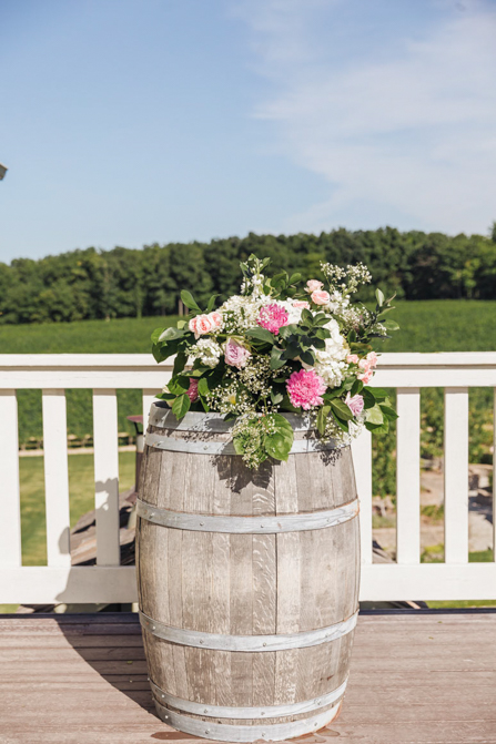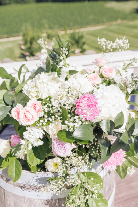 We didn’t use that many floral decorations in our wedding (there’s a lot of greens instead of flowers). The flowers we used were mainly roses and hydrangea in blush and lilac colors. For our ceremony backdrop, we had a circle arch decorated with greens and flowers. On each side of this arch were wine barrels with some floral decorations on top. Each of our 7 tables in the reception also had floral decorations with the same theme colors found in our arch.