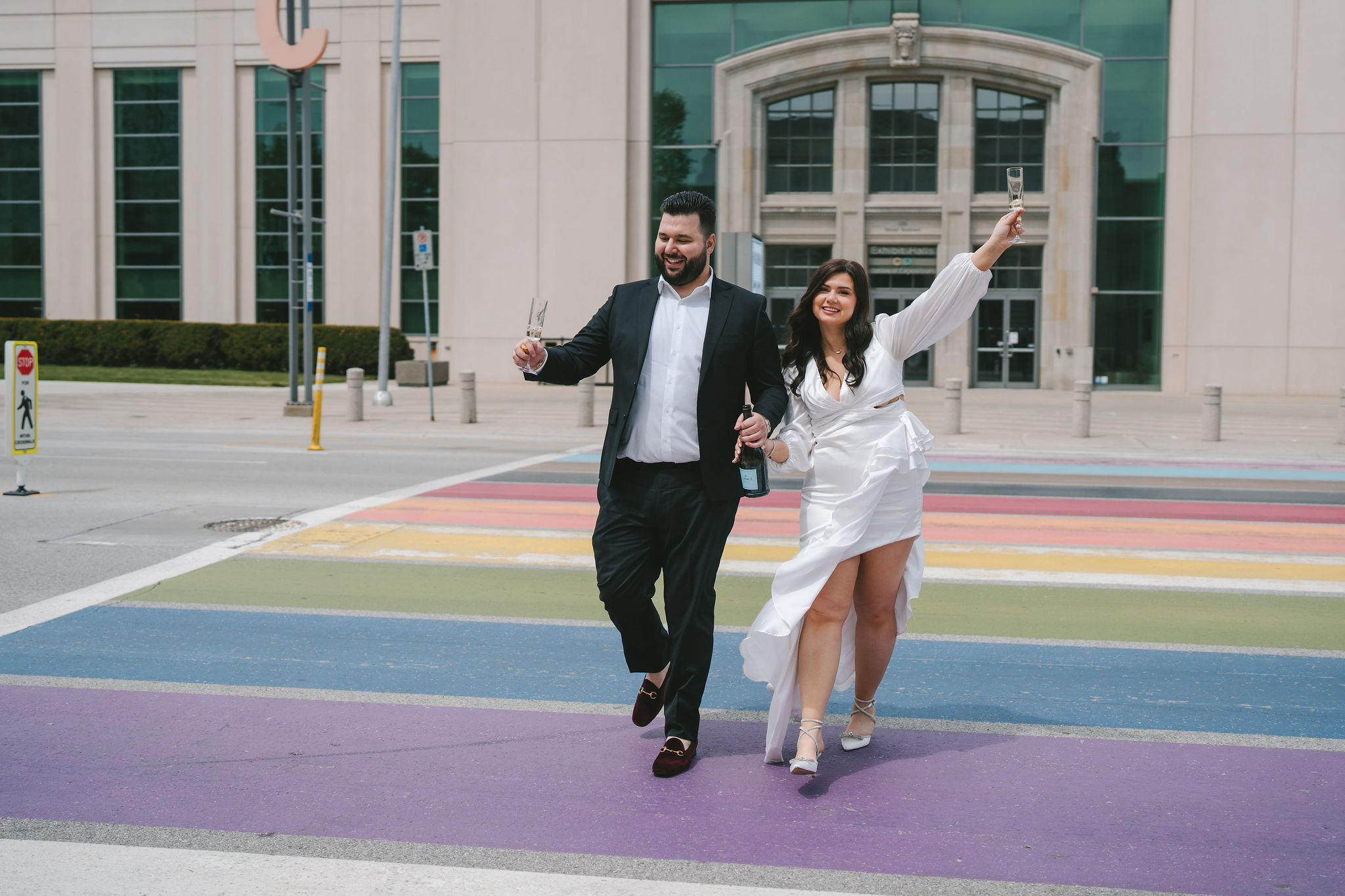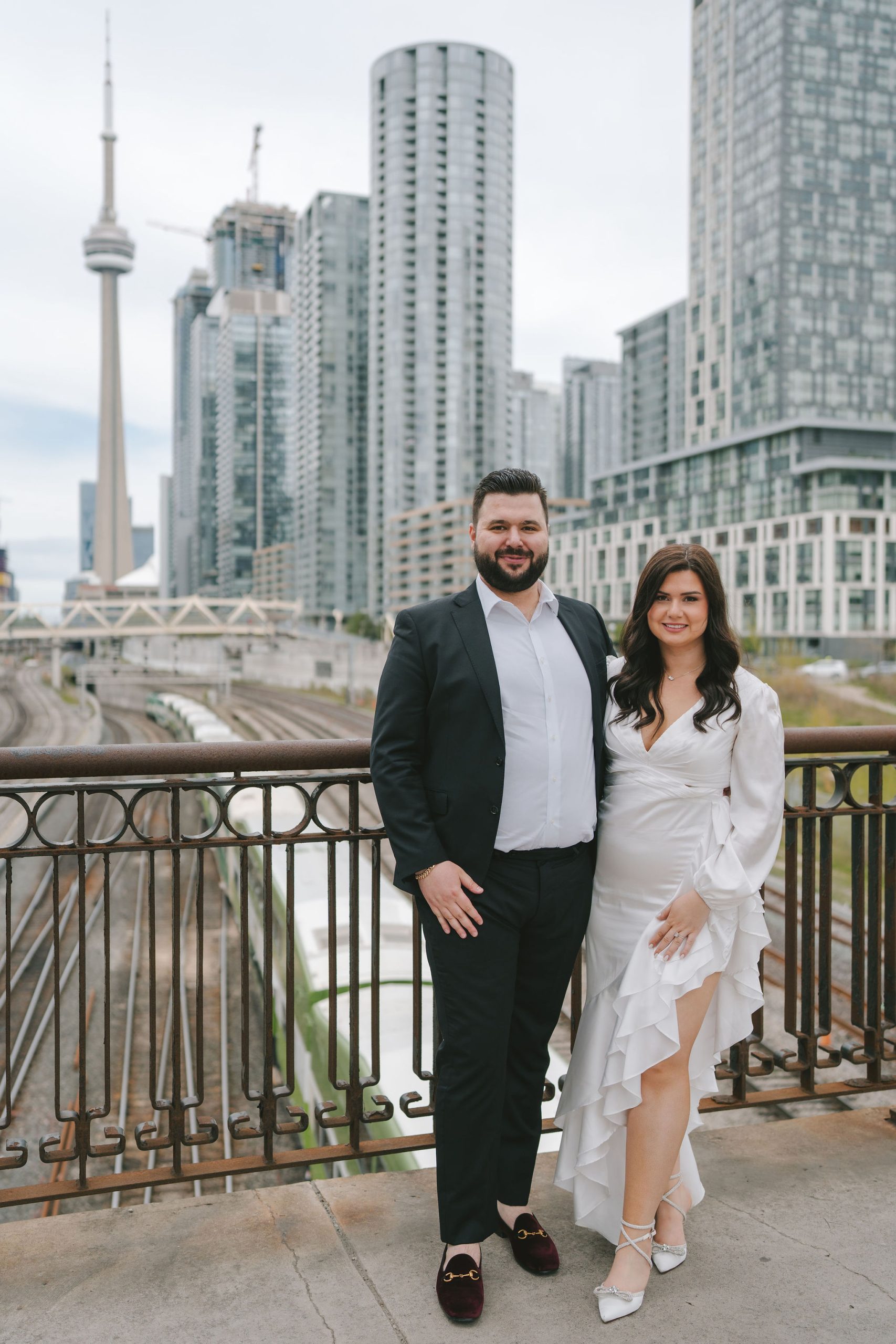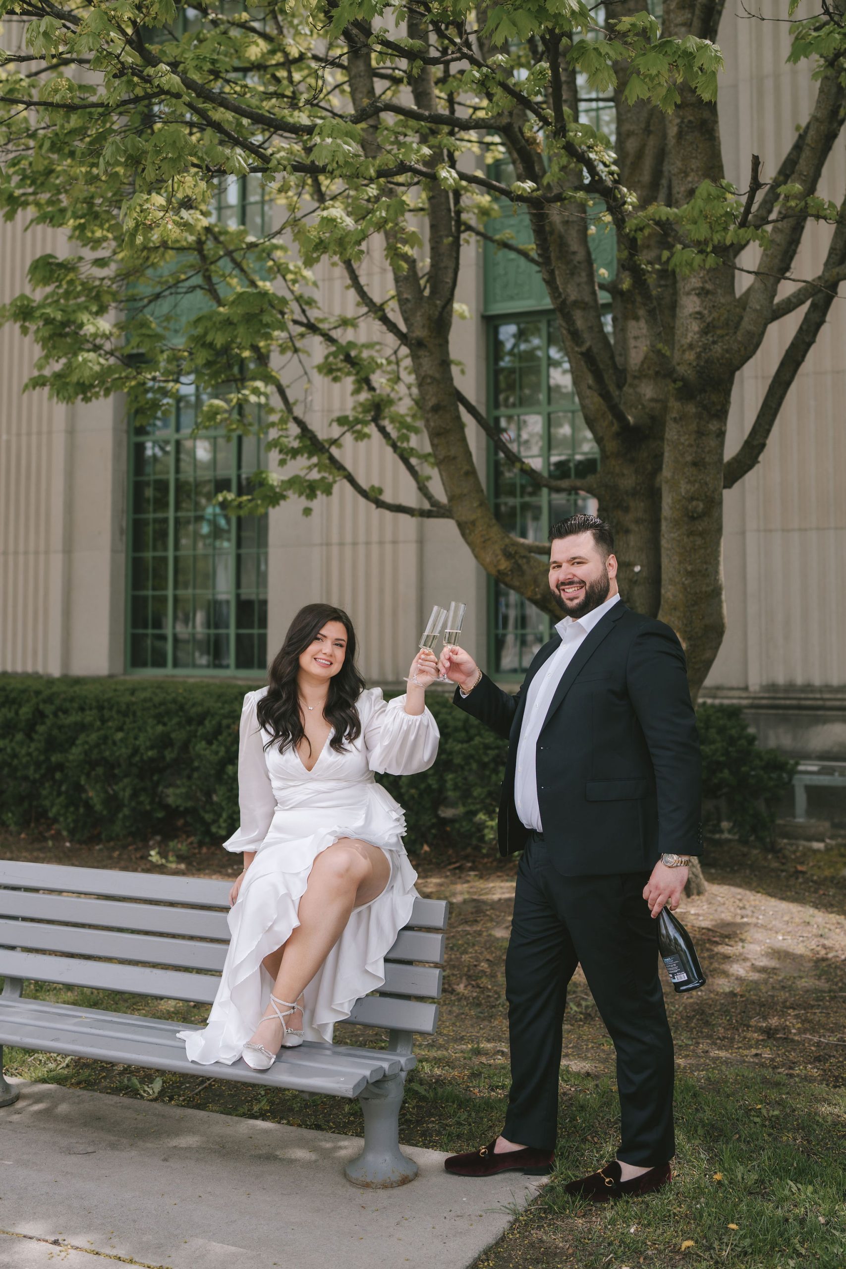 Afterwards, we transferred to the somewhat busy streets of Toronto. Herma and Dean brought a prop to our photoshoot, which I thought was funny at first. They had a bottle of champagne and a pair of glass flutes. It was such a fun moment, to be honest! I made them pop it open and drink from their glasses.