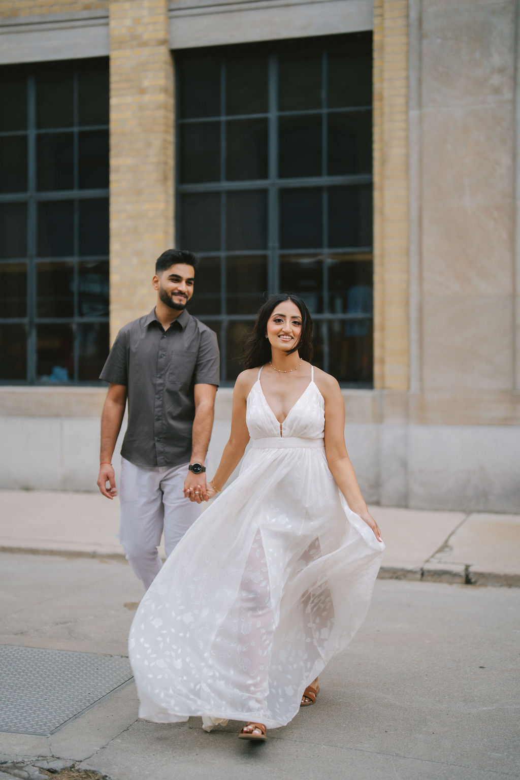 Their first outfit choice leaned more formal but still approachable. Kalp wore a dark suit that contrasted nicely with the clean tones of the background, while Samdisha’s outfit flowed beautifully in the wind, catching light in all the right places. What I liked most about this setup was the way it allowed the environment to work for them. The light was soft, the colors were neutral, and the space around them gave every frame a balanced composition.