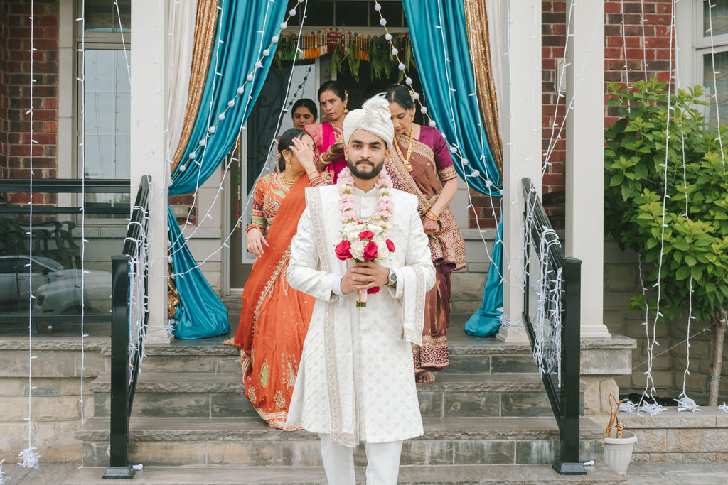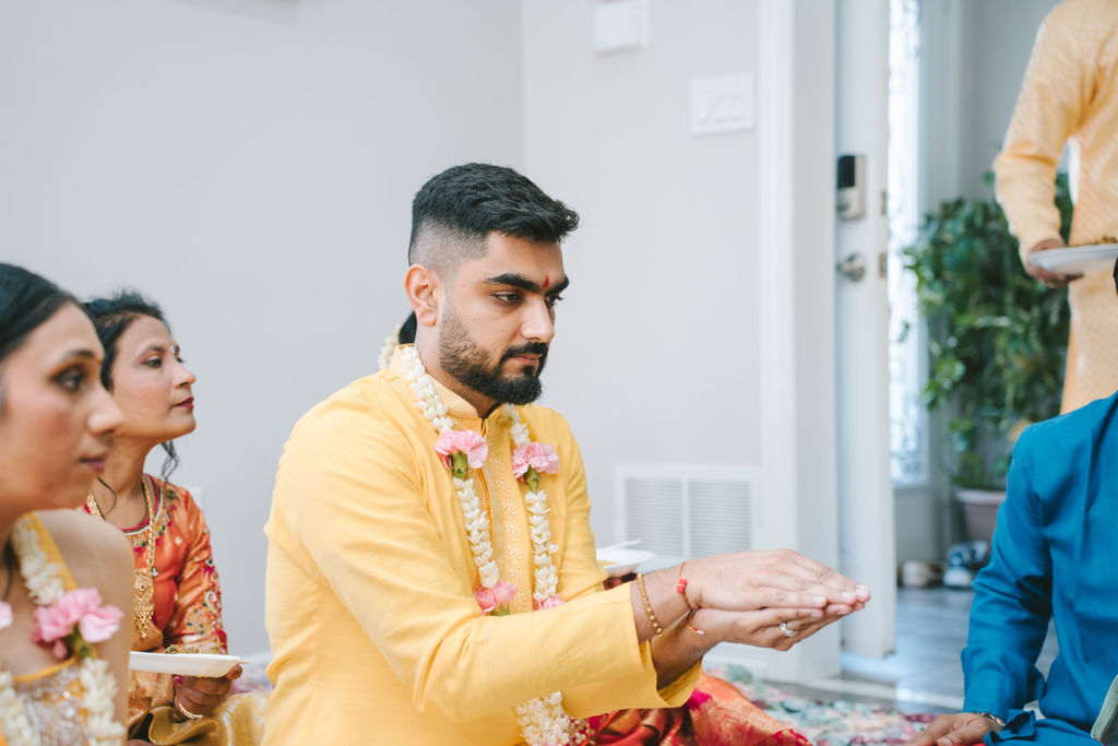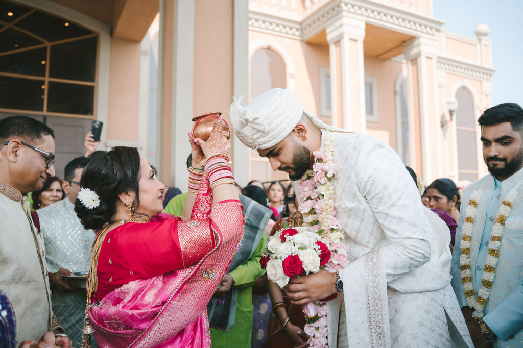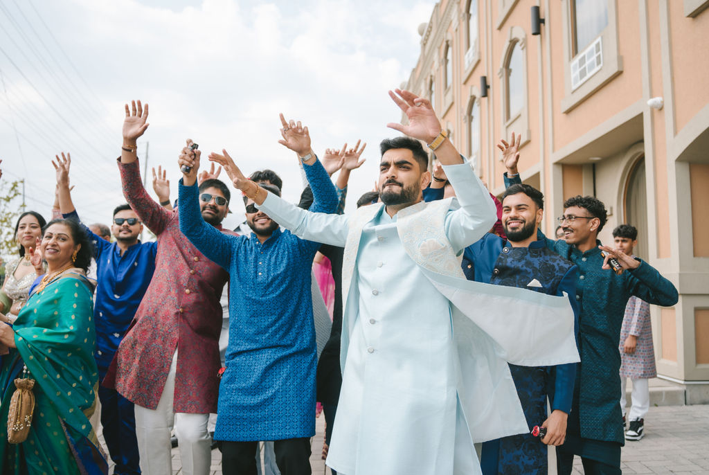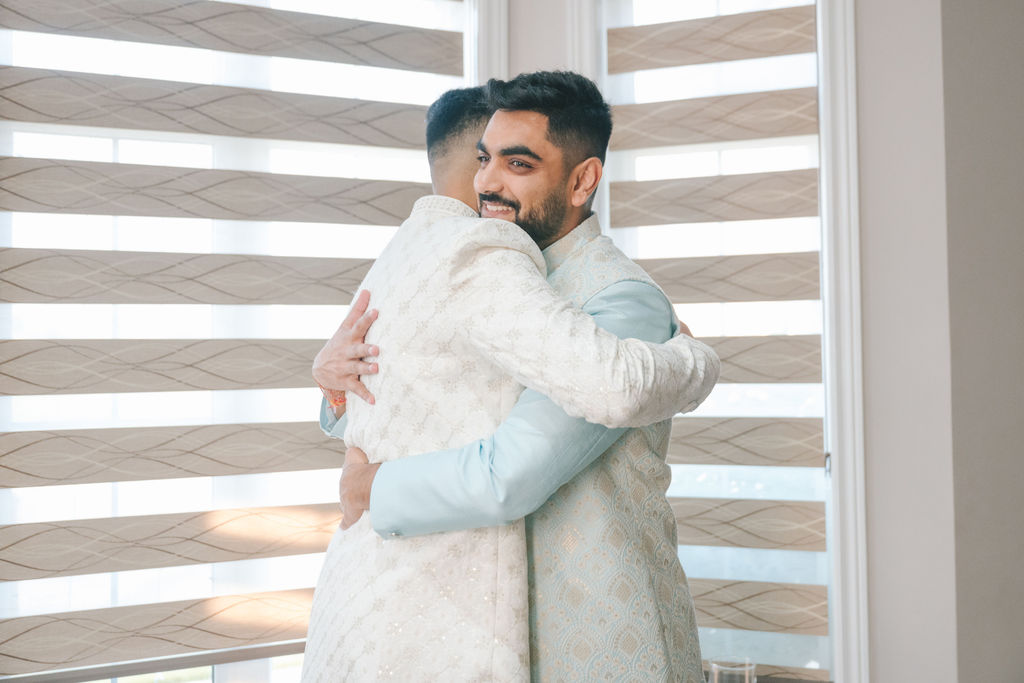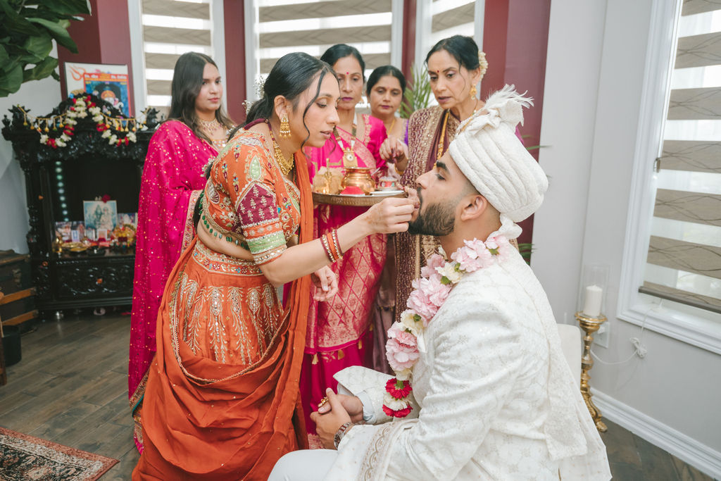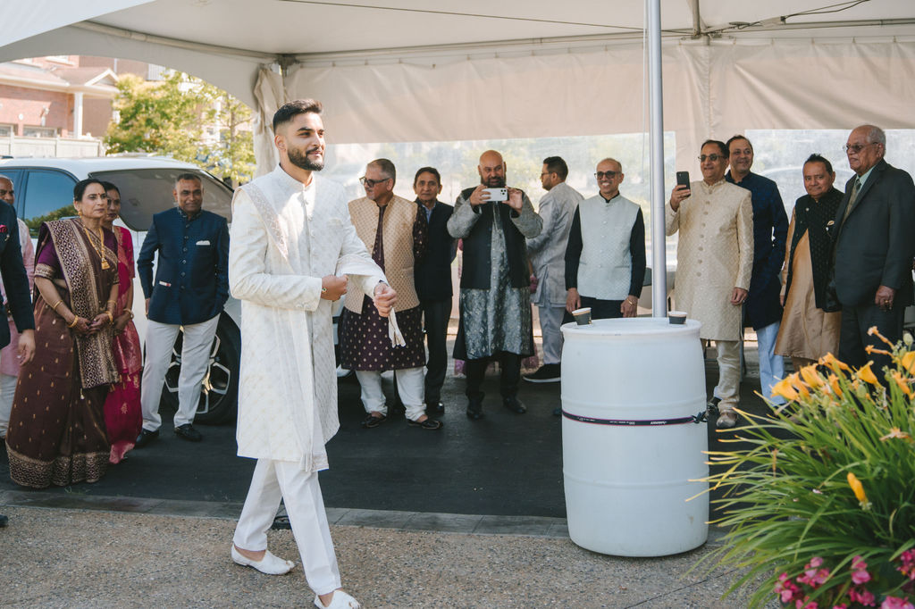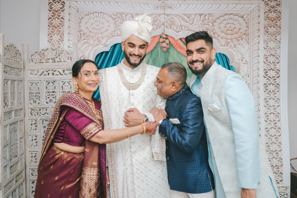They opened the day in their respective suites. Kalp was calmly readying himself: the suit, the cufflinks, a final check in the mirror. No rush, no showmanship. The mood was quiet but intentional. Meanwhile, Samdisha was surrounded by her family, going through final touches: the outfit, jewelry, the subtle adjustments that elevate the look without overemphasis. The energy wasn’t staged; it just was.