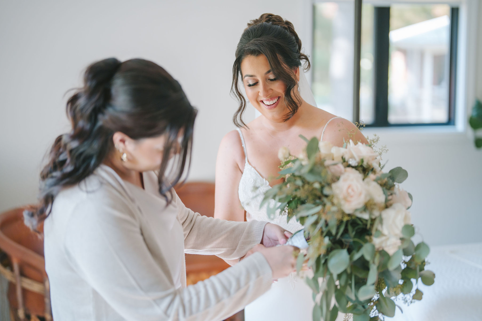 While it was a standard to have something blue, old, and borrowed, Jessica was given a pendant instead. Charms were clasped around the golden chain, and it had a picture of hers as well. Before Jessica and her family left for the ceremony, I made sure to snap a picture of them tying the pendant around her bouquet.