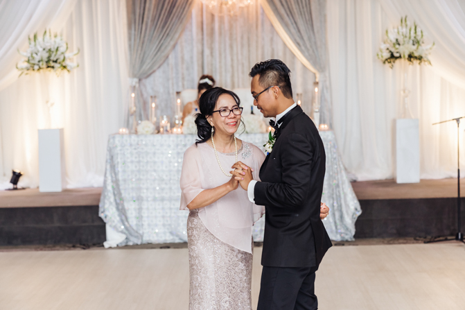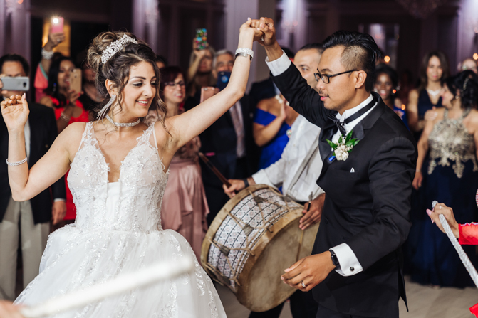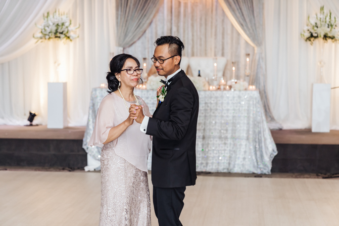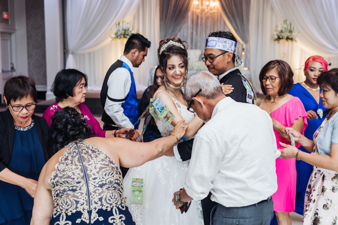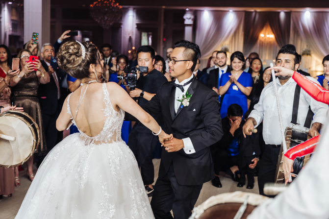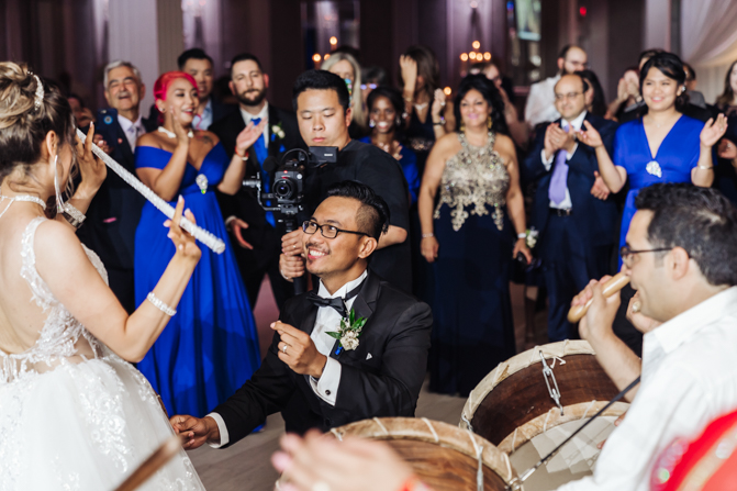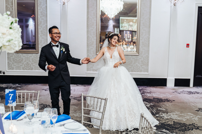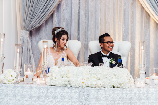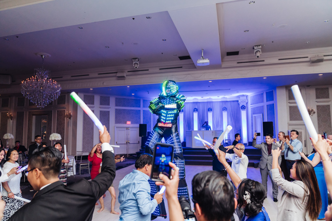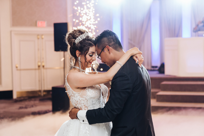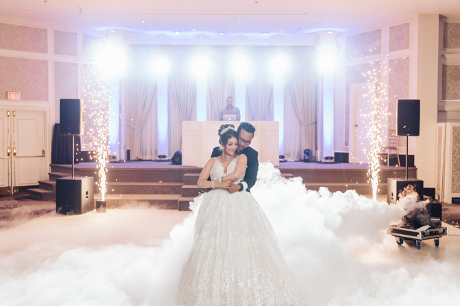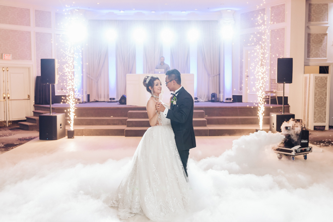 Soon it was time for the wedding reception at the Crystal Fountain Event Venue in Markham. The guests all cheered loudly as the newlyweds entered the room to an upbeat song that suited their fun personalities. Dry iced was pumped onto the massive dance floor as they performed their first dance.