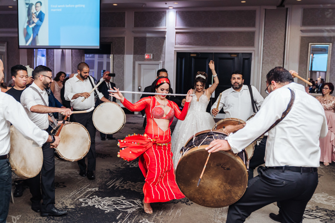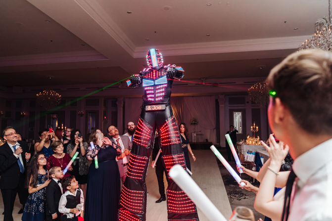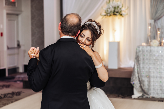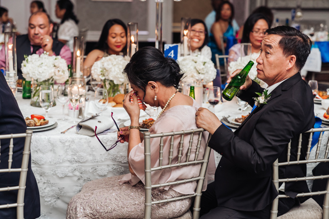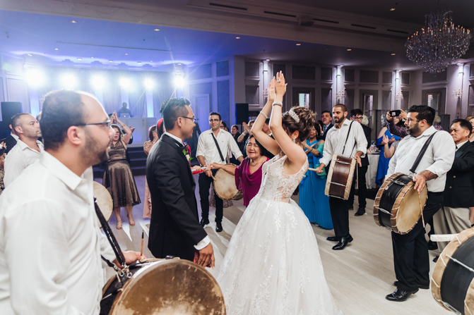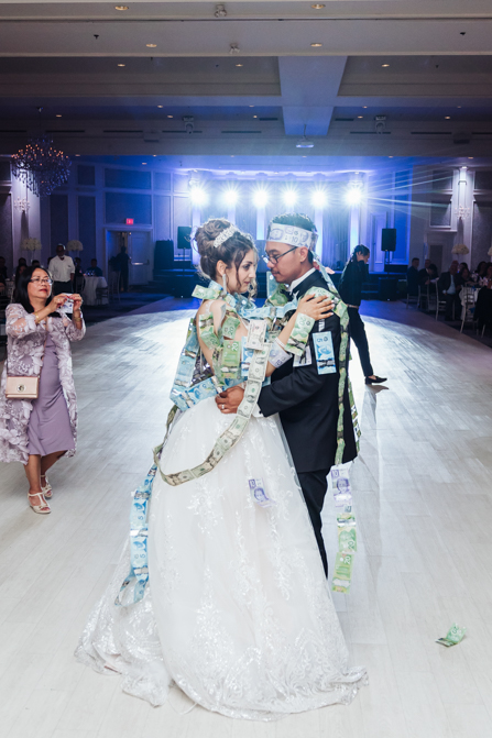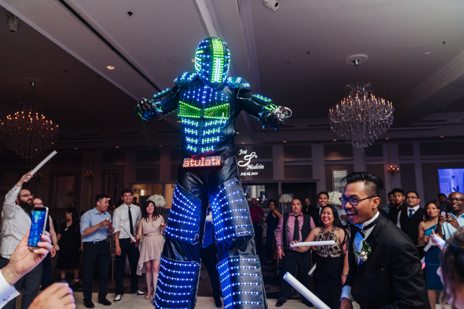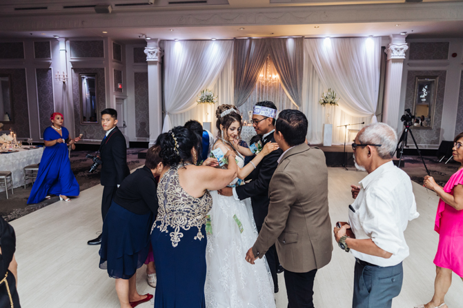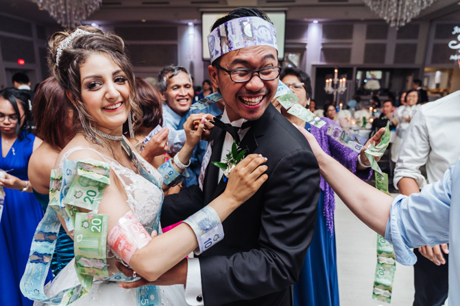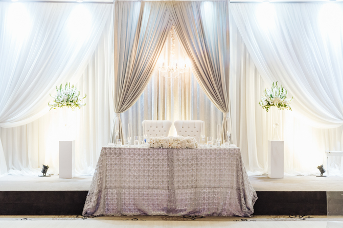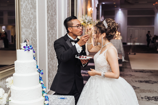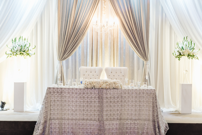 Soon it was time for the wedding reception at the Crystal Fountain Event Venue in Markham. The guests all cheered loudly as the newlyweds entered the room to an upbeat song that suited their fun personalities. Dry iced was pumped onto the massive dance floor as they performed their first dance.
