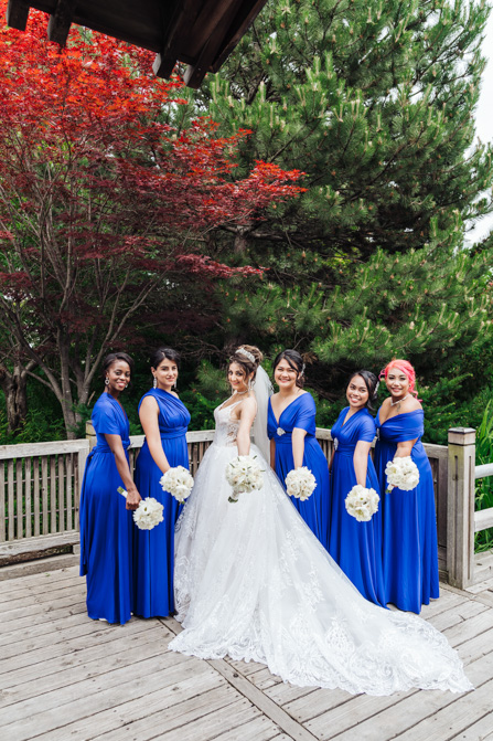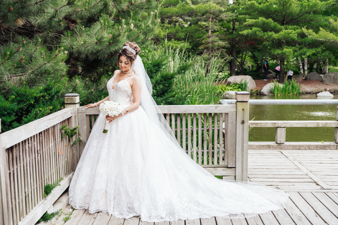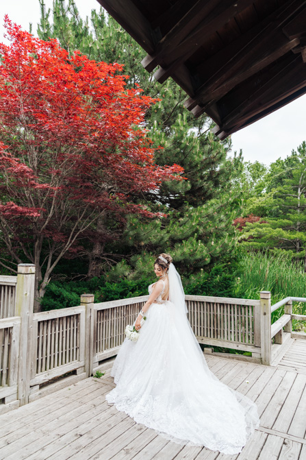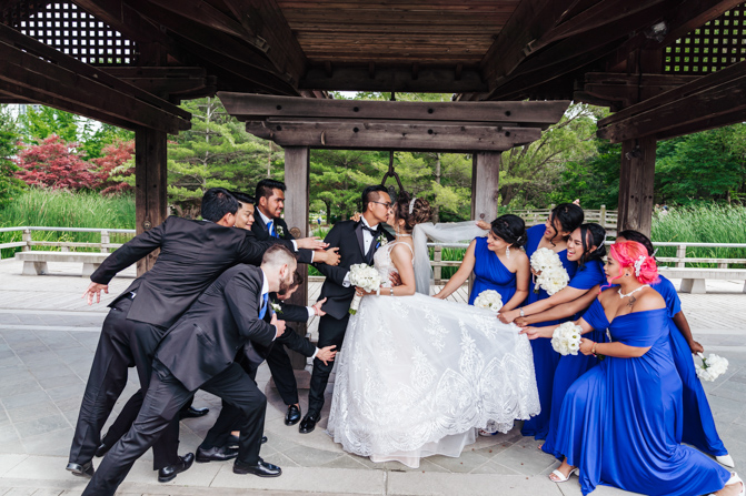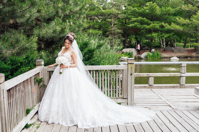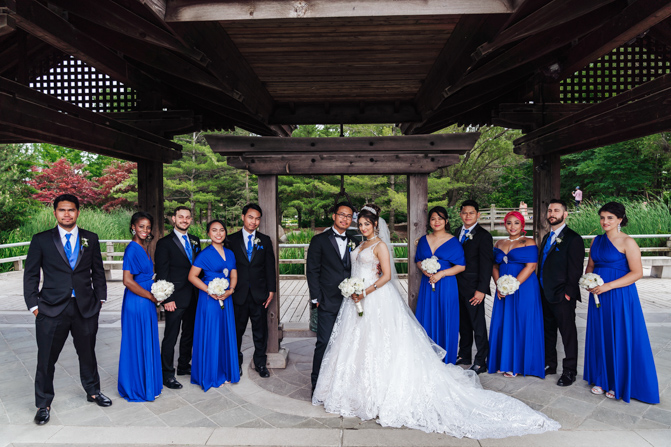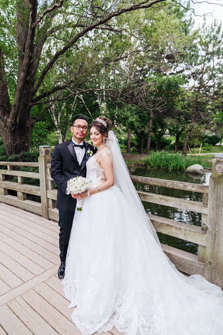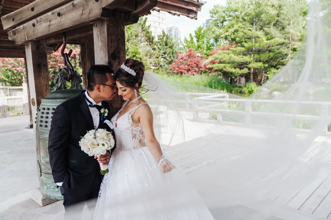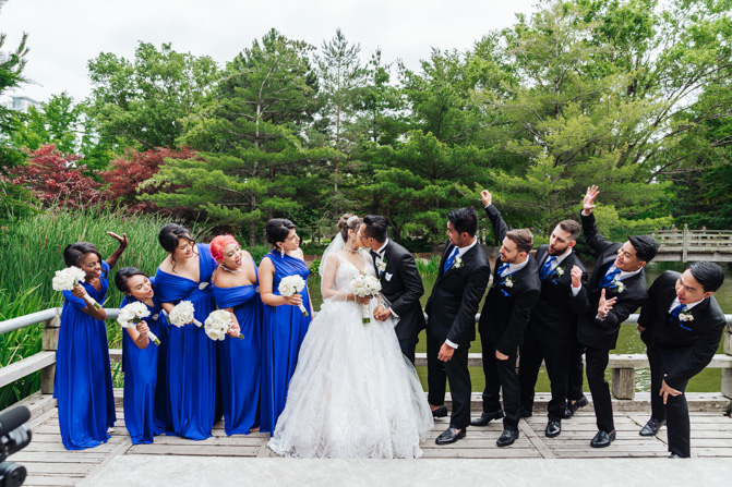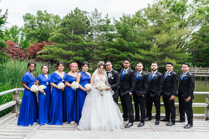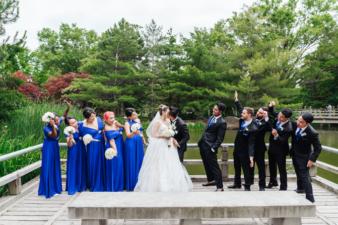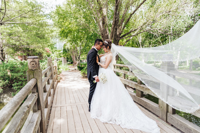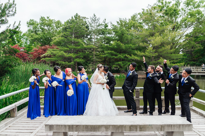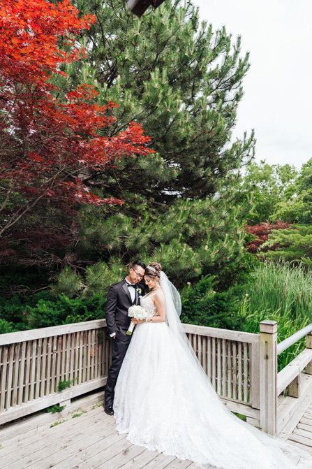 After the wedding ceremony, we went to the gorgeous Kariya Park for the bridal party and couple photos. This Toronto wedding photographer and videographer team likes shooting candid wedding photography scenes here with the natural environment contrasting with the cityscape in the background. We took photos and video on a rustic bridge overlooking a water feature and in the pretty Japanese-inspired garden kariya park. We love the romantic just-married couple shots that are romantic and sentimental.