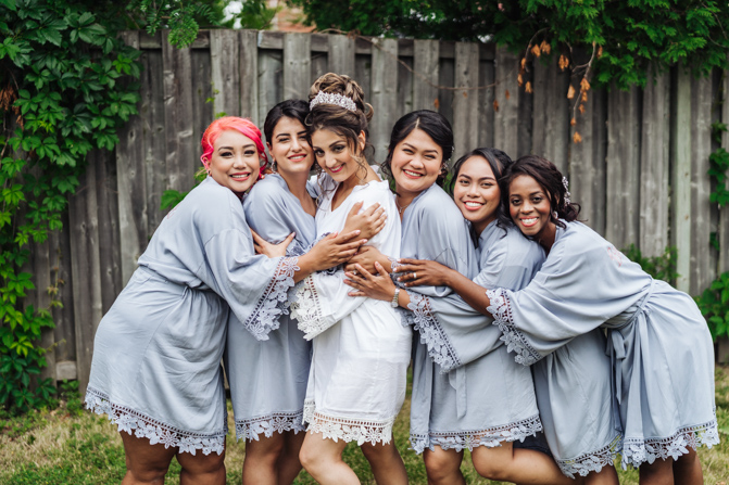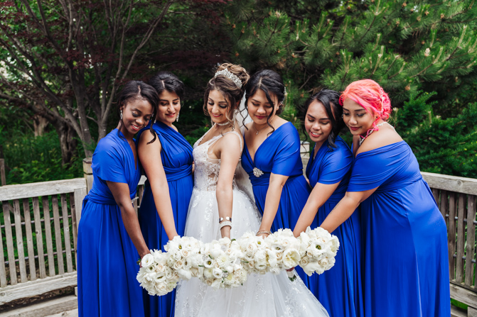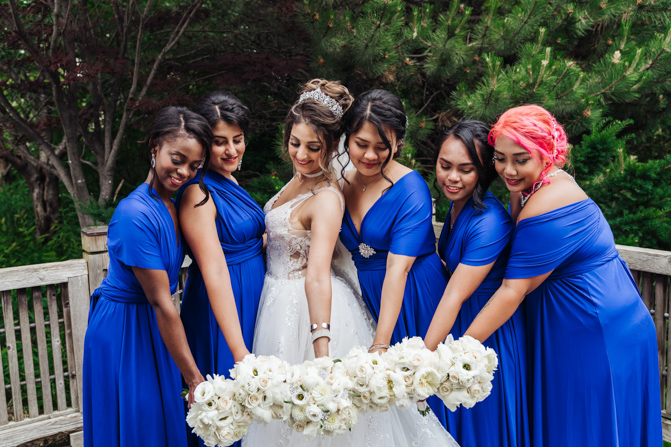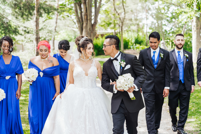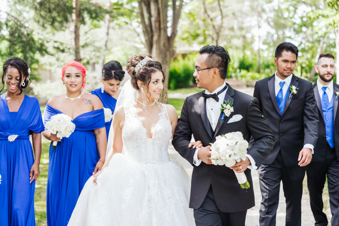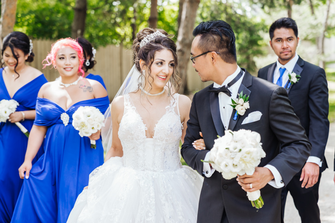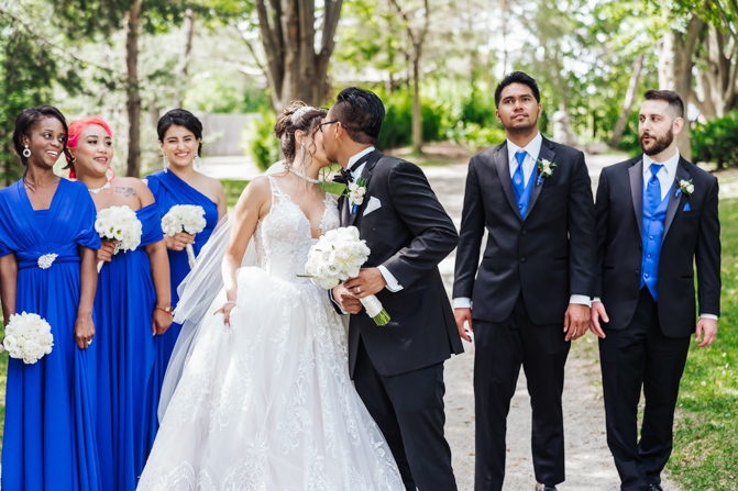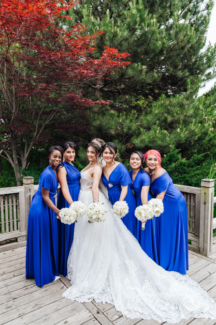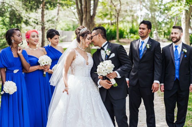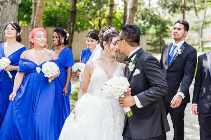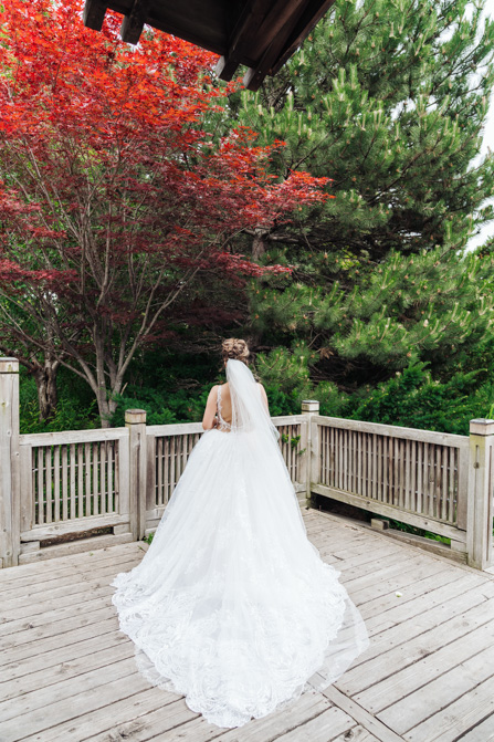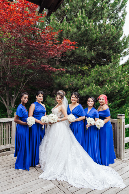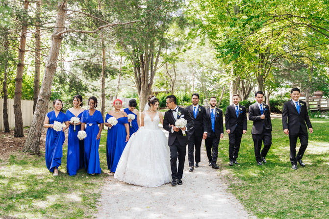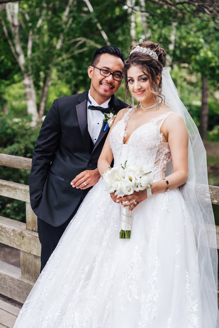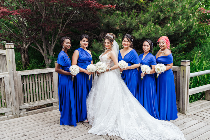 After the wedding ceremony, we went to the gorgeous Kariya Park for the bridal party and couple photos. This Toronto wedding photographer and videographer team likes shooting candid wedding photography scenes here with the natural environment contrasting with the cityscape in the background. We took photos and video on a rustic bridge overlooking a water feature and in the pretty Japanese-inspired garden kariya park. We love the romantic just-married couple shots that are romantic and sentimental.