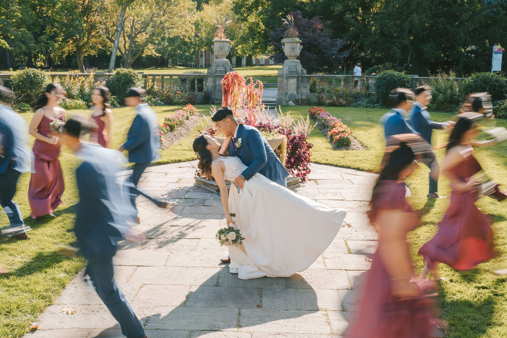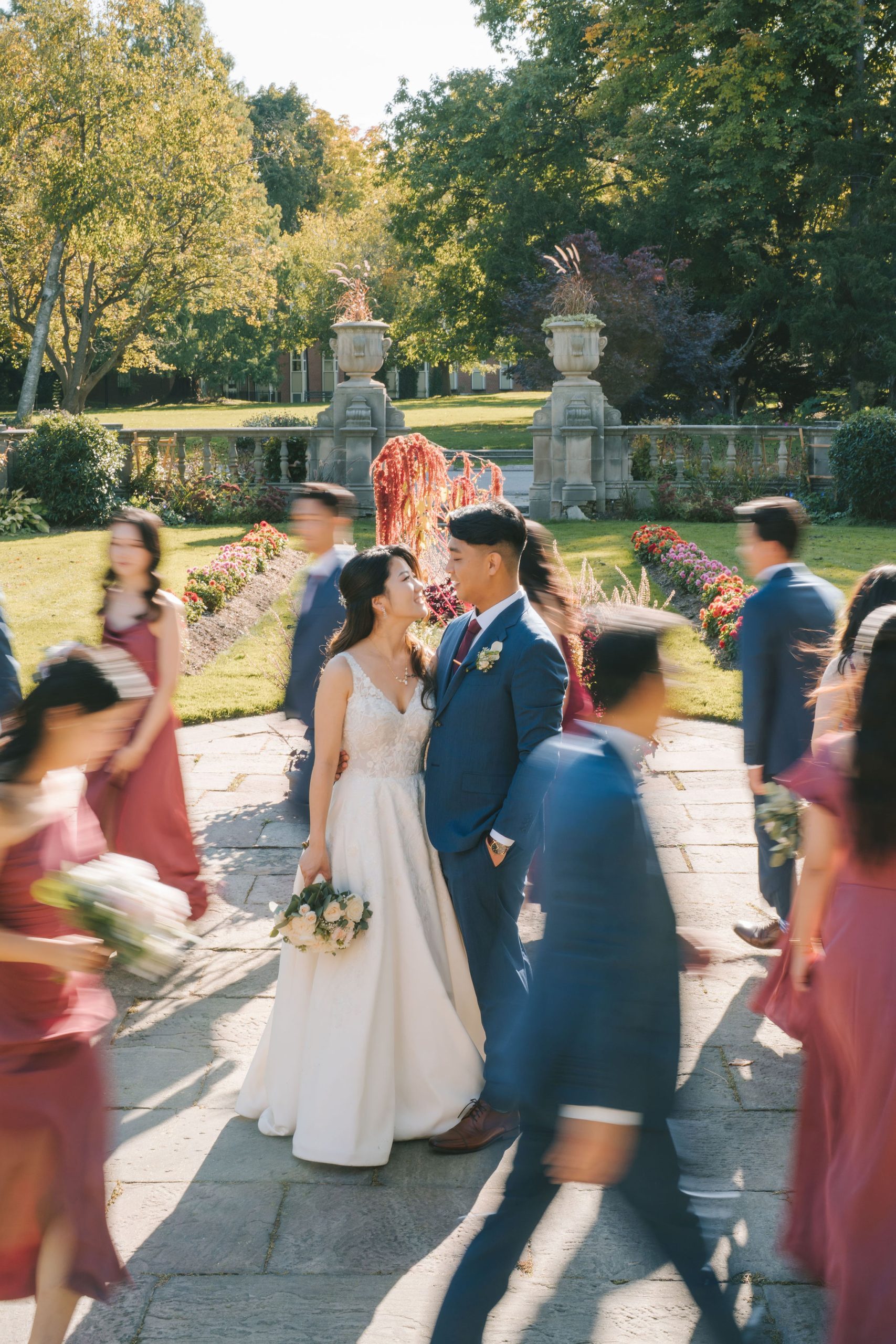 I instructed Sean and Christina to position themselves in the middle, and asked the bridesmaids and groomsmen to walk around them in a circular motion. During post-production, I wanted it to appear as though Sean and Christina were stuck in time. So, I made sure to emphasize the blurring effect on everyone else except the couple. This was to signify how their love is capable of moving time faster and slower simultaneously!