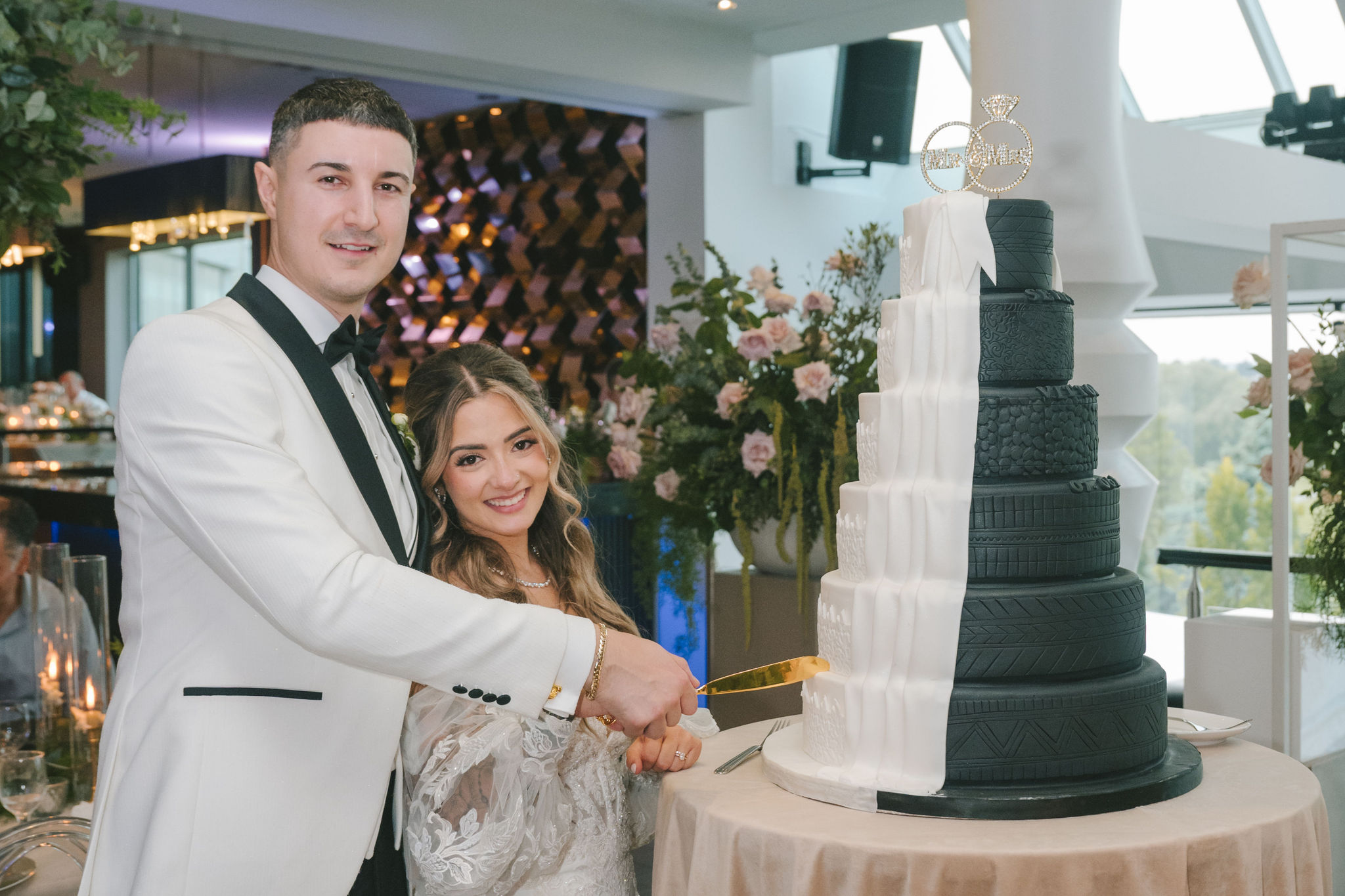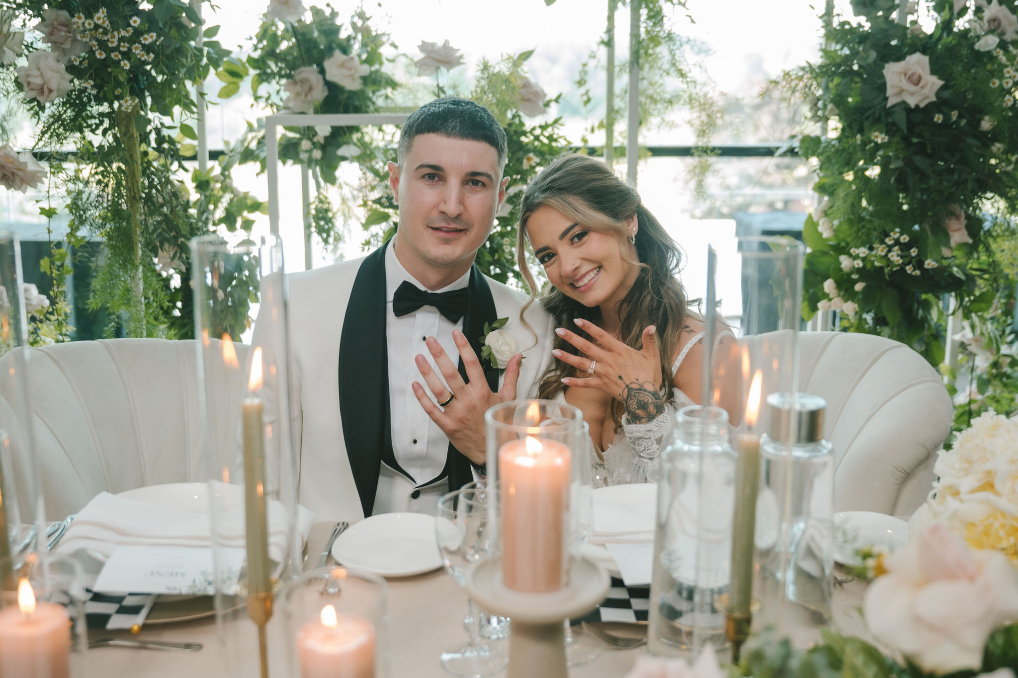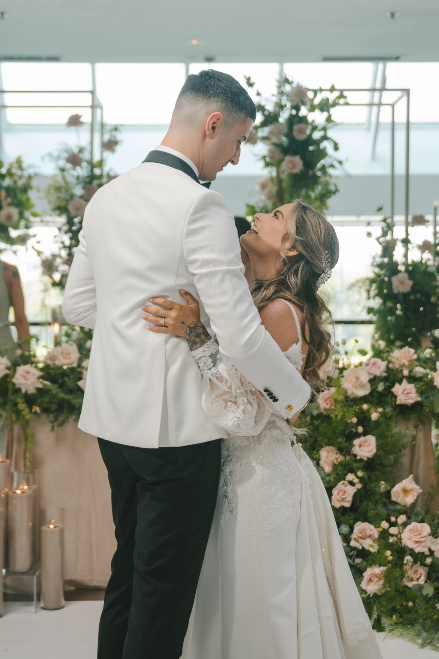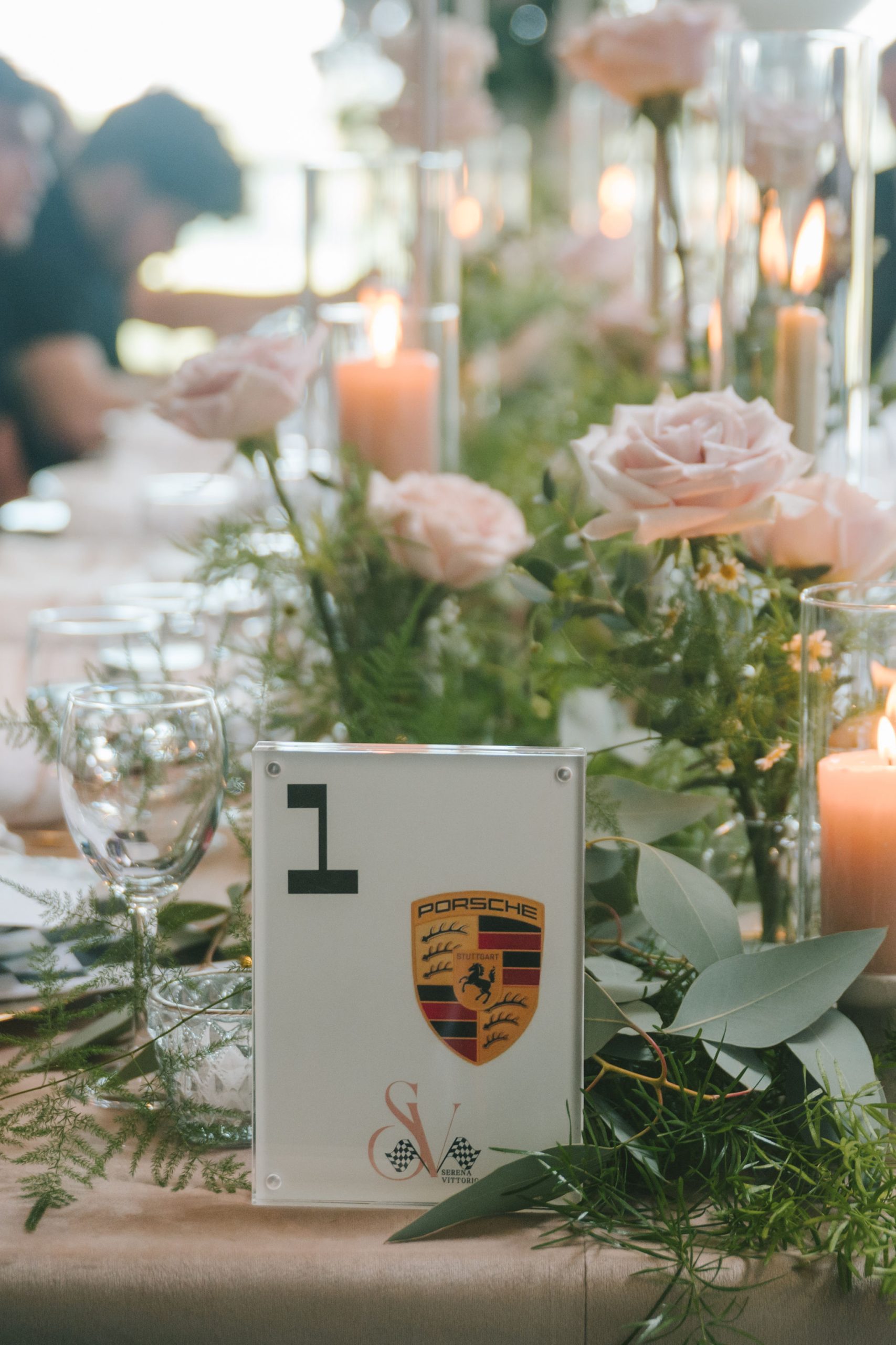 All a seamless blend of tender romance and personality. Lush greenery trailed across tables, soft pastel flowers bloomed from every centerpiece, and subtle car-themed details added a spark of fun without overpowering the elegance of the evening.