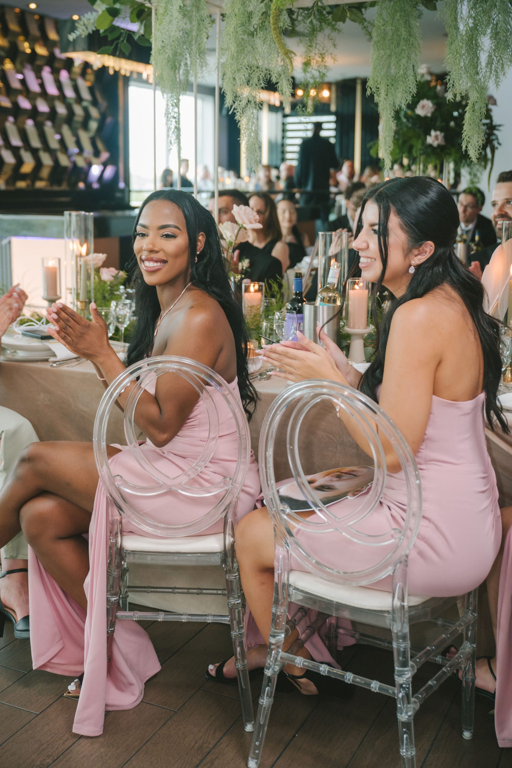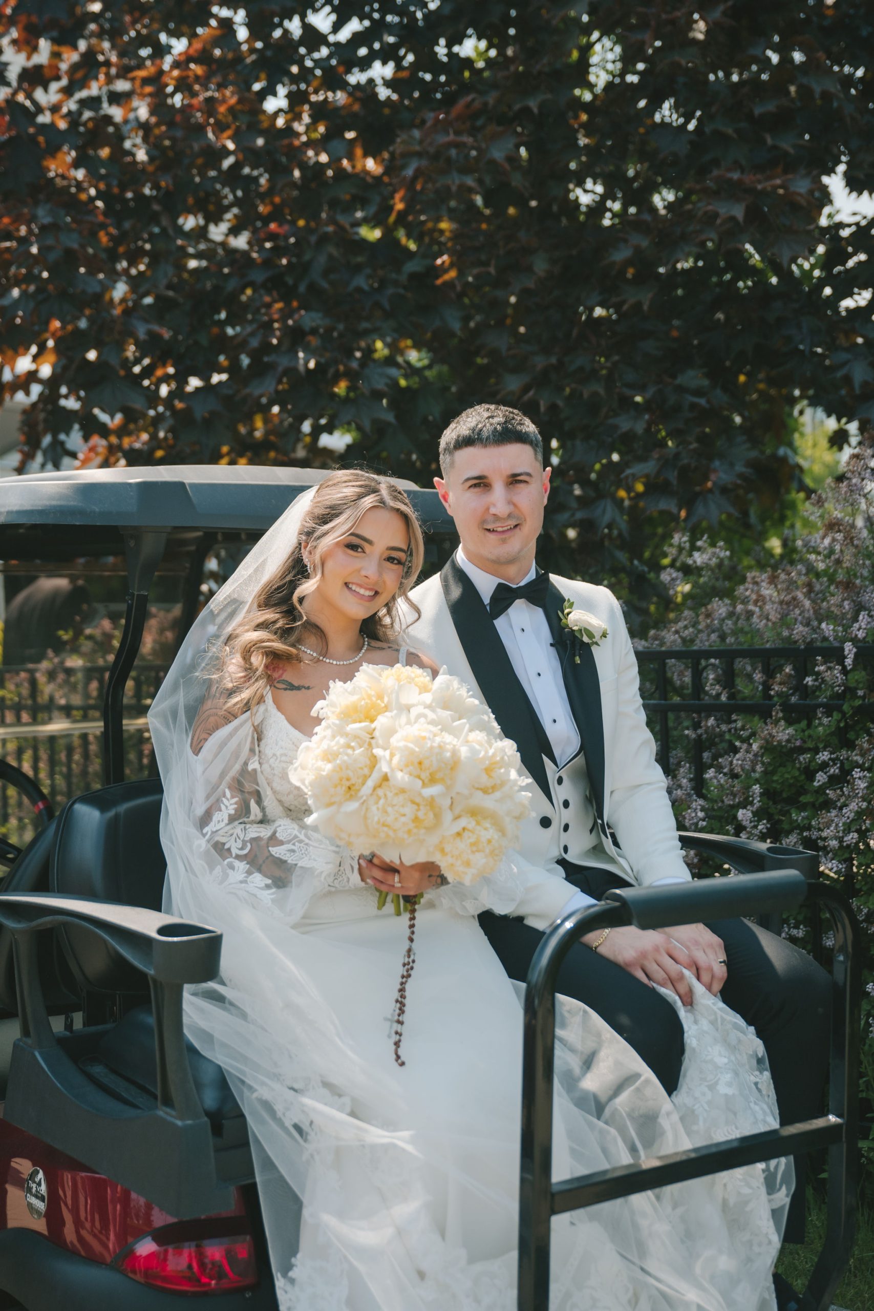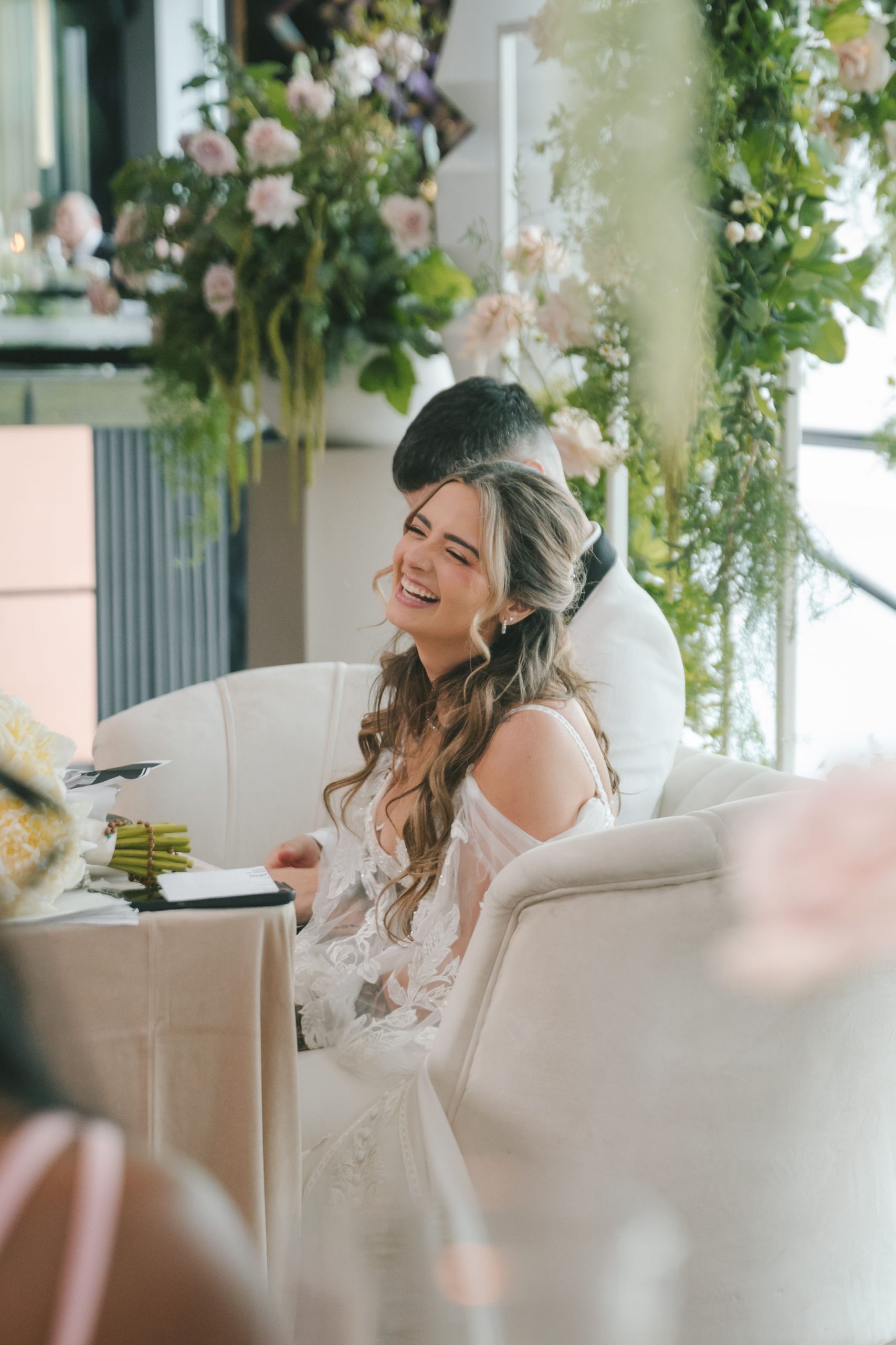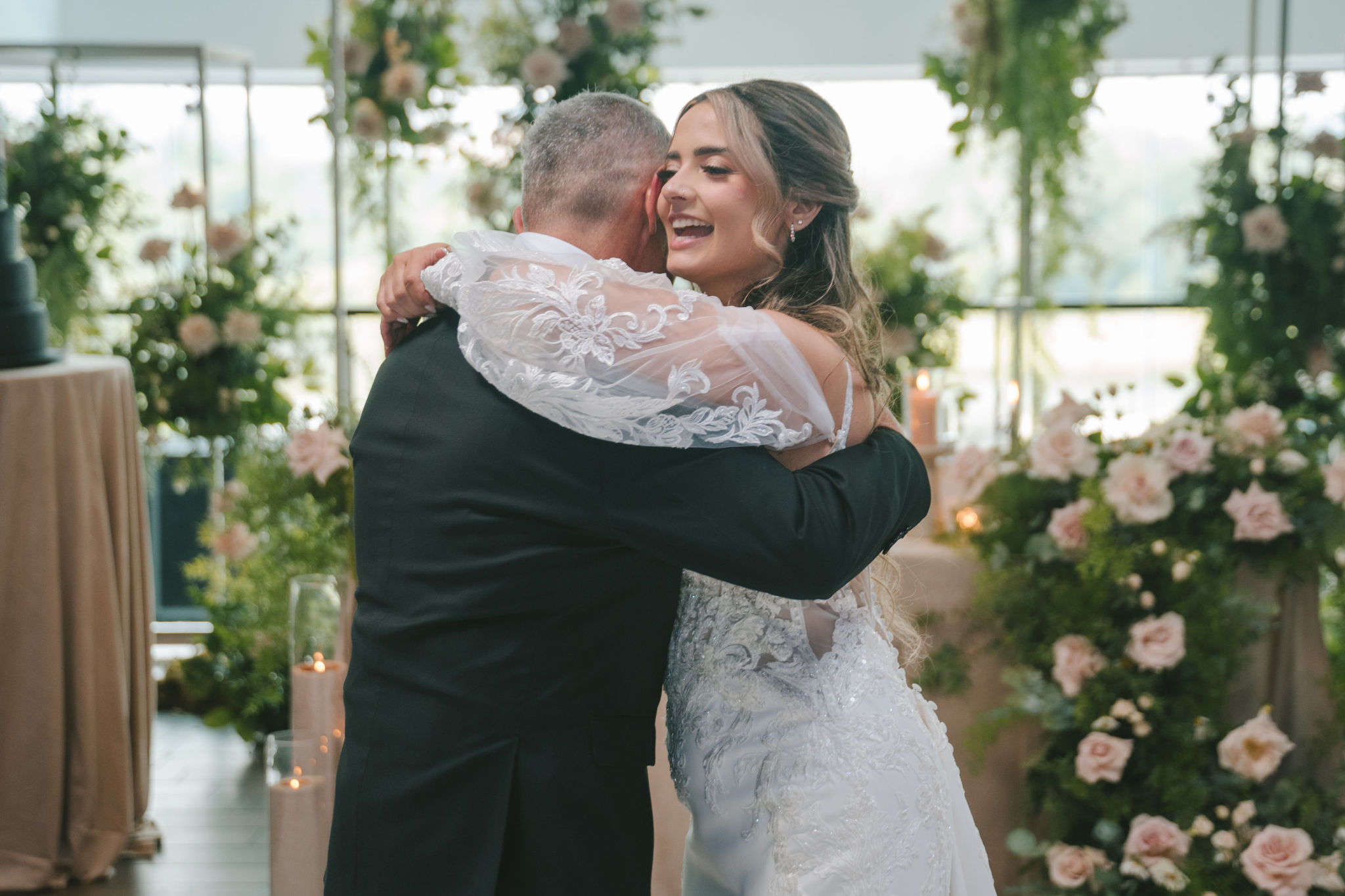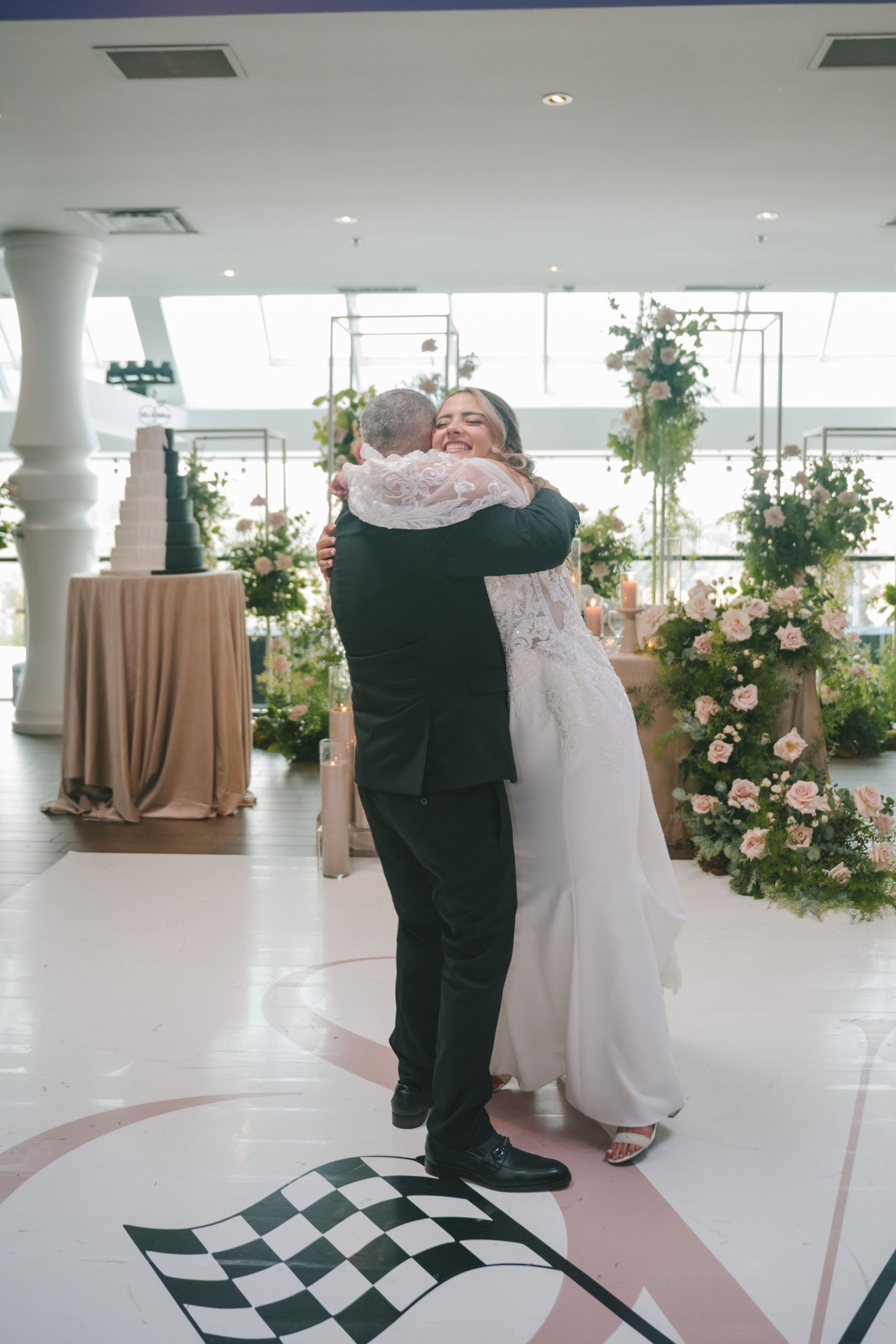 All a seamless blend of tender romance and personality. Lush greenery trailed across tables, soft pastel flowers bloomed from every centerpiece, and subtle car-themed details added a spark of fun without overpowering the elegance of the evening.