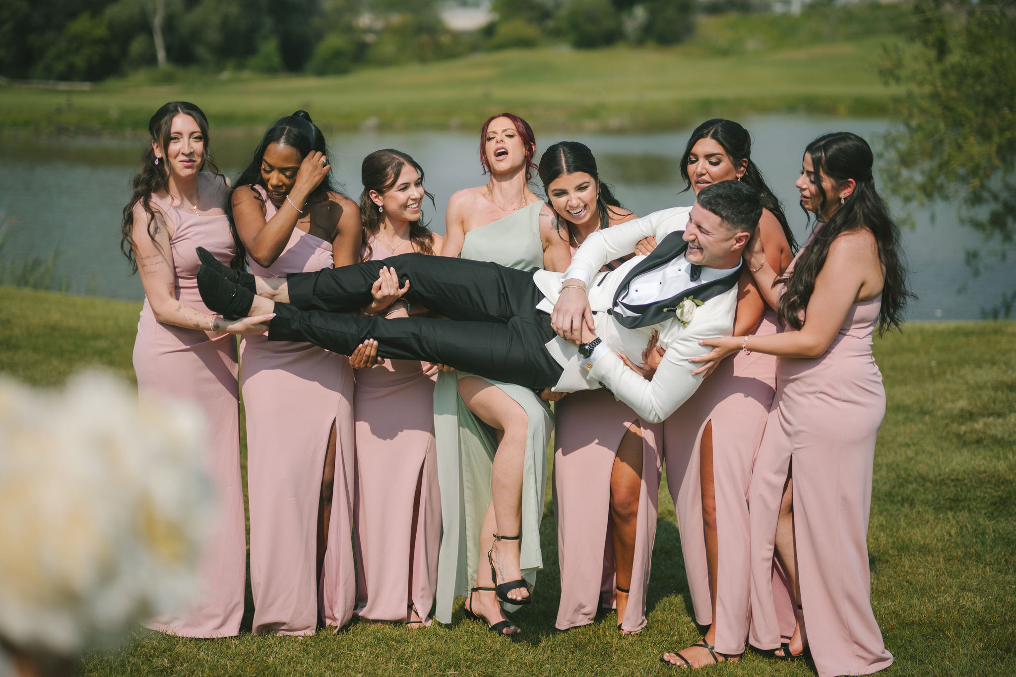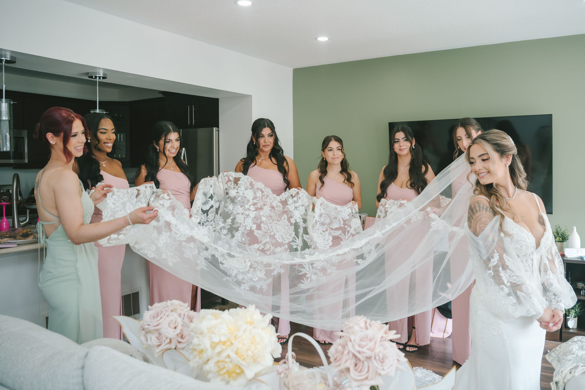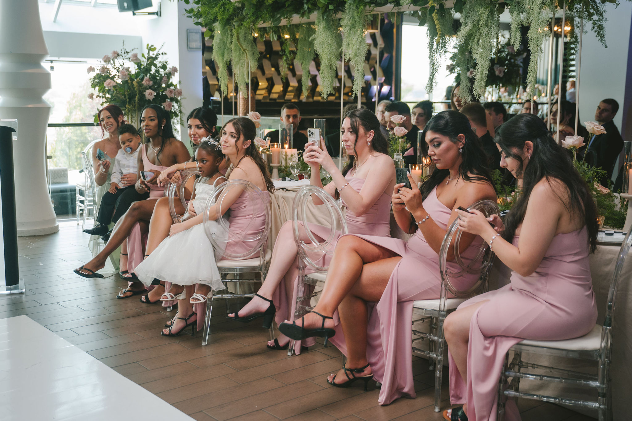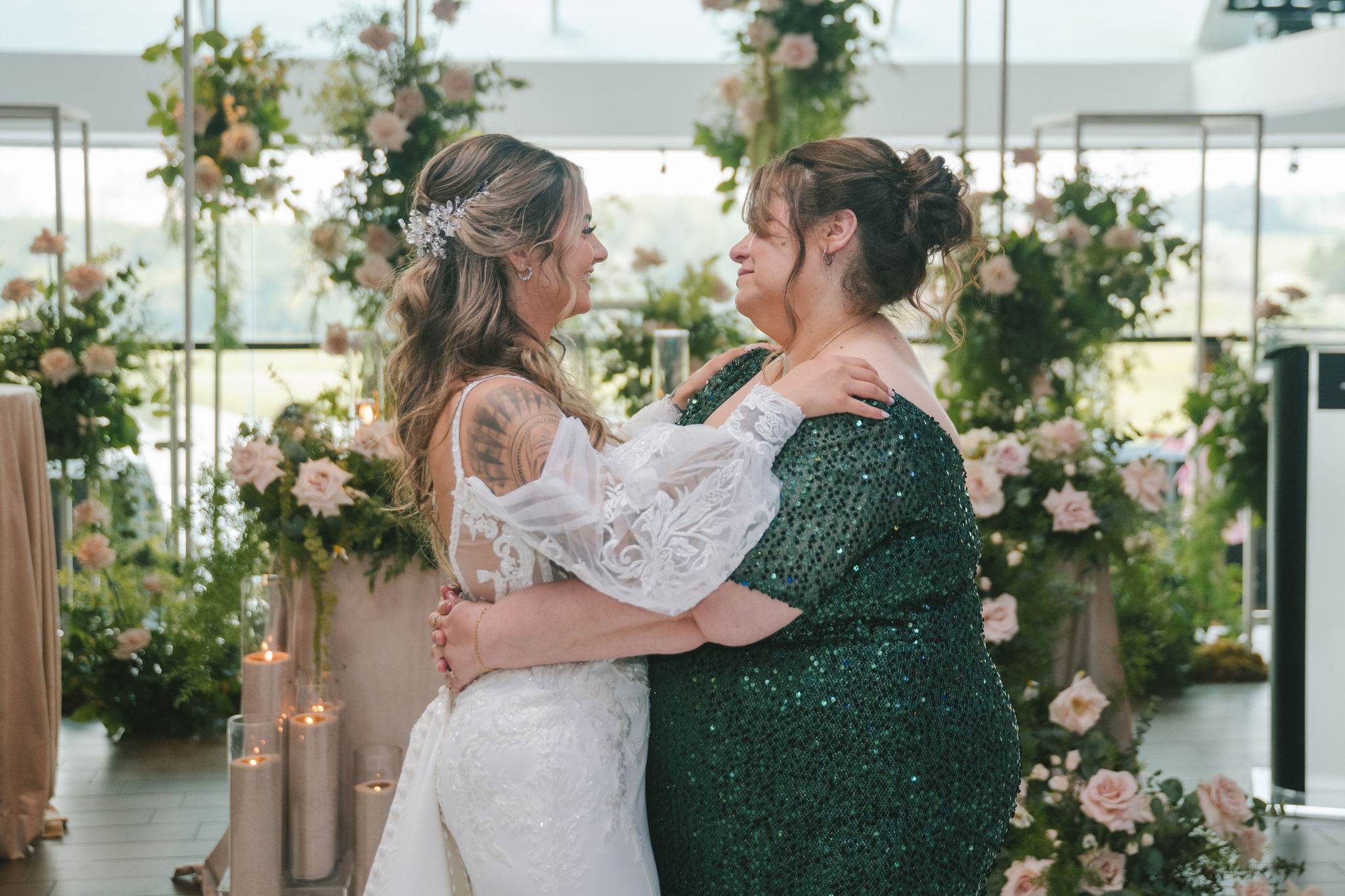 All a seamless blend of tender romance and personality. Lush greenery trailed across tables, soft pastel flowers bloomed from every centerpiece, and subtle car-themed details added a spark of fun without overpowering the elegance of the evening.