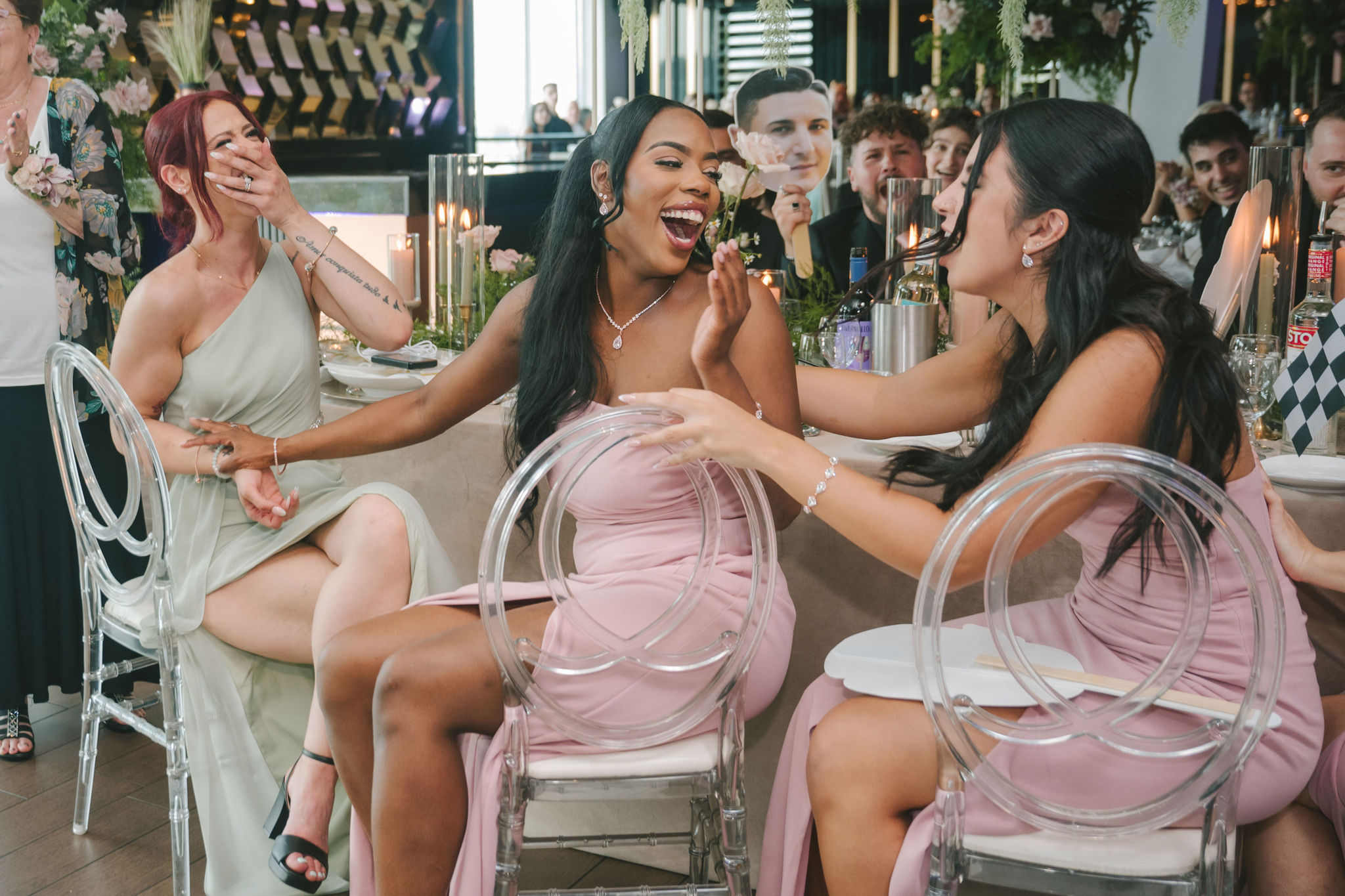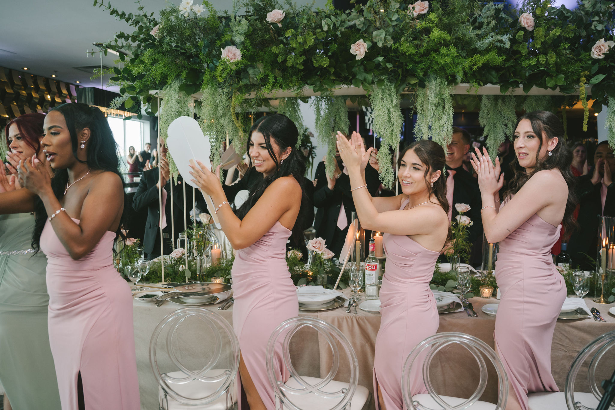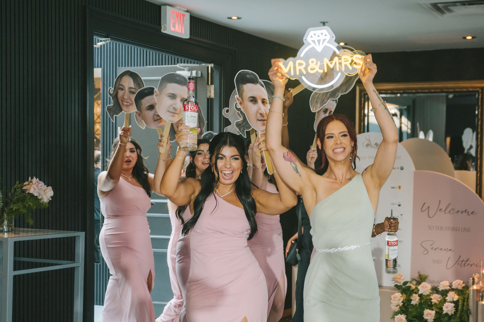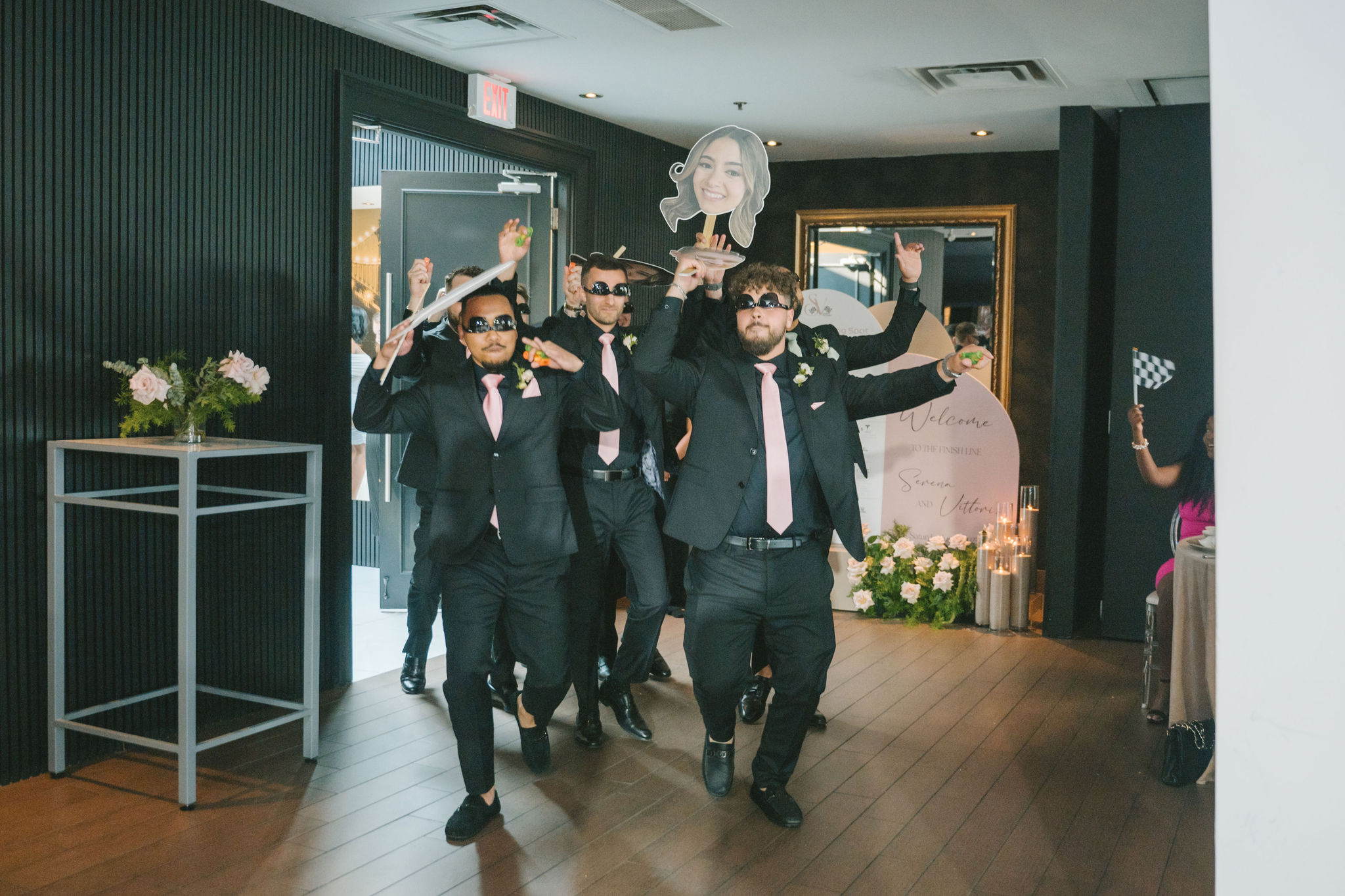 The bridal party set the tone early, with bridesmaids making their grand entrance carrying the most playful of signs, followed by the groomsmen, to the happy yells of their guests. When both Serena and Vittorio entered the room, the crowd erupted into cheers.