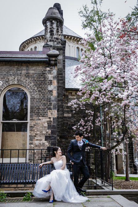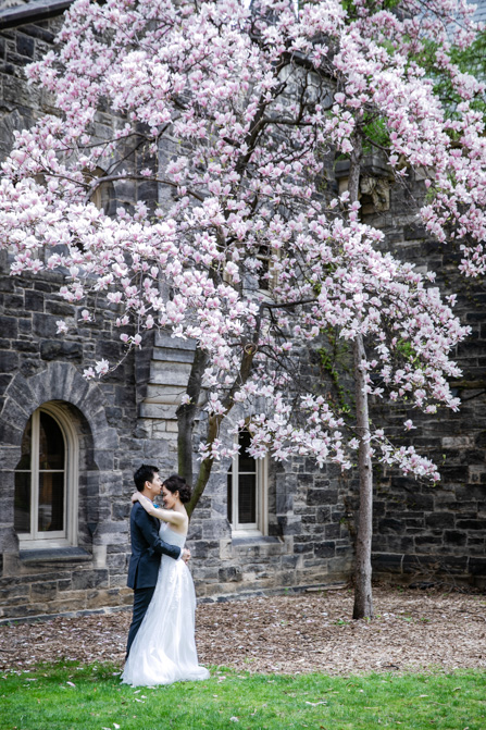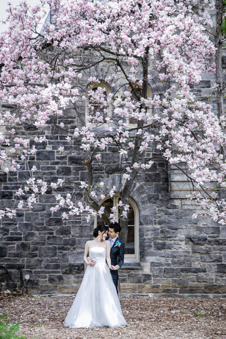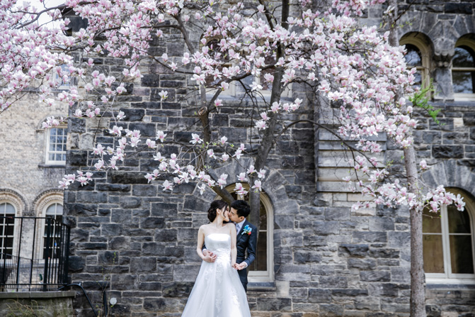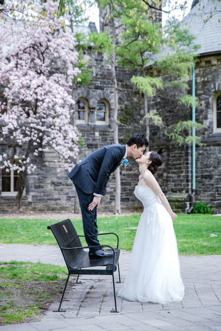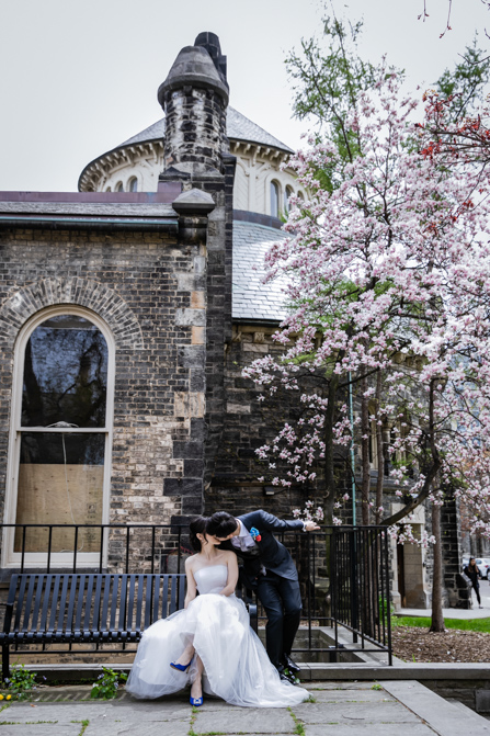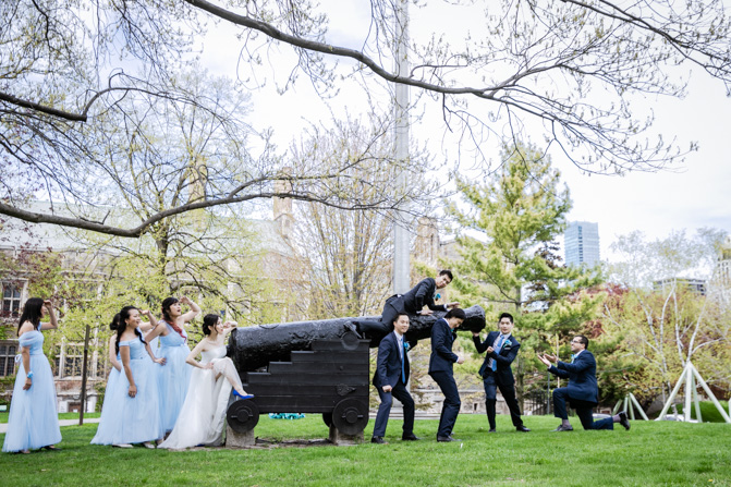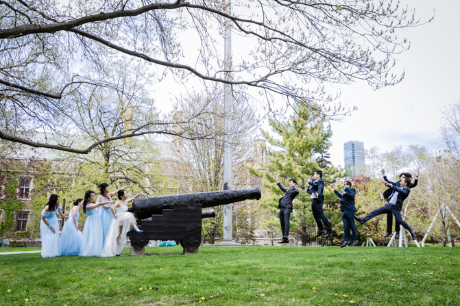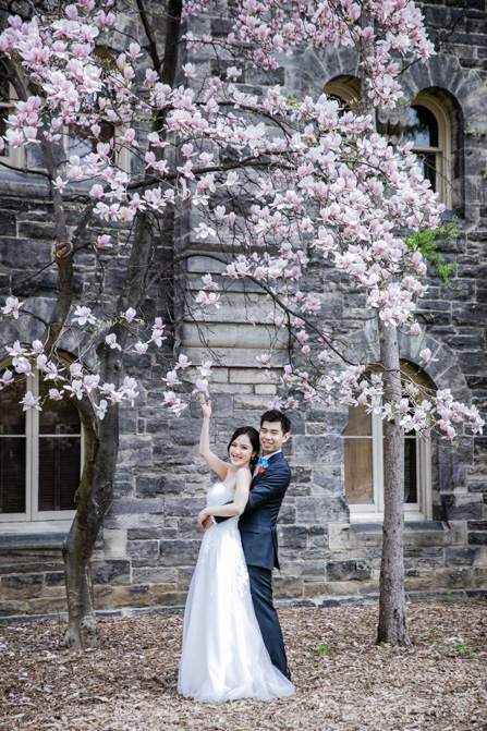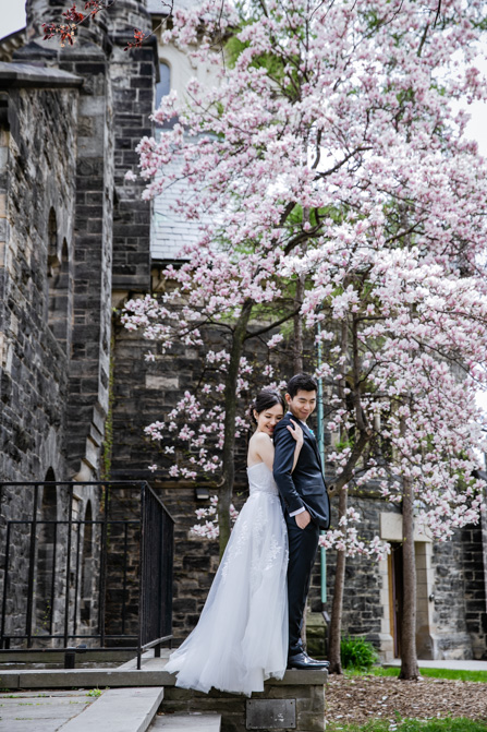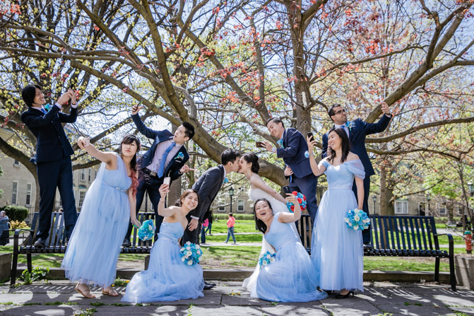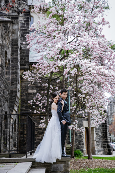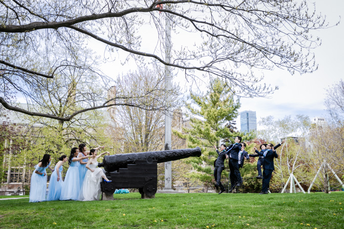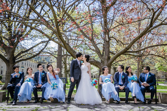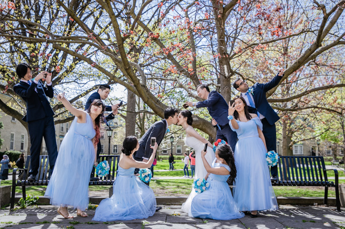 For the post-wedding couple shoot, we went to the University of Toronto, where the cherry blossoms were in full bloom. They never last long, so we felt so blessed to have this pretty floral backdrop. Lin and Timothy are a very sweet couple who looked out for each other all day long and were a joy to photograph. First, we captured intimate and romantic couple images and when their bridal party joined in for the shoot, we saw their playful sides. What a diverse collection of imagery we caught in a really short time.