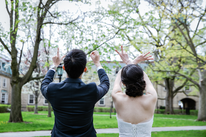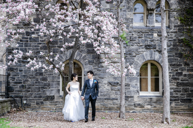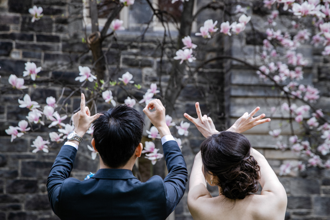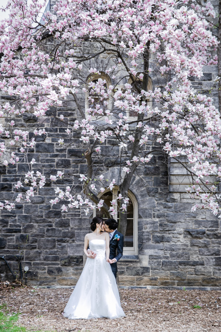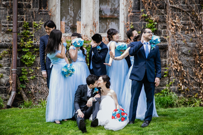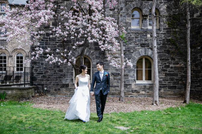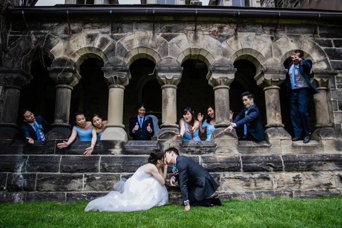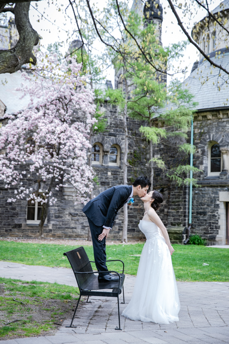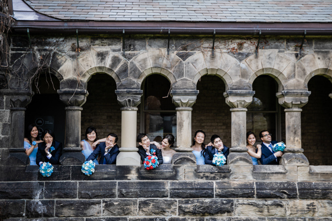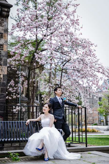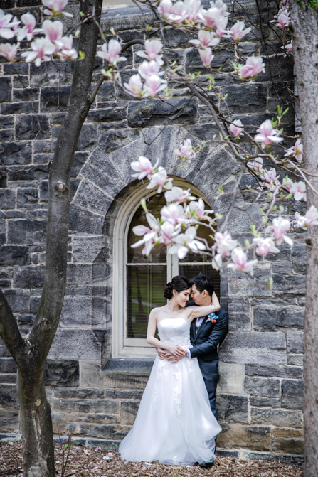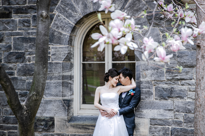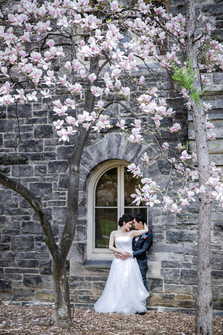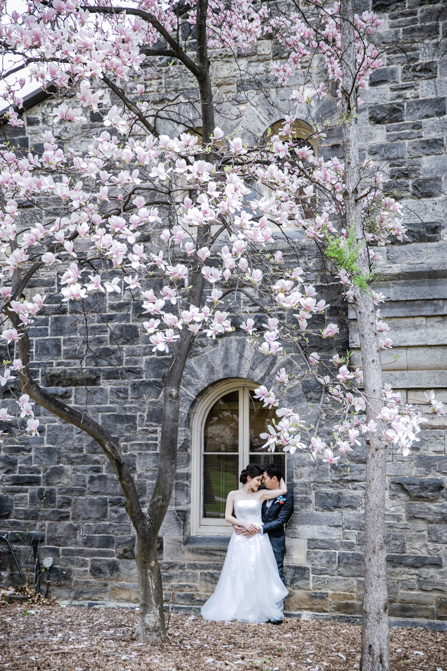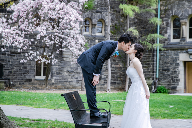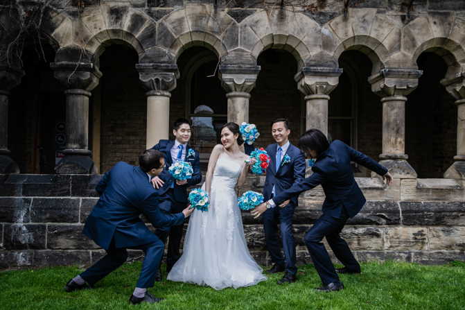 For the post-wedding couple shoot, we went to the University of Toronto, where the cherry blossoms were in full bloom. They never last long, so we felt so blessed to have this pretty floral backdrop. Lin and Timothy are a very sweet couple who looked out for each other all day long and were a joy to photograph. First, we captured intimate and romantic couple images and when their bridal party joined in for the shoot, we saw their playful sides. What a diverse collection of imagery we caught in a really short time.