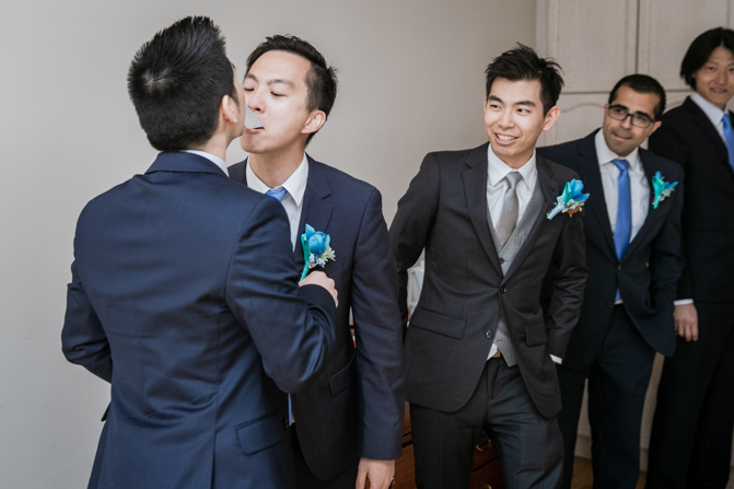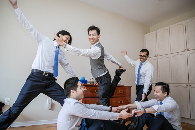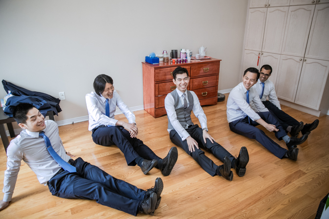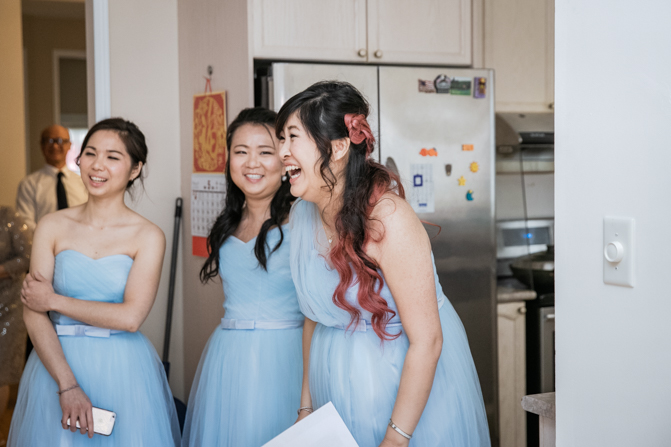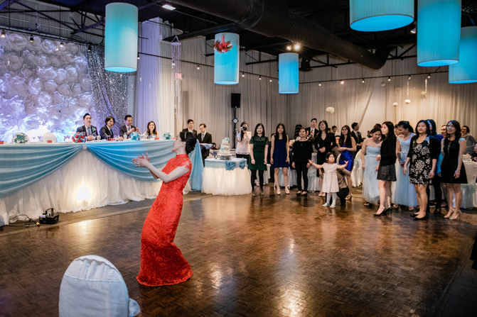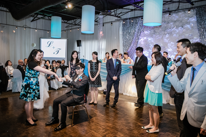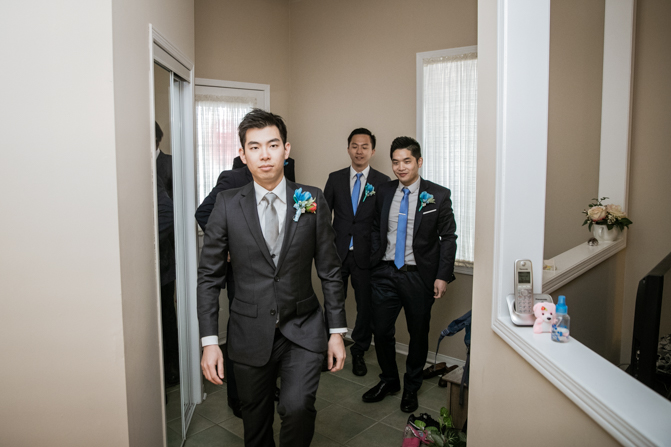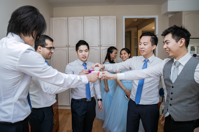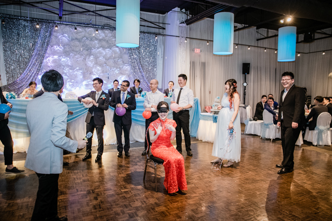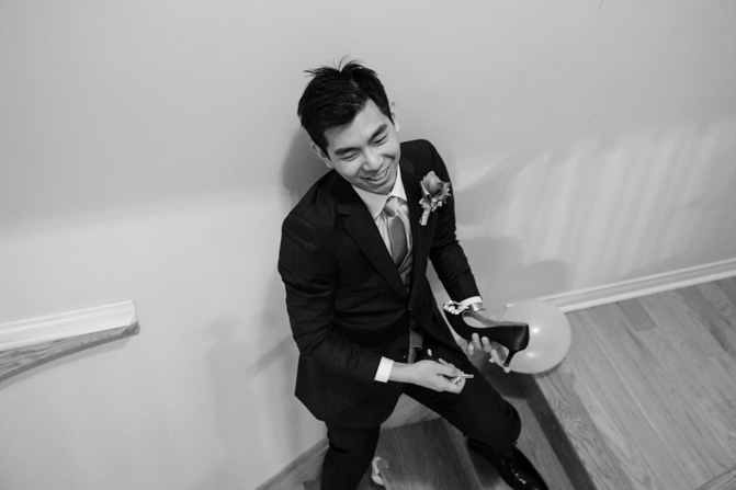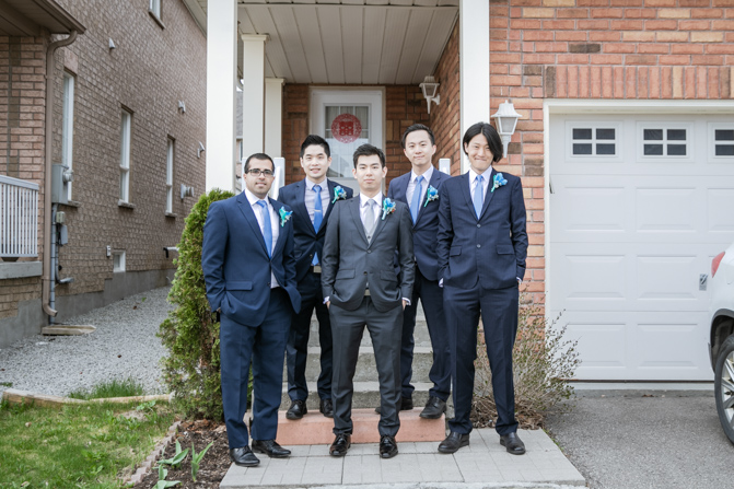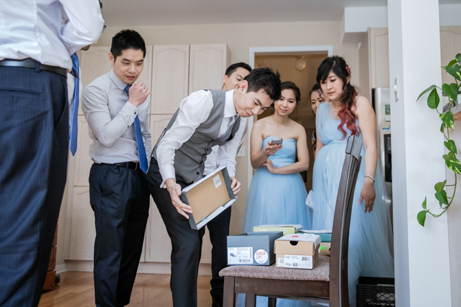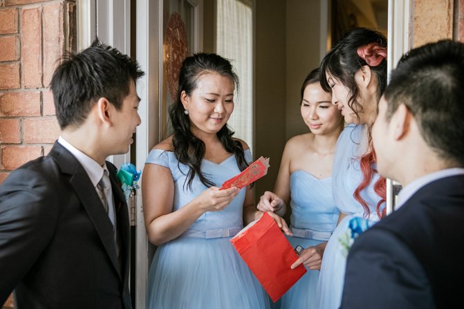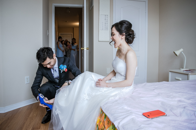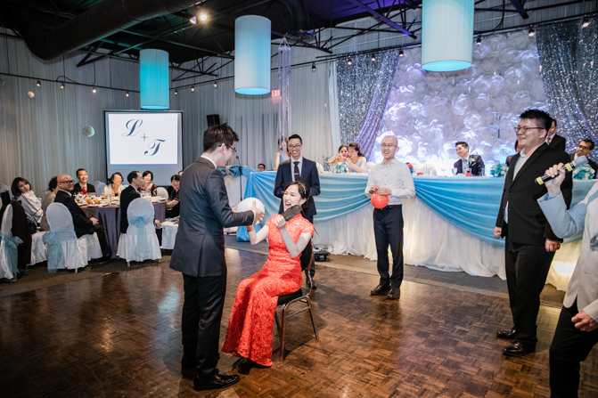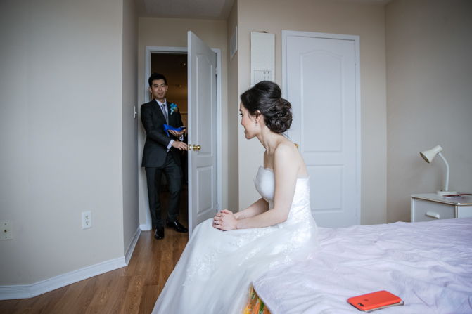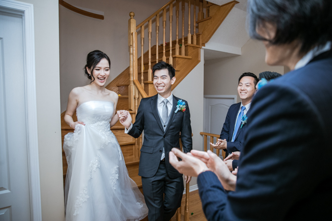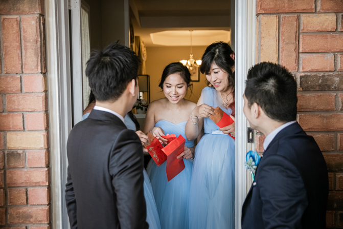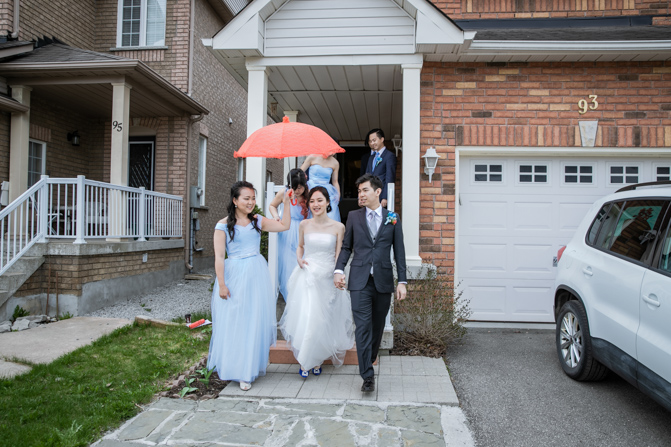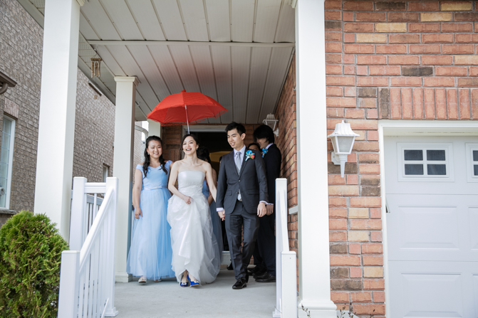 Your Toronto wedding photographer can’t get enough of the hilarious Chinese door games. After some dancing, stretching and funny activities, finally, the girls let Timothy upstairs to see his bride. It was a special moment as they saw each other and right at that moment, a little rain began to fall. It’s good luck, as they say and Lin’s mom had a red umbrella ready.