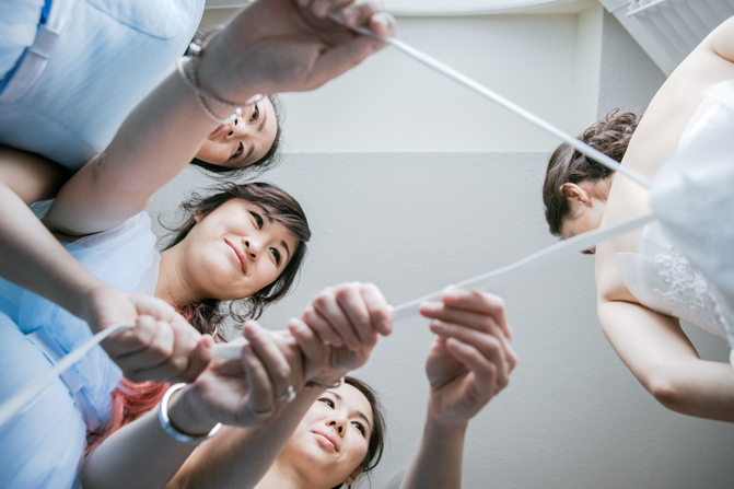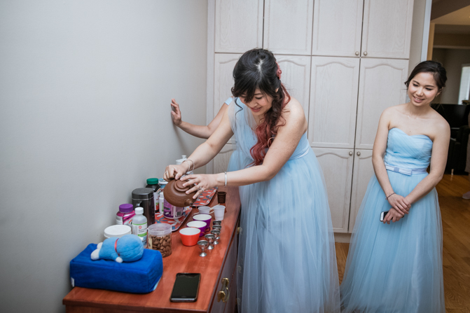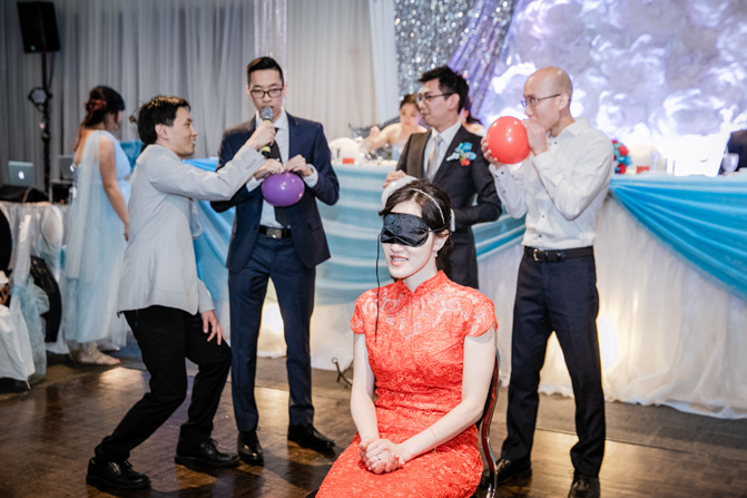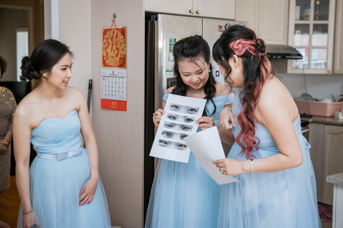 Lin got ready with her bridesmaids, who wore baby blue dresses in mismatched styles. As much as they were having fun getting ready, they couldn’t wait for the wedding door games. They had prepared some tricky tasks for the groom and his side of the bridal party.