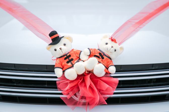 The car to take the couple to the church was decorated with red ribbons and two teddy bears in Chinese wedding outfits and it got them to the church on time.