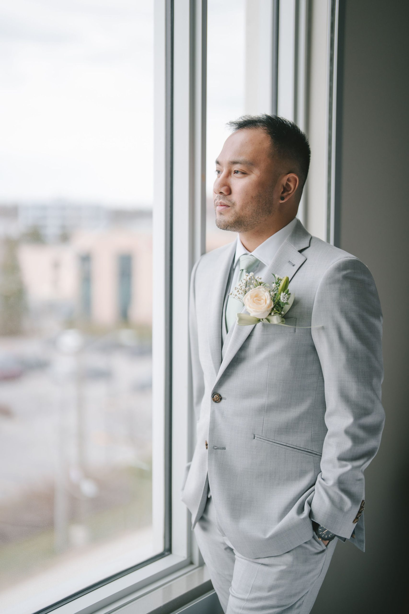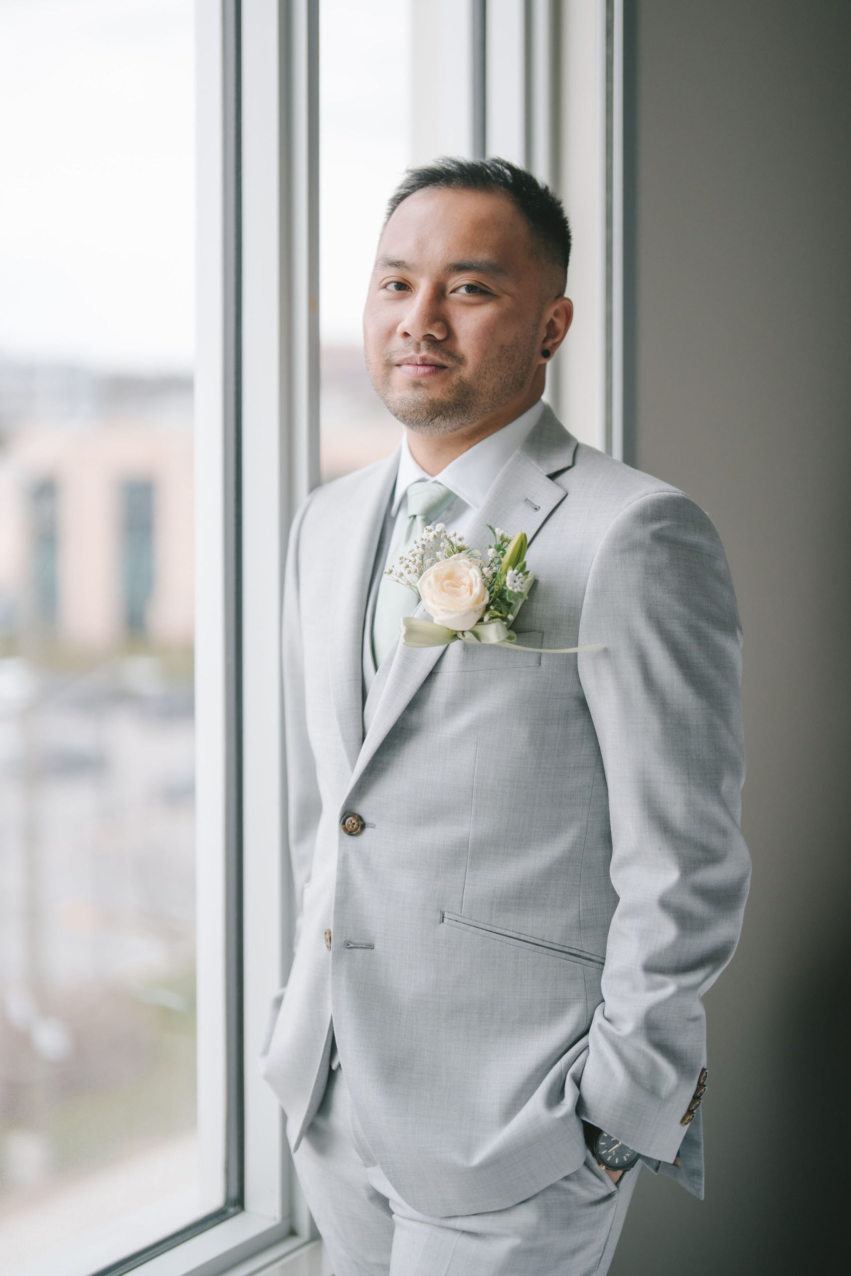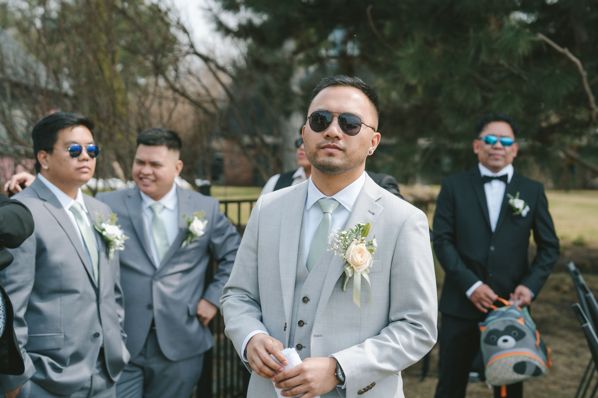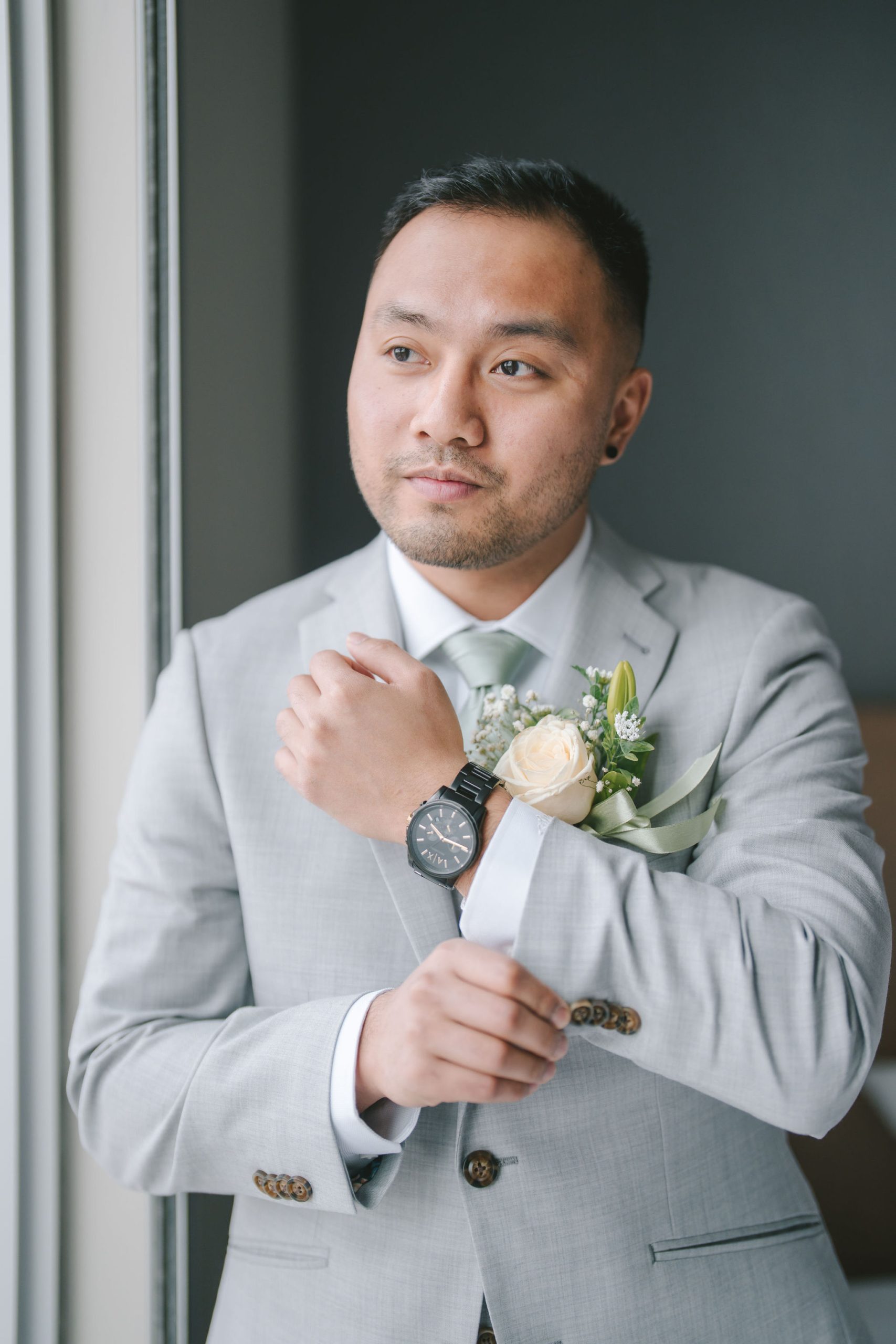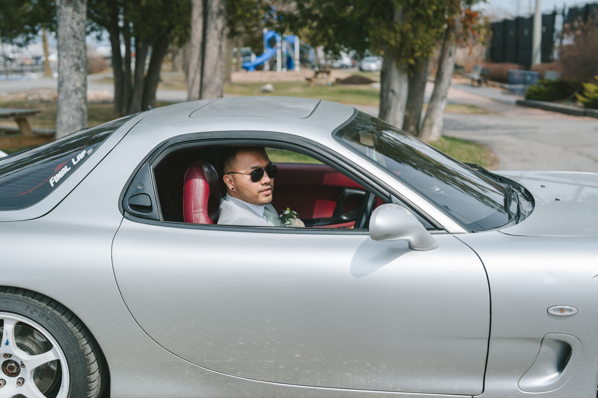 Afterwards, we decided to transfer outdoors for a wider variety of photographs. And Jason did not disappoint. He drove in style. His car looked sleek and almost vintage-like. He was wearing a light grey suit with a sage green tie.