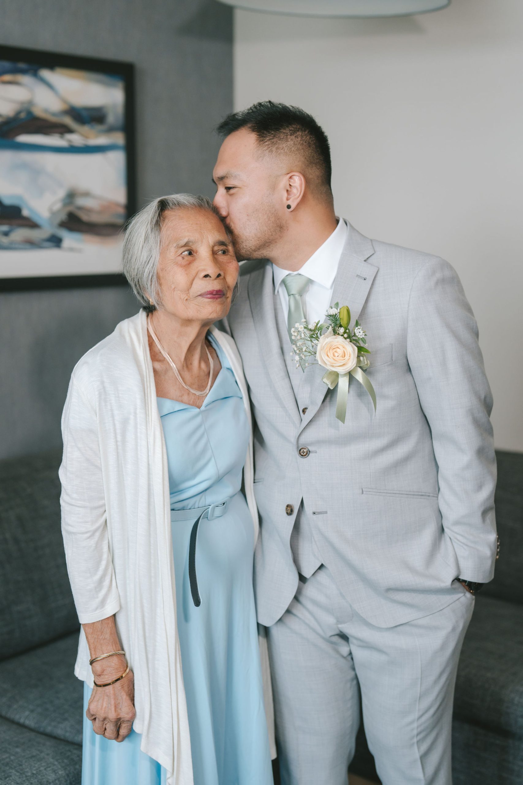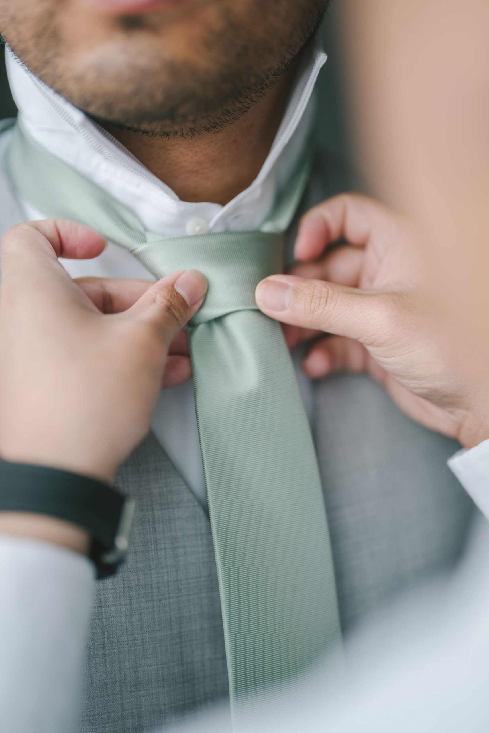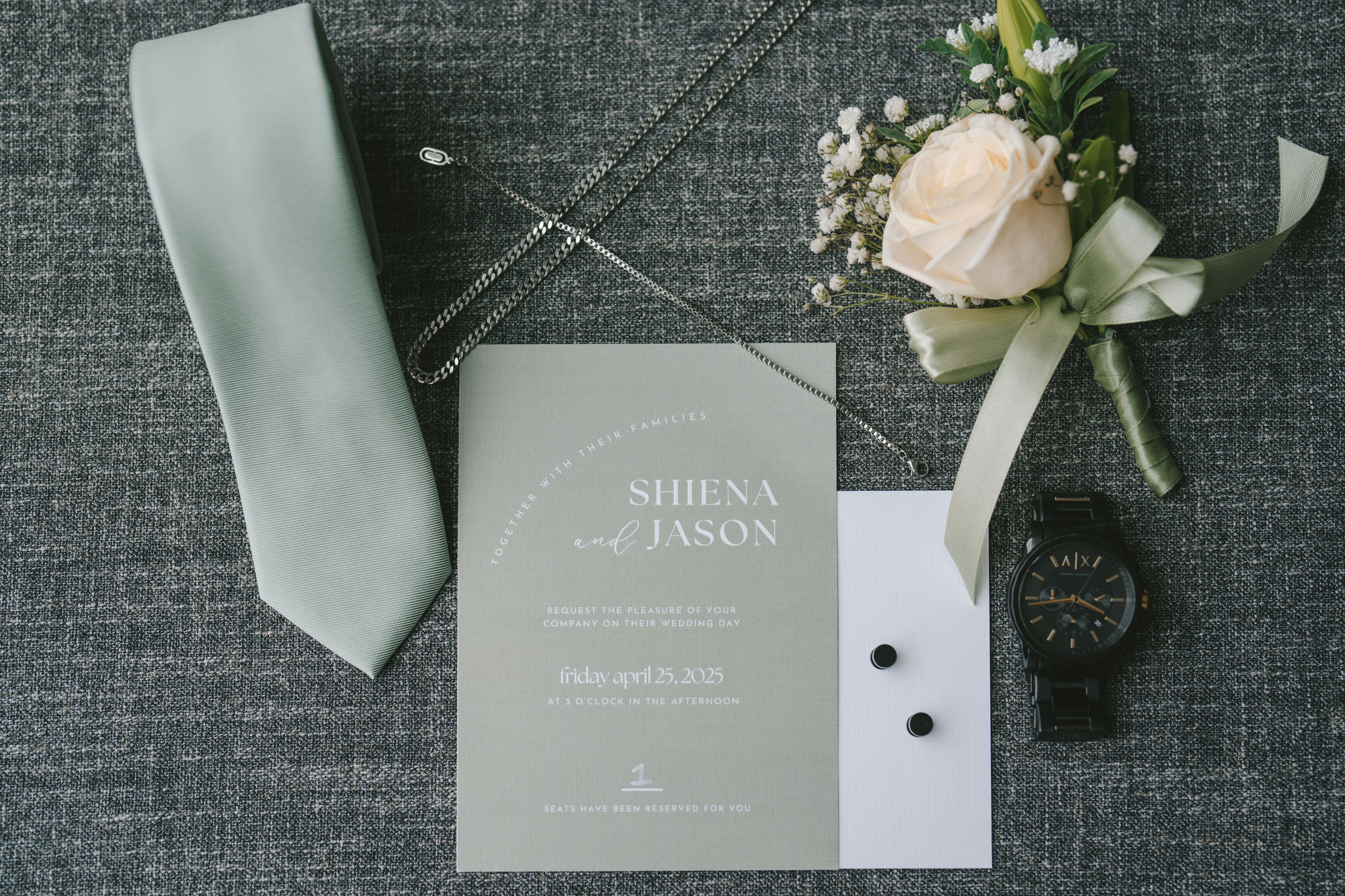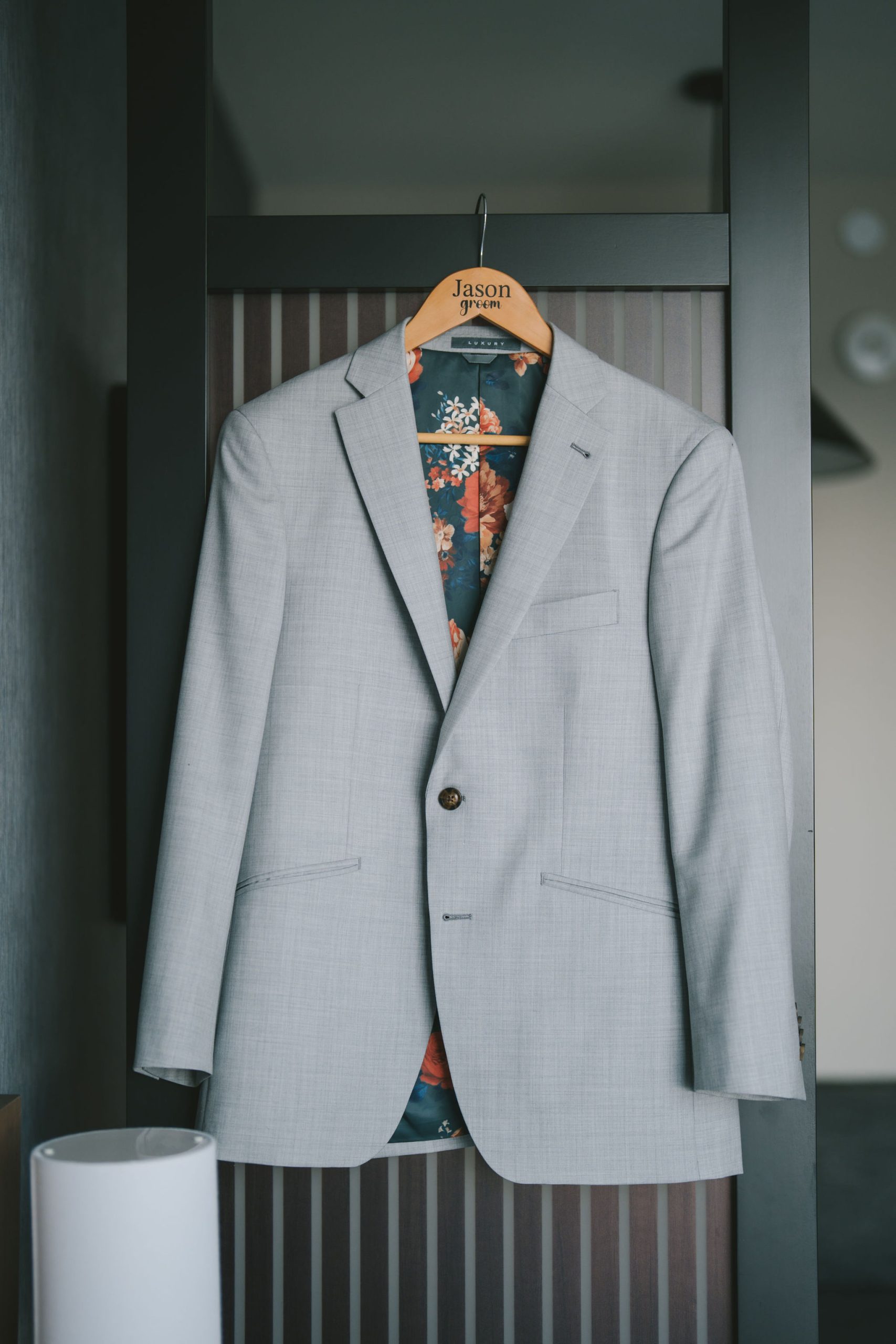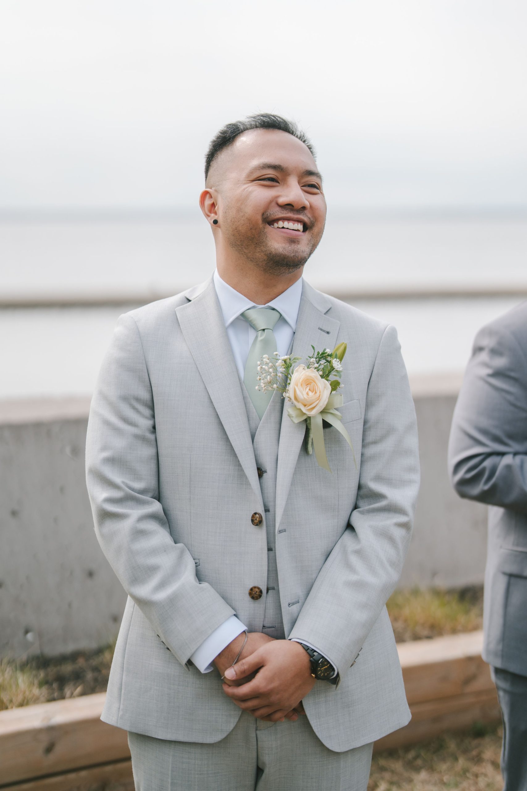 Afterwards, we decided to transfer outdoors for a wider variety of photographs. And Jason did not disappoint. He drove in style. His car looked sleek and almost vintage-like. He was wearing a light grey suit with a sage green tie.