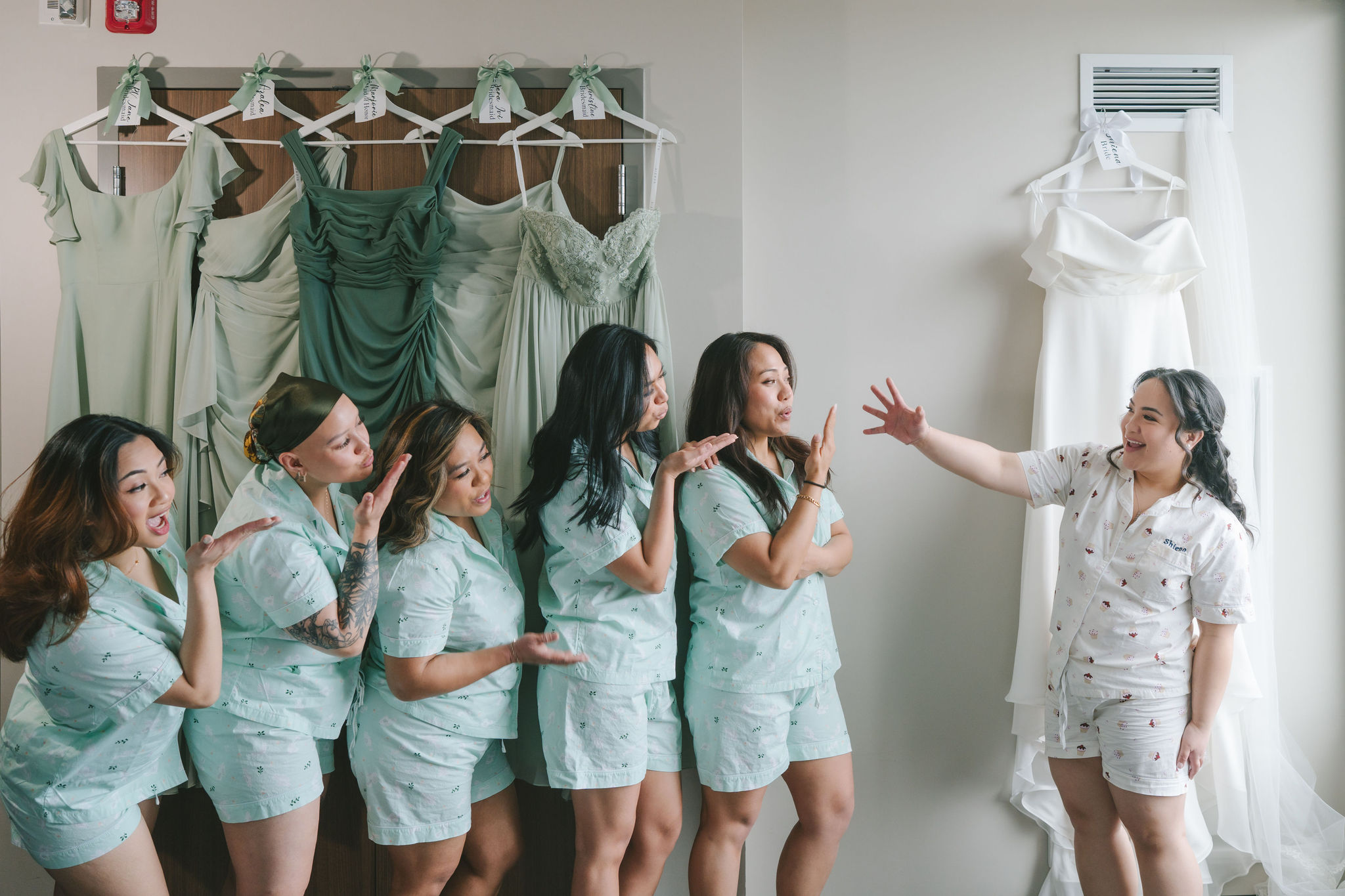 For their photoshoot, she wanted to execute three ideas with her bridesmaids. For the first one, they would be standing in front of their dresses, including Shiena, and they blew a kiss at the bride’s direction. They all looked so adorable!