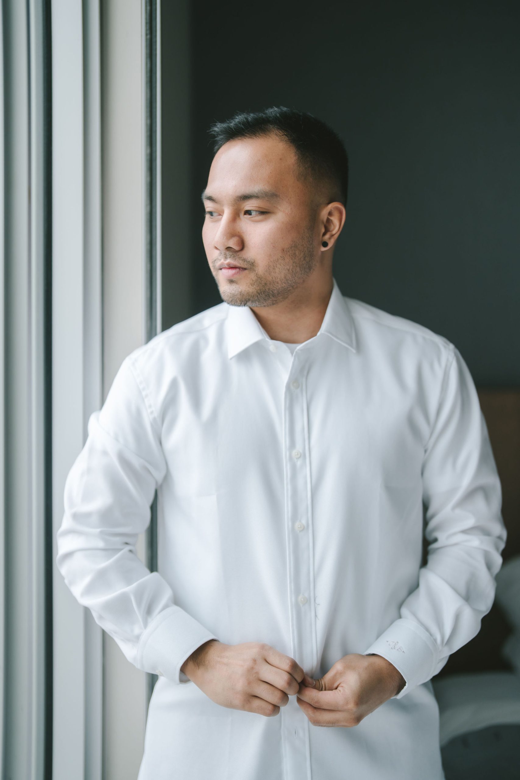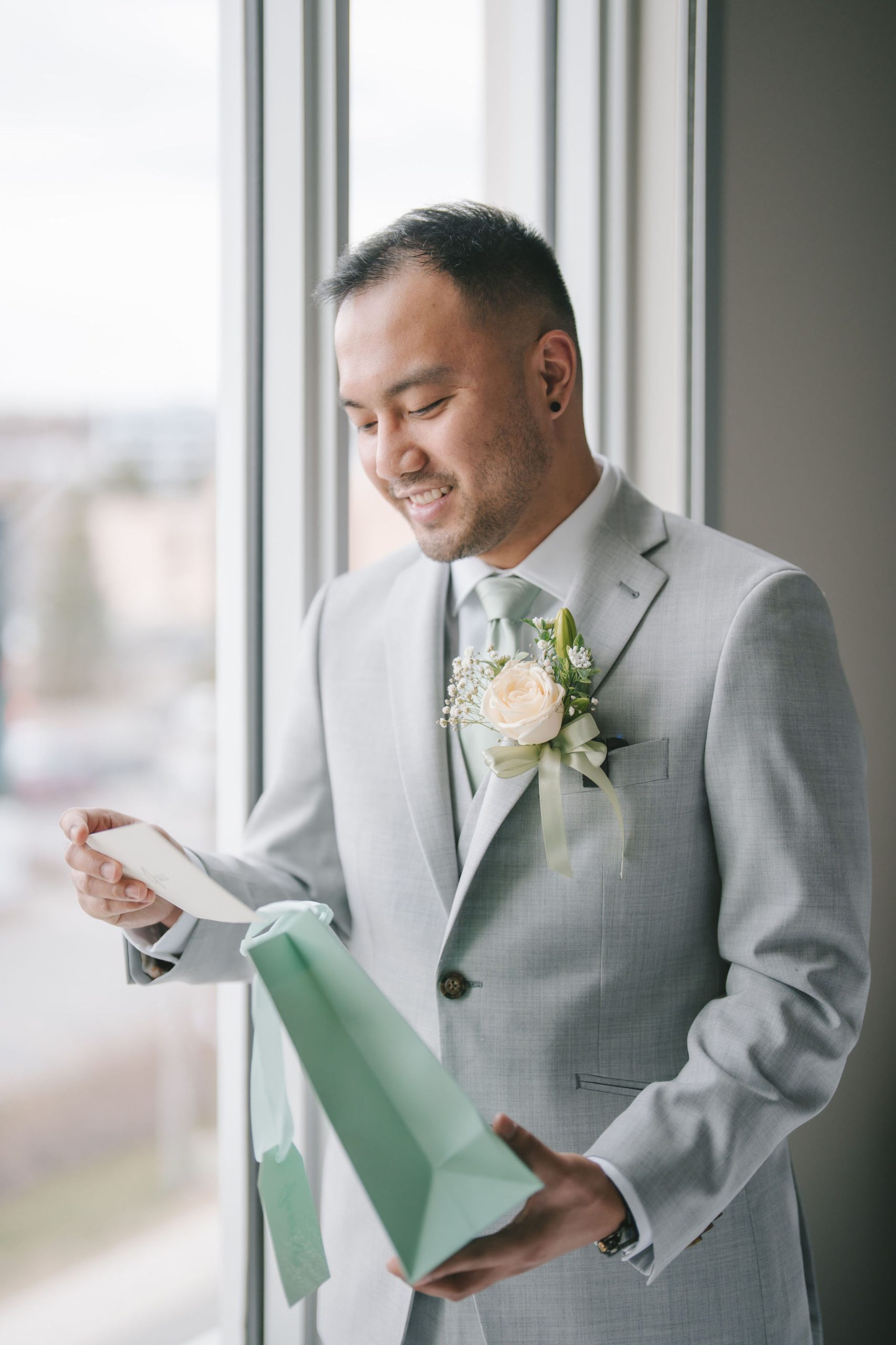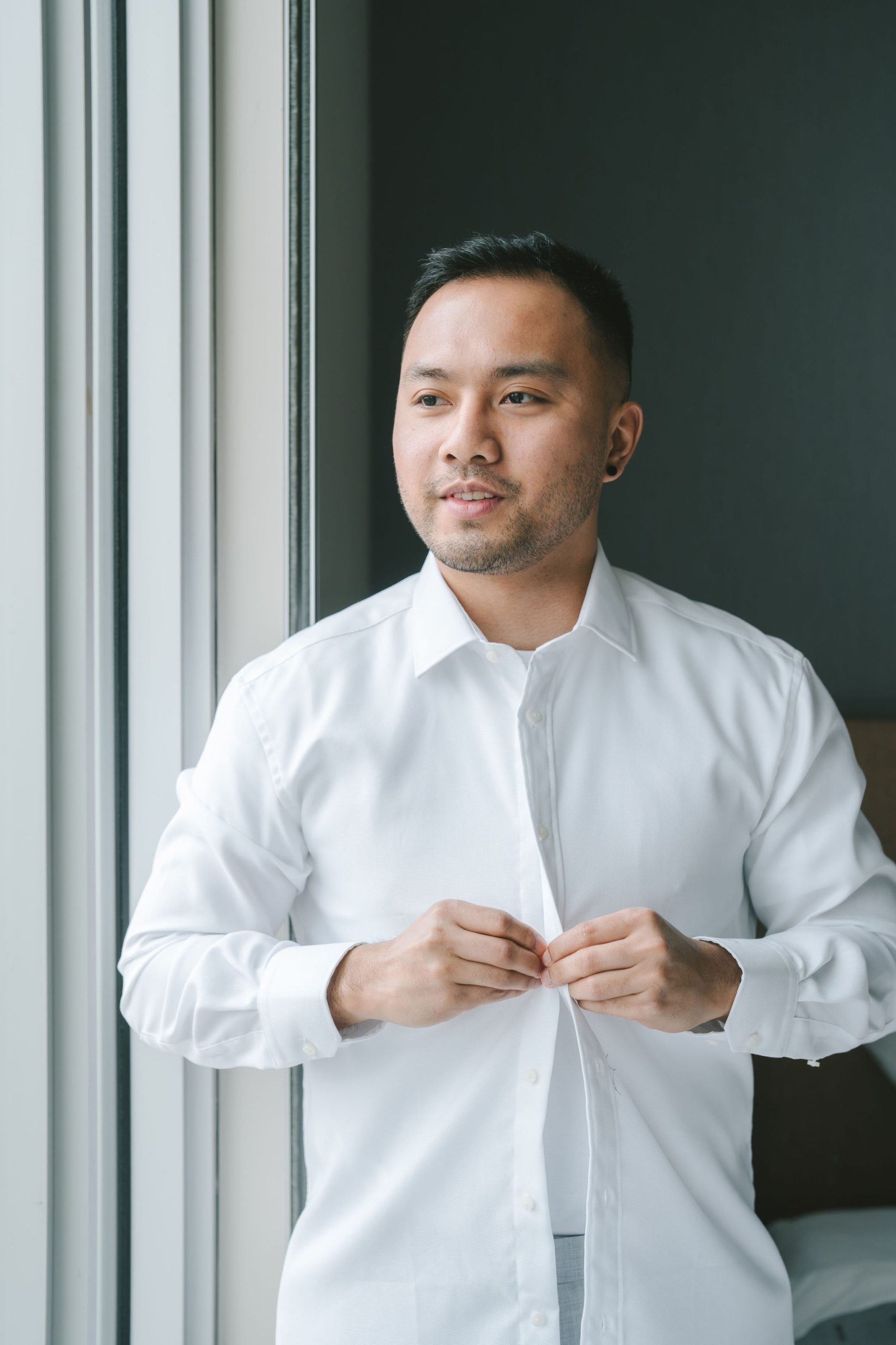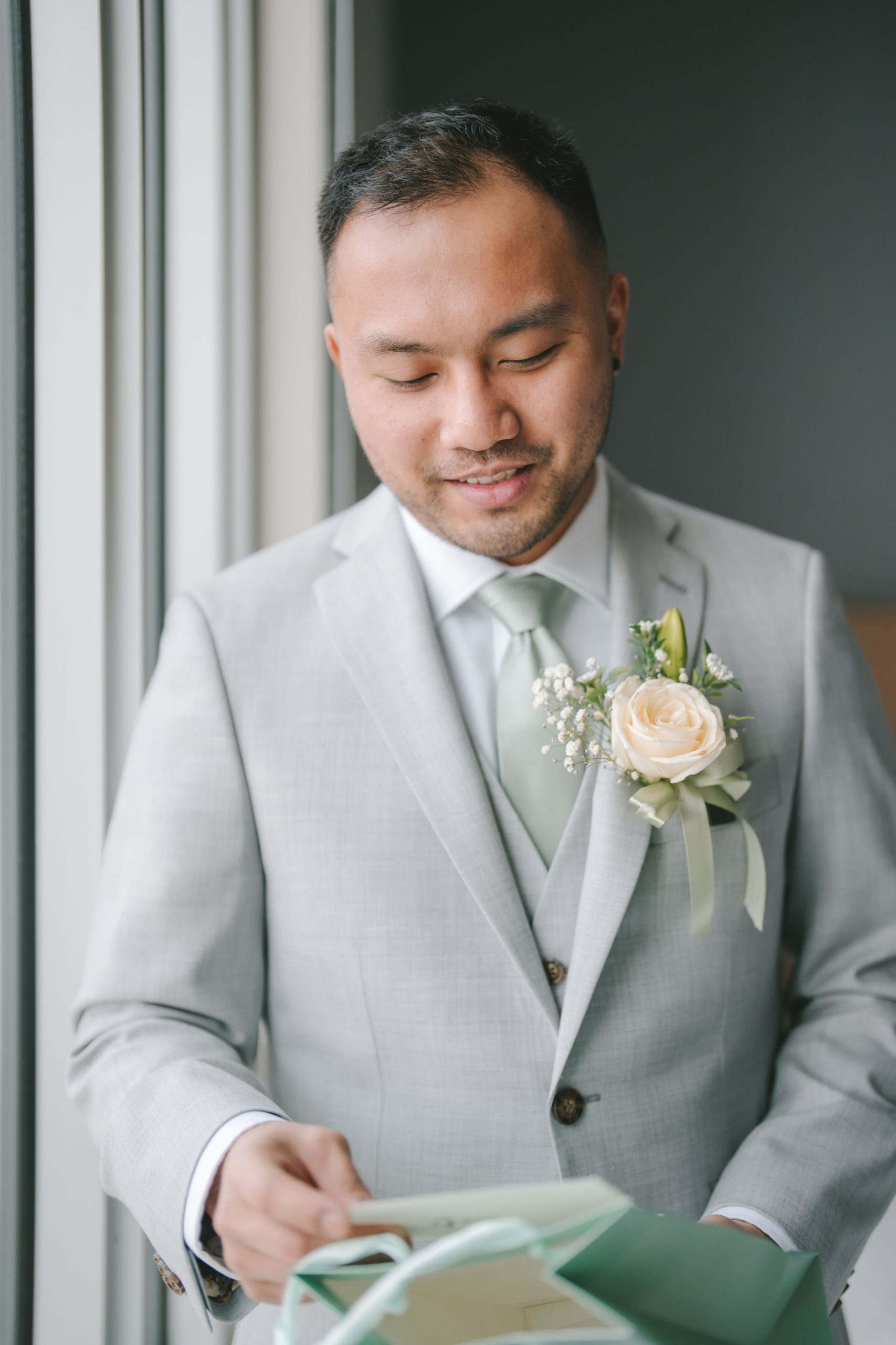 As for Jason, his pictures felt a lot more personable and calm. He and the groomsmen took turns being photographed by me. And because the only source of light was through their hotel window, I had them stand right by the window so that all of their faces would be illuminated equally. While Jason continued to dress up, I snapped pictures of the groomsmen with their personalized gifts. Every one of them smiled so happily and gratefully with the hangers in hand.