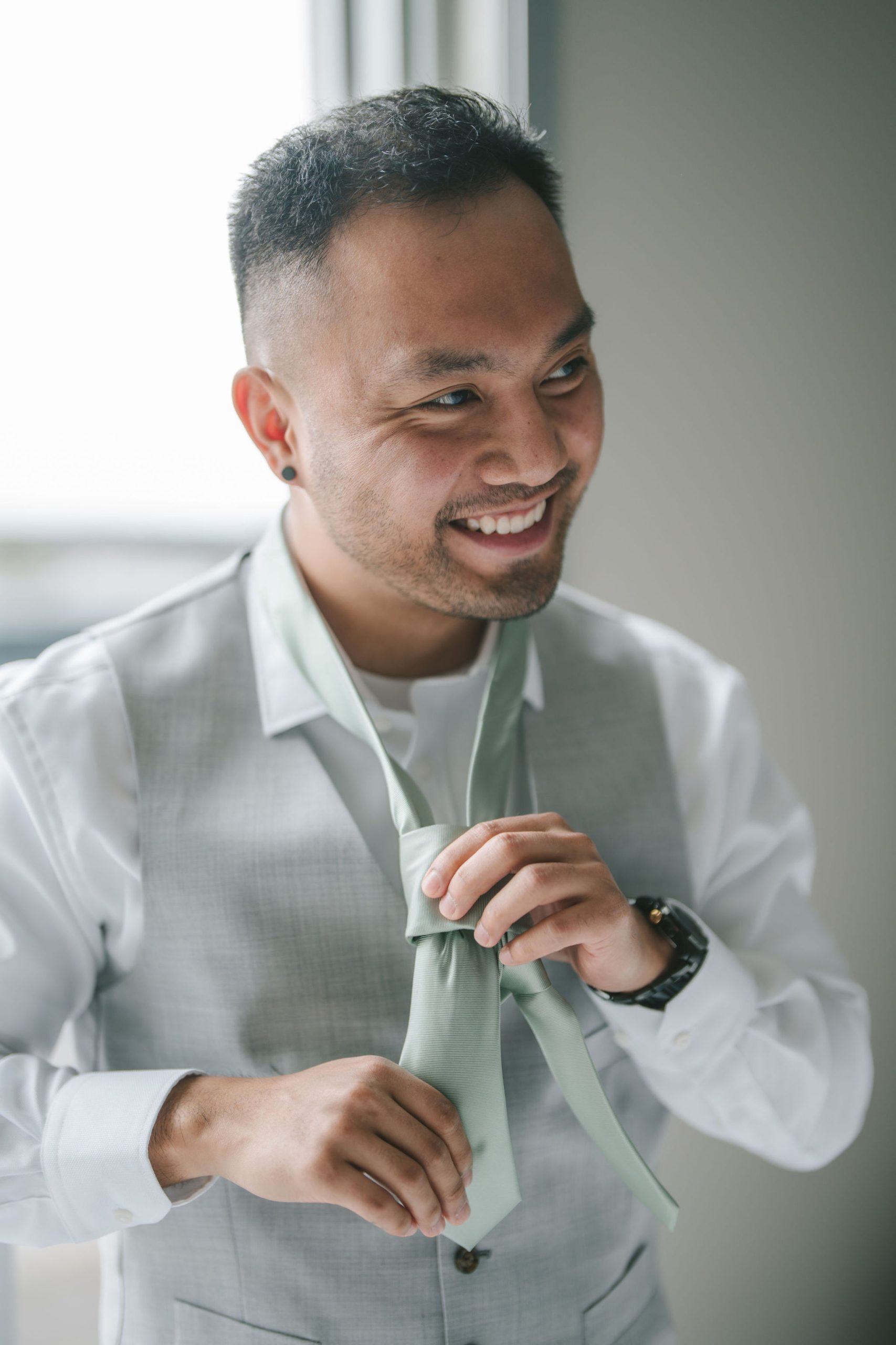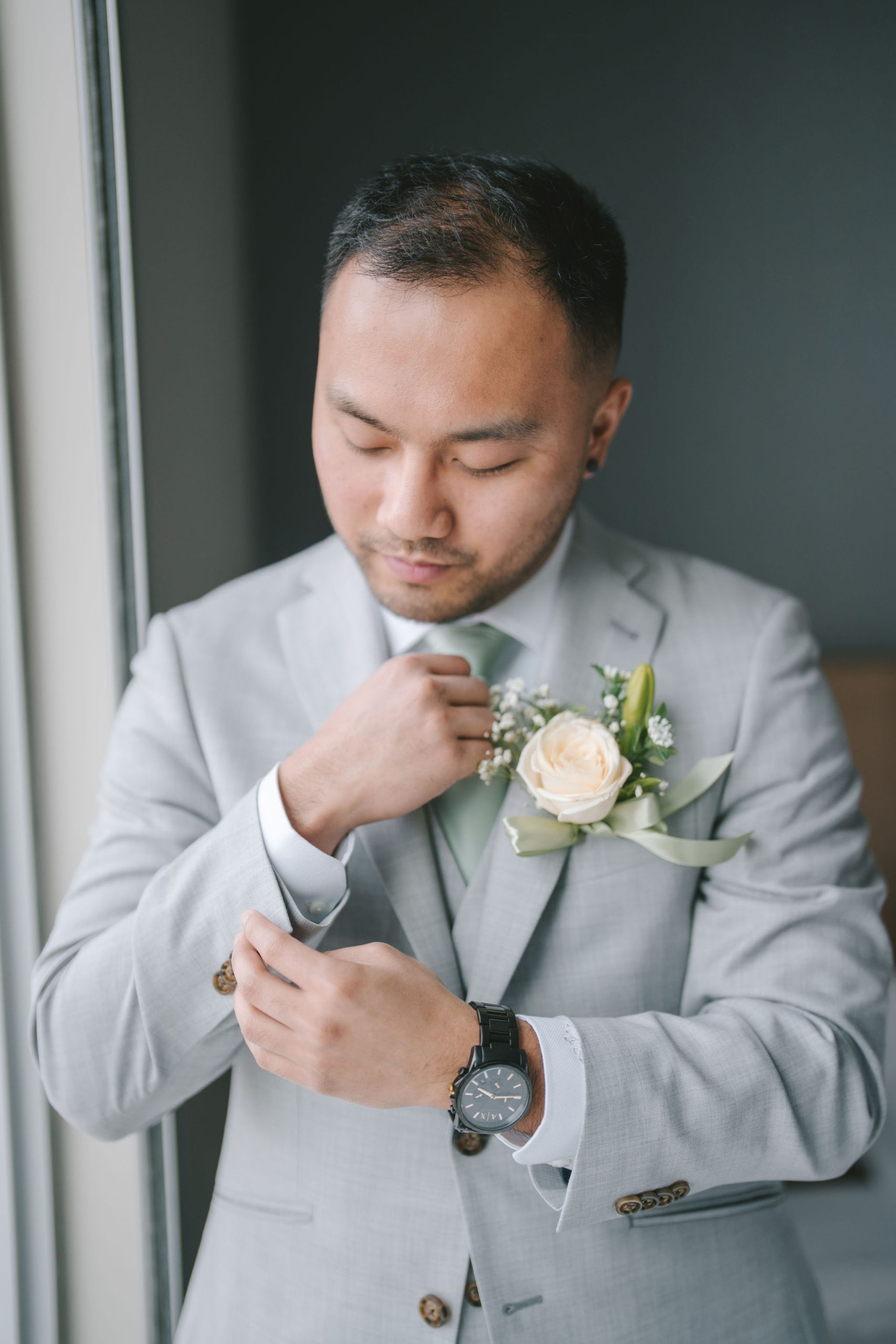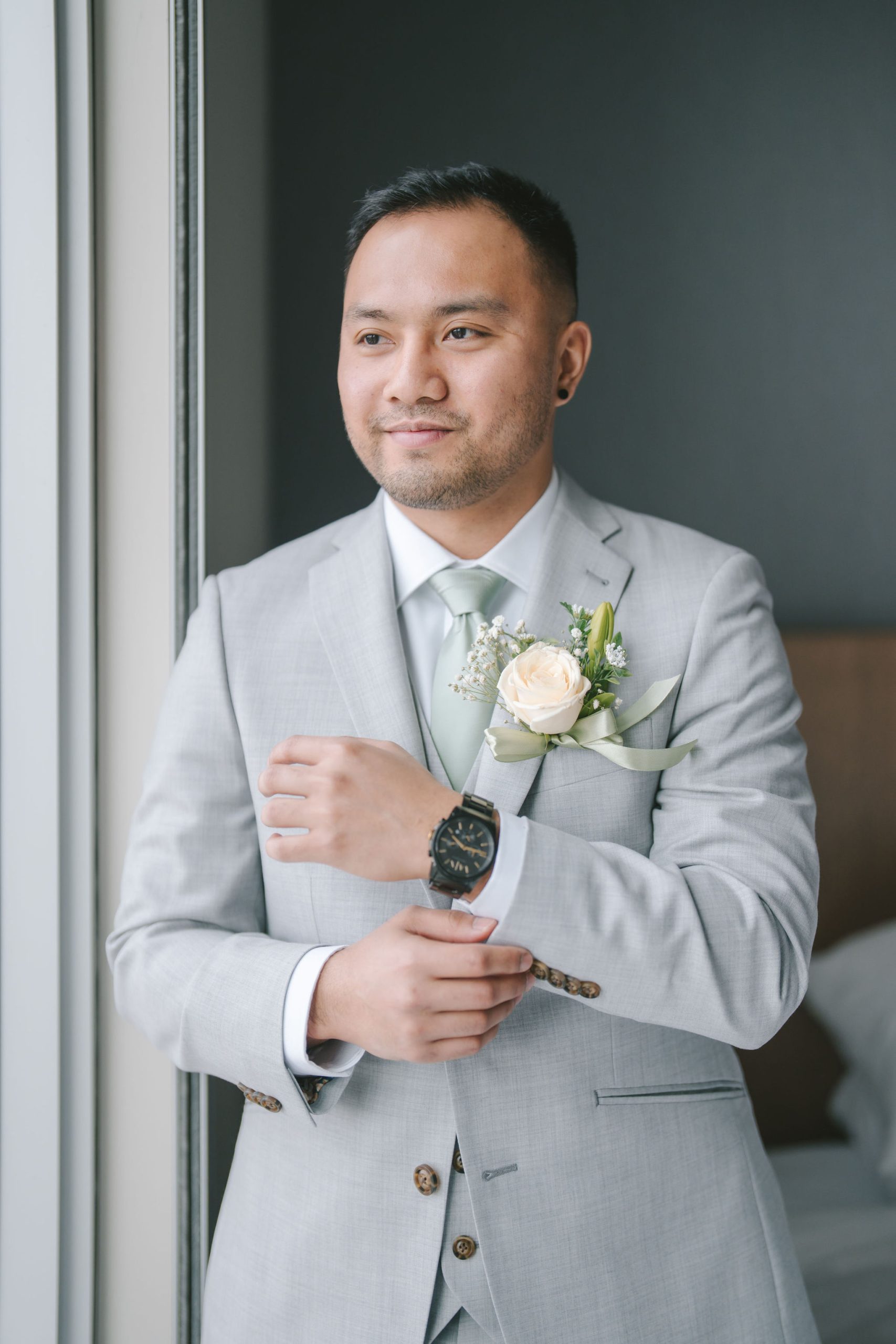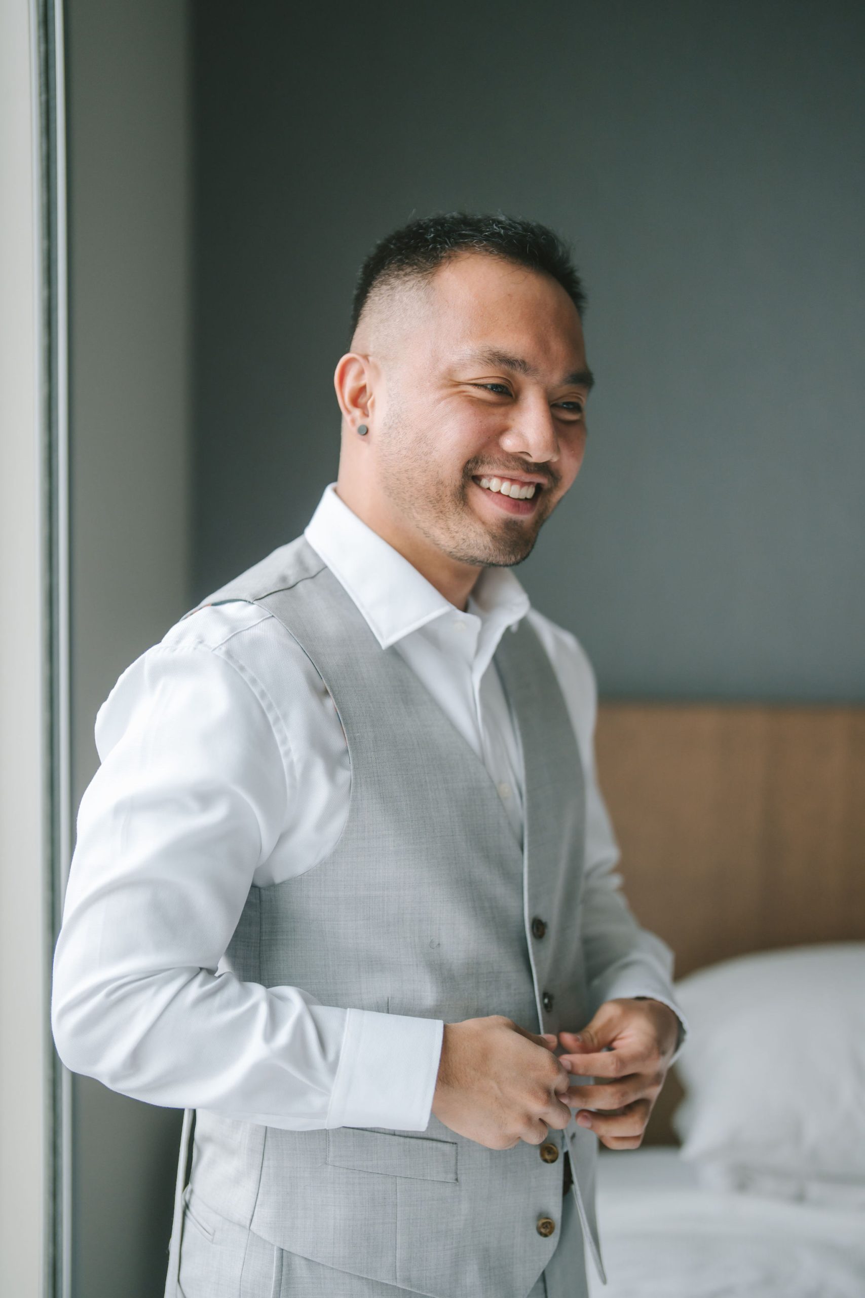 As for Jason, his pictures felt a lot more personable and calm. He and the groomsmen took turns being photographed by me. And because the only source of light was through their hotel window, I had them stand right by the window so that all of their faces would be illuminated equally. While Jason continued to dress up, I snapped pictures of the groomsmen with their personalized gifts. Every one of them smiled so happily and gratefully with the hangers in hand.