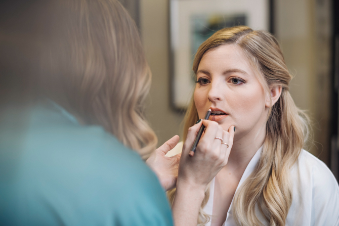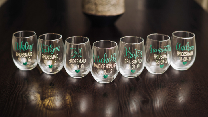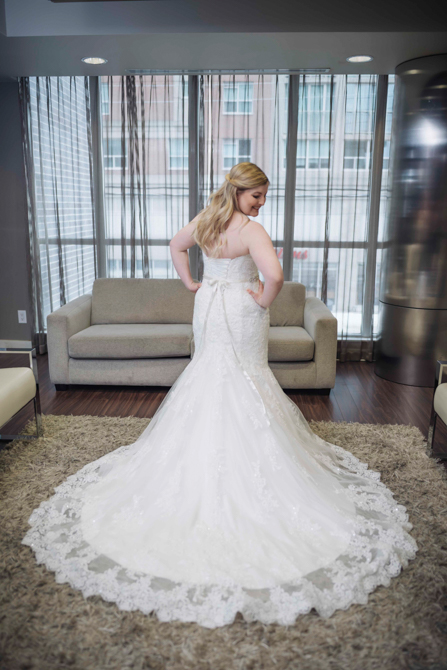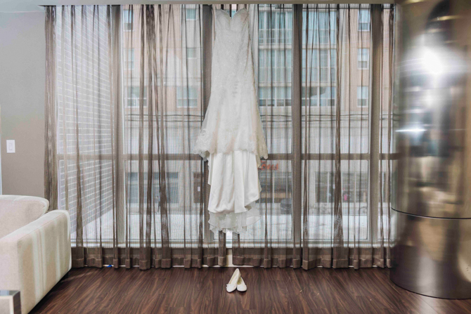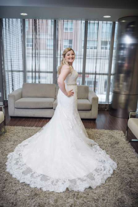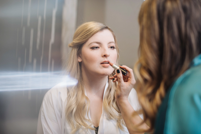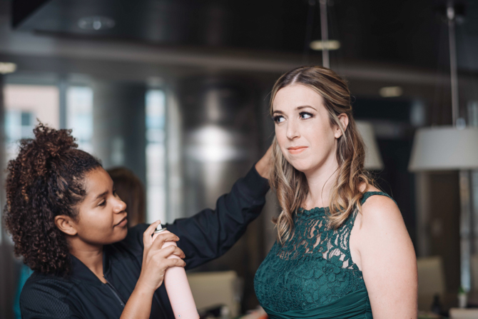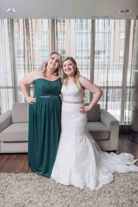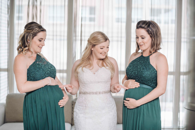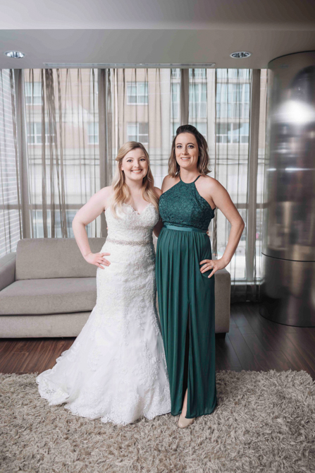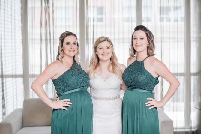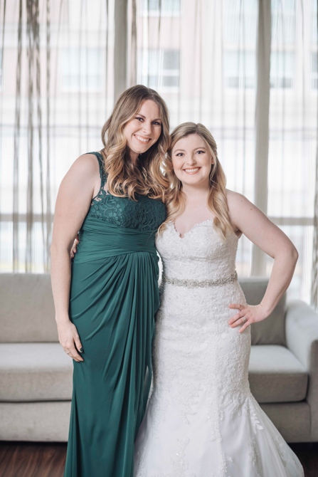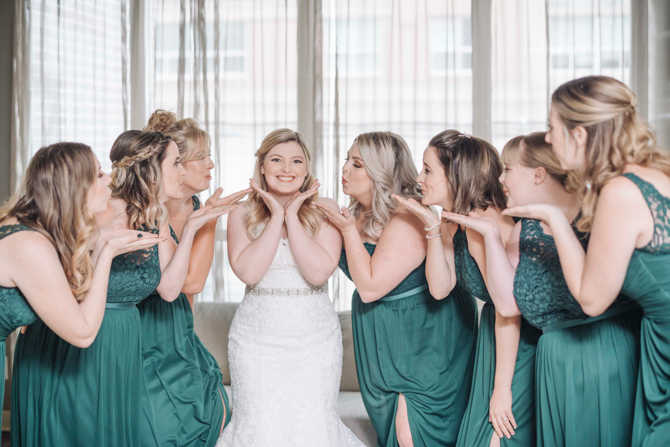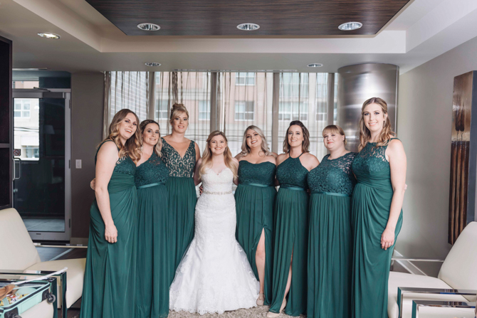 Danielle got ready at a downtown Toronto hotel with her bridesmaids doing her hair and make-up and pouring the ch ampagne. She had prepared gifts of personalized glasses for her bridal party in the emerald green color theme. In the room, we captured pretty photos of all the girls excited about the day ahead.