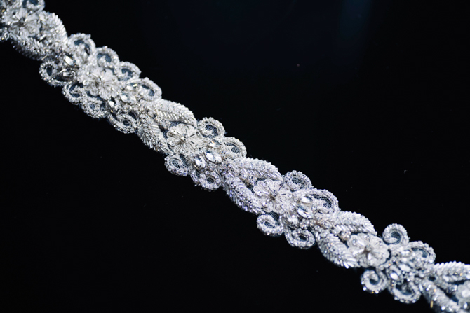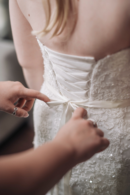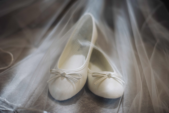 Danielle wore an elegant cream strapless gown with intricate lace and beading details. For her accessories, she choose crystal jewelry and white ballet flats to stay comfortable and pretty. A pretty bouquet of fresh white flowers and greenery made the bridal look complete.