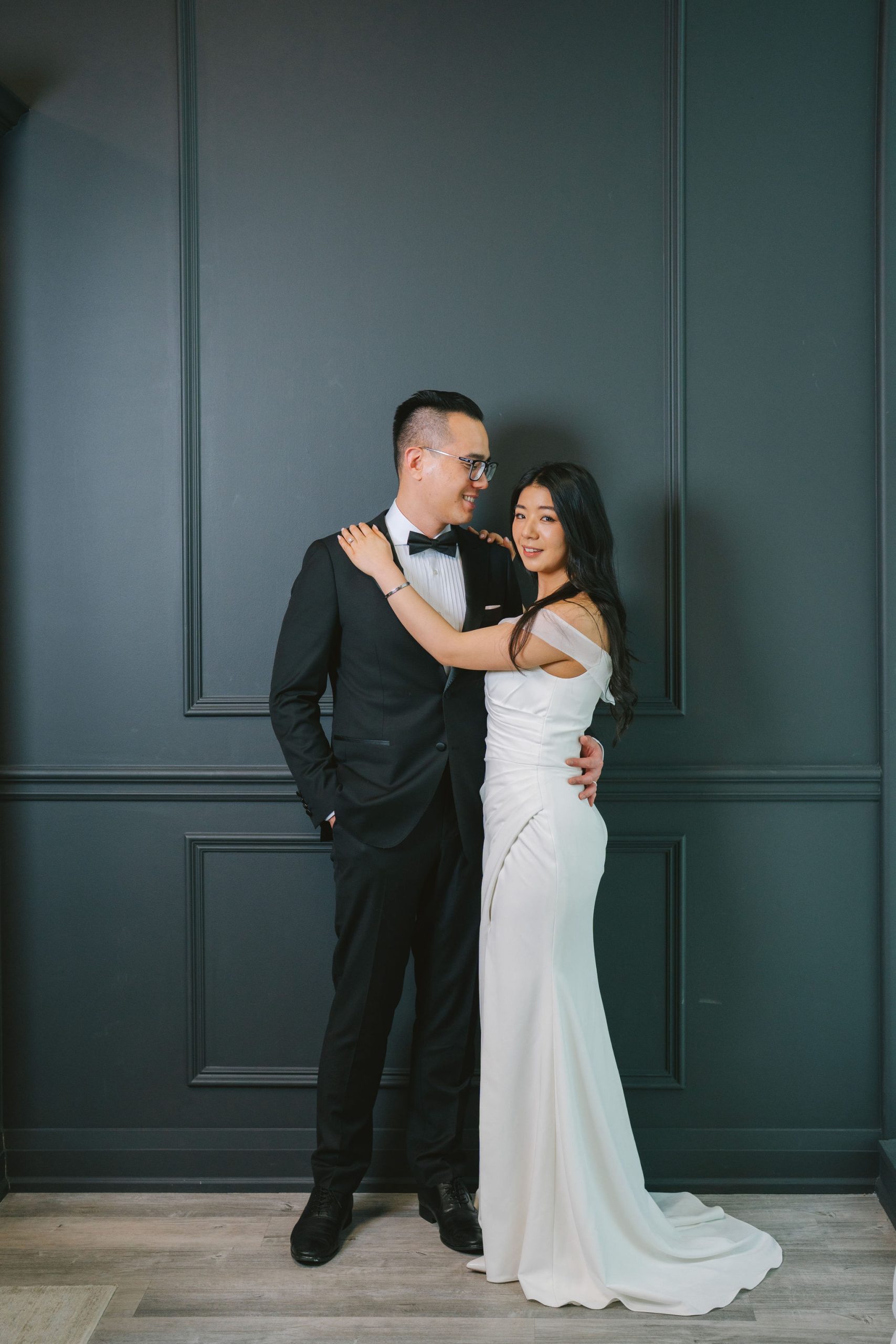 I had them begin the session at a black wall with a dado rail. I softened the LED light, so that it didn’t look too harsh on them, and it didn’t reflect from the wall. Wesley and Charmaine started simple. They were standing next to each with their hands intertwined. From there, I suggested that they have more movement. It didn’t matter if my shutter was going off, I wanted them to keep repositioning themselves so that there was more variety in each of the shots.