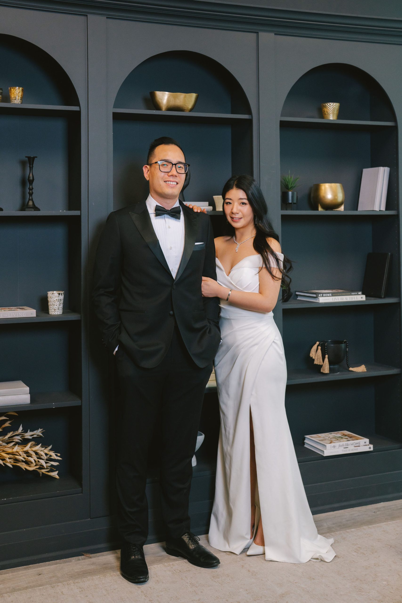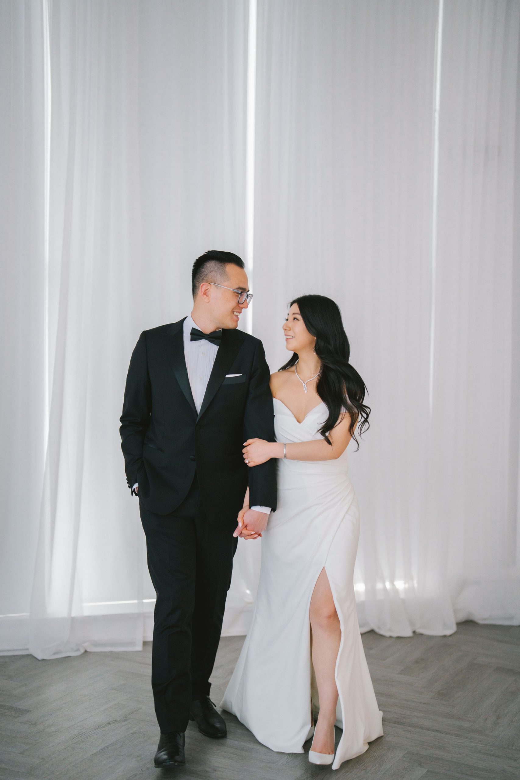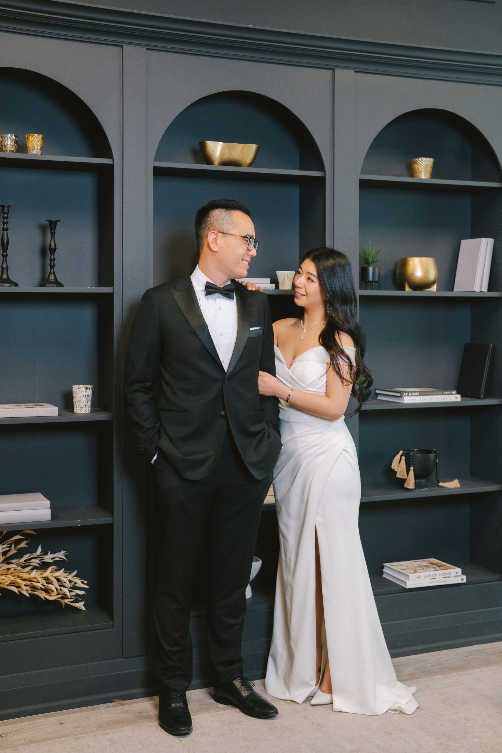 Wesley and Charmained booked the Glasshouse Studio for a few hours. This gave me more than enough time to collate all of my thoughts, and actualize them on the day itself. Charmaine had on this chic-looking dress with draping sleeves and a slit on the side. Her hair was in shiny, voluminous waves, and she accessorized with all the right, shiny gems to perfect her look.