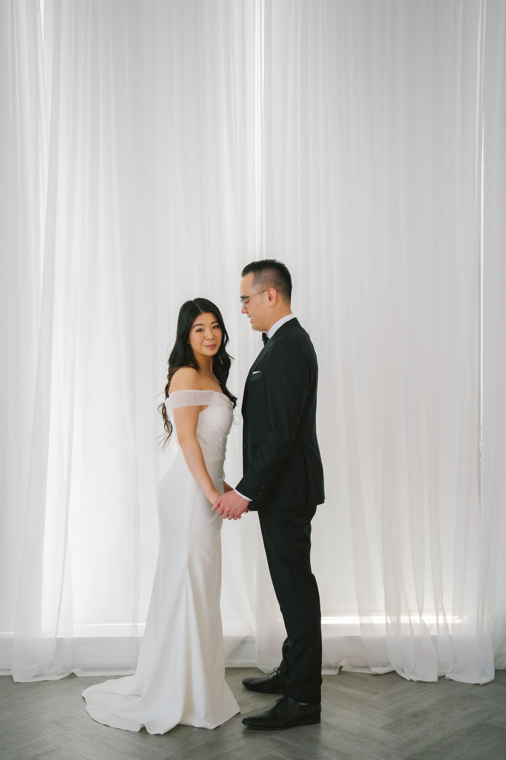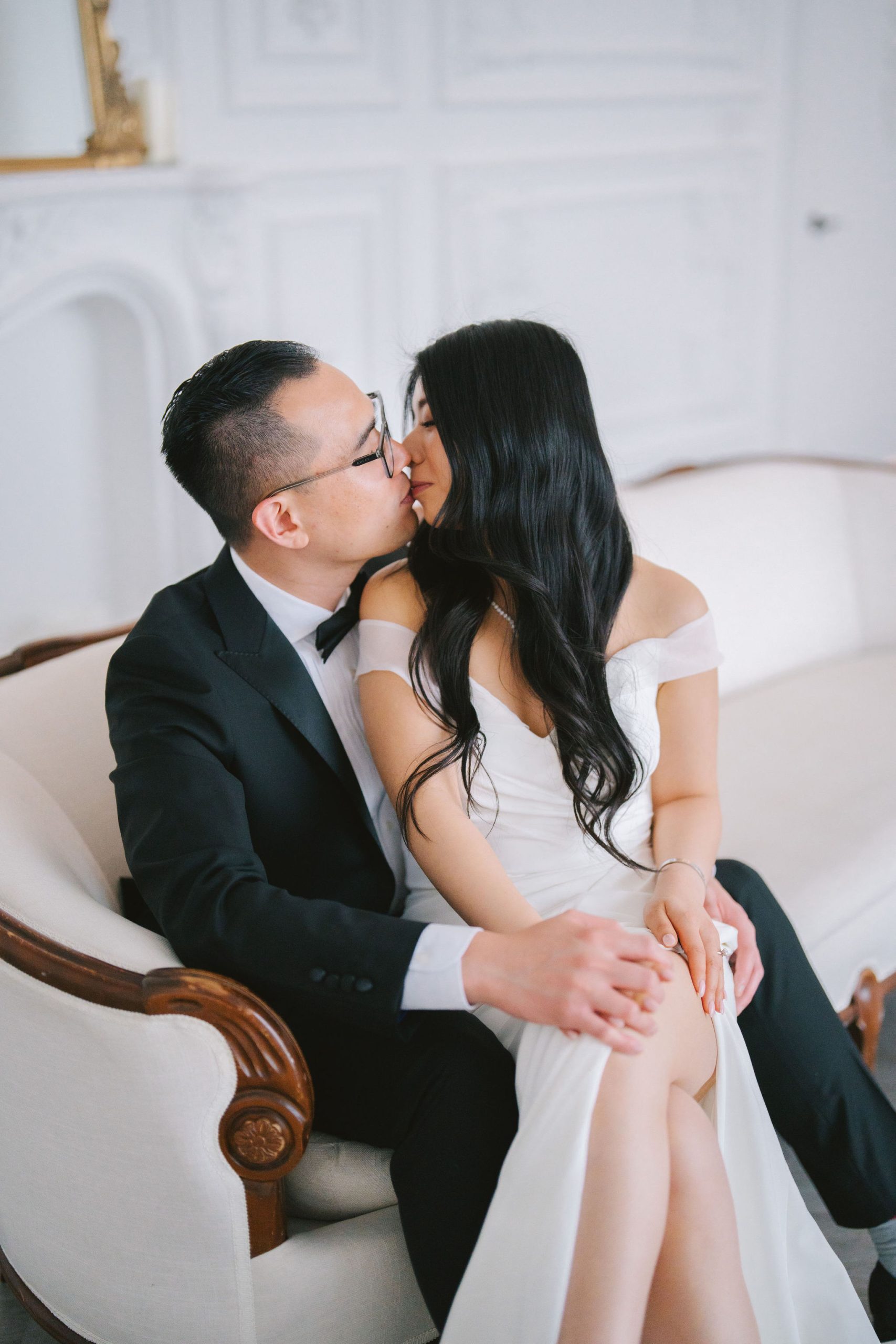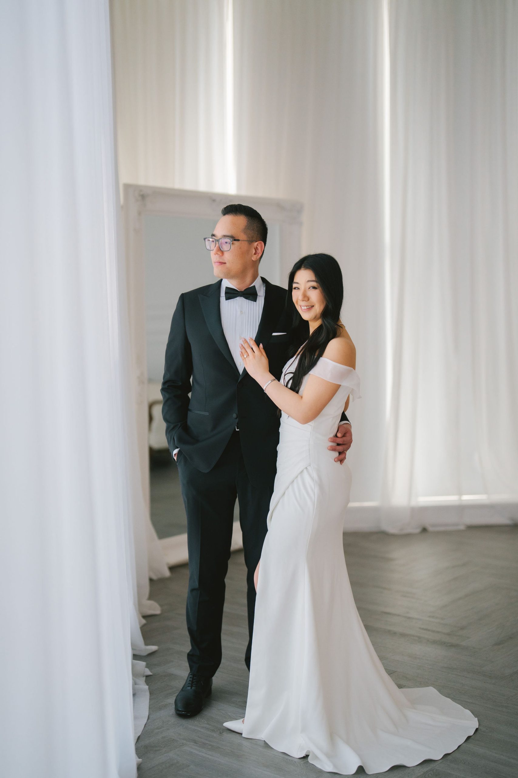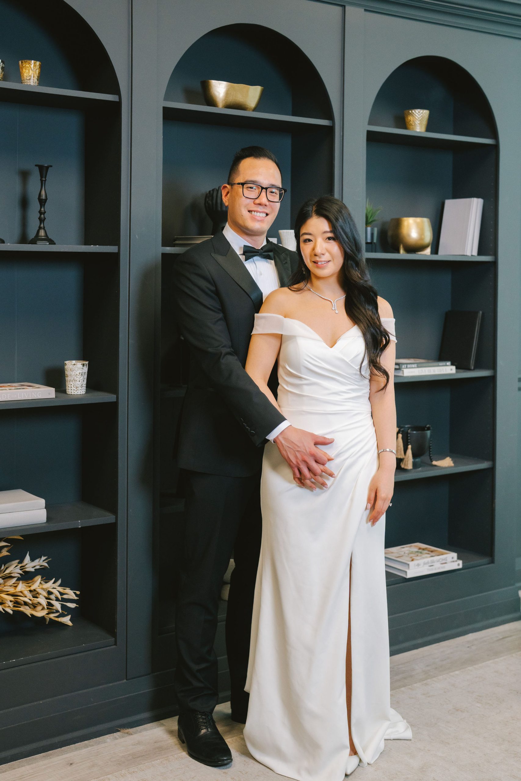 Wesley and Charmained booked the Glasshouse Studio for a few hours. This gave me more than enough time to collate all of my thoughts, and actualize them on the day itself. Charmaine had on this chic-looking dress with draping sleeves and a slit on the side. Her hair was in shiny, voluminous waves, and she accessorized with all the right, shiny gems to perfect her look.
